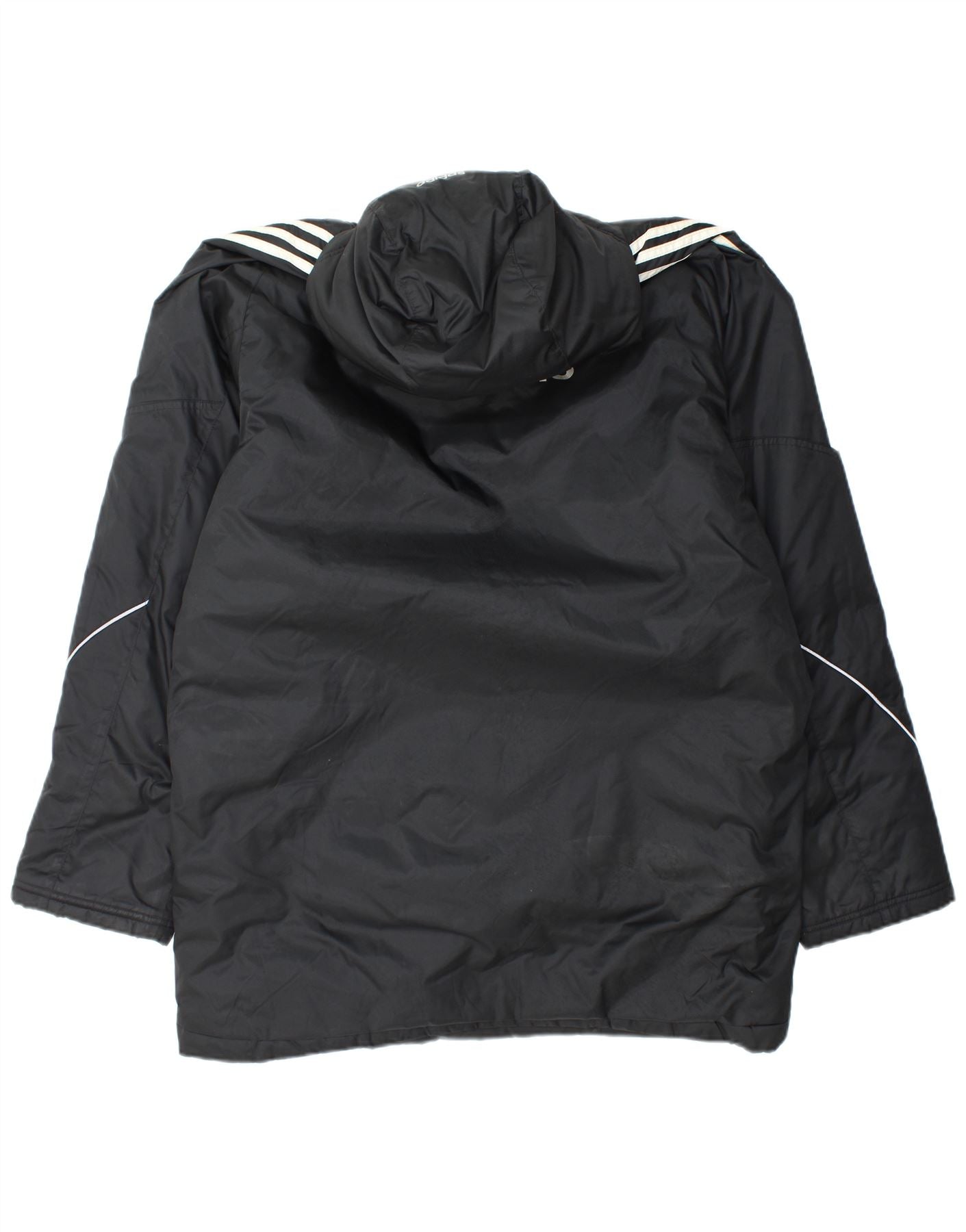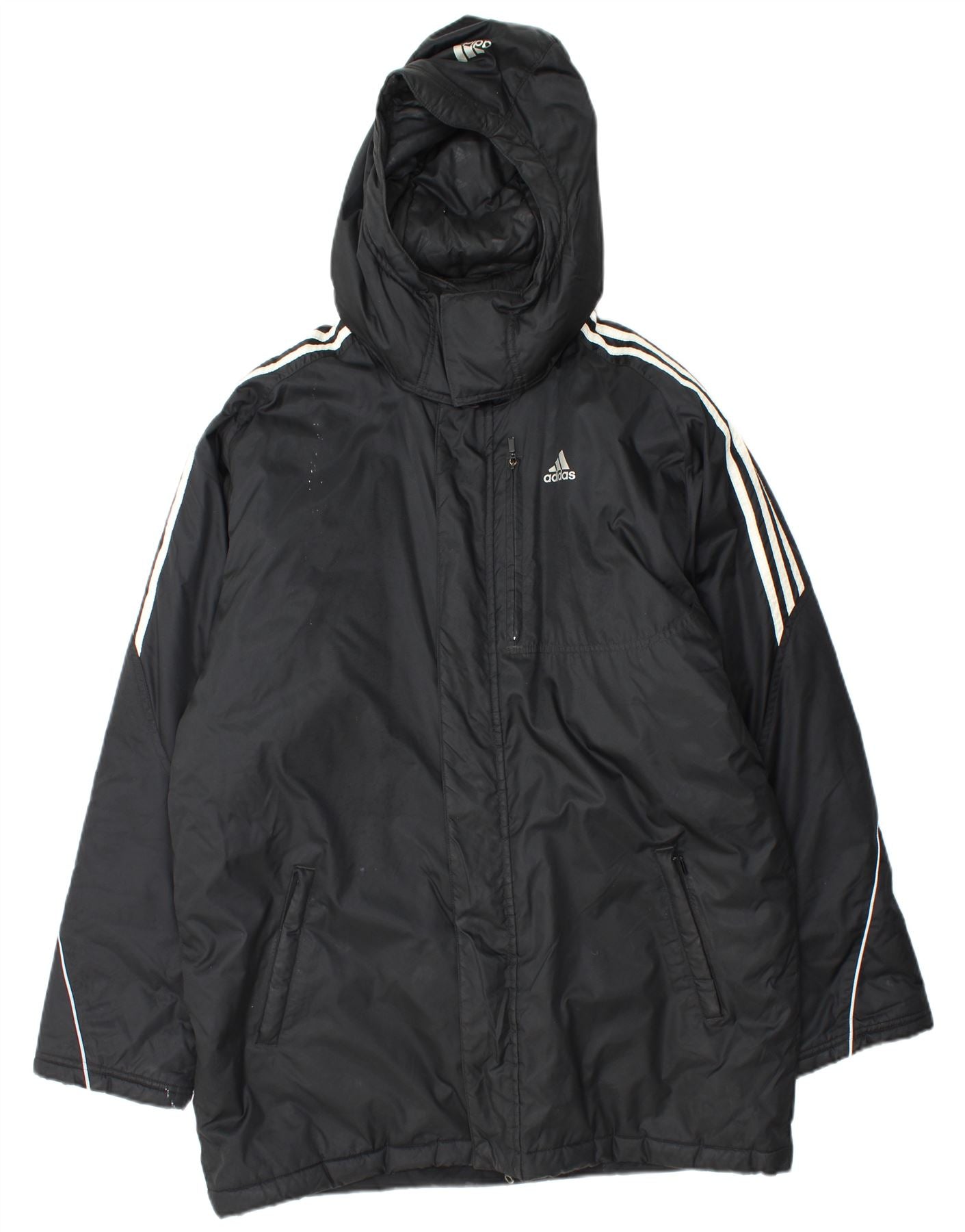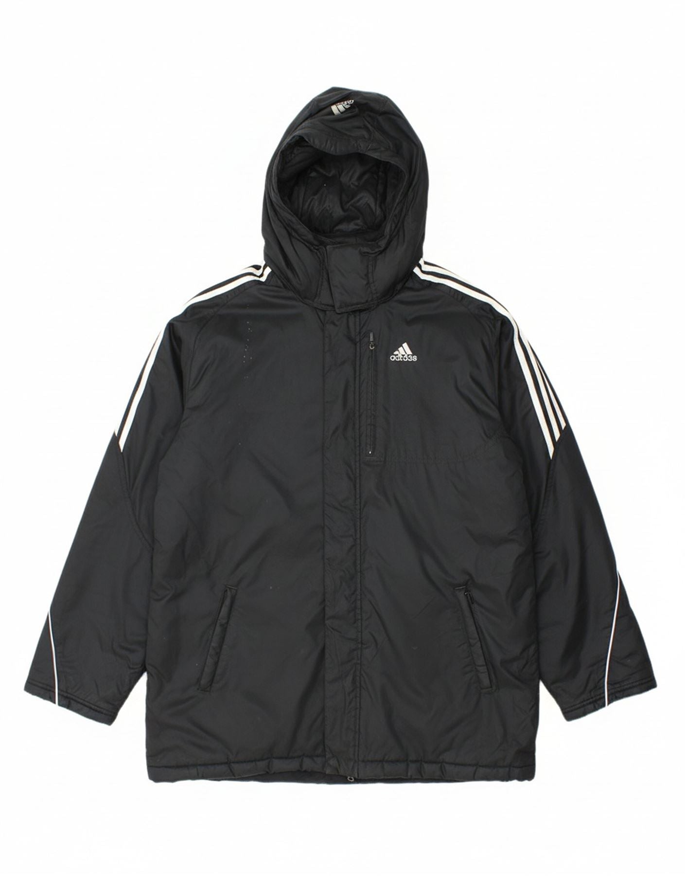 - AI Description: This Adidas mens padded jacket is crafted from a durable woven black fabric, offering warmth and protection. It features a high neck and a hooded design for enhanced coverage. A full zip closure secures the front, complemented by long sleeves and a regular fit for comfortable movement. Practical pockets are included. The jacket boasts water resistant and windproof properties, making it ideal for outdoor wear. A subtle Adidas logo adds a signature touch.