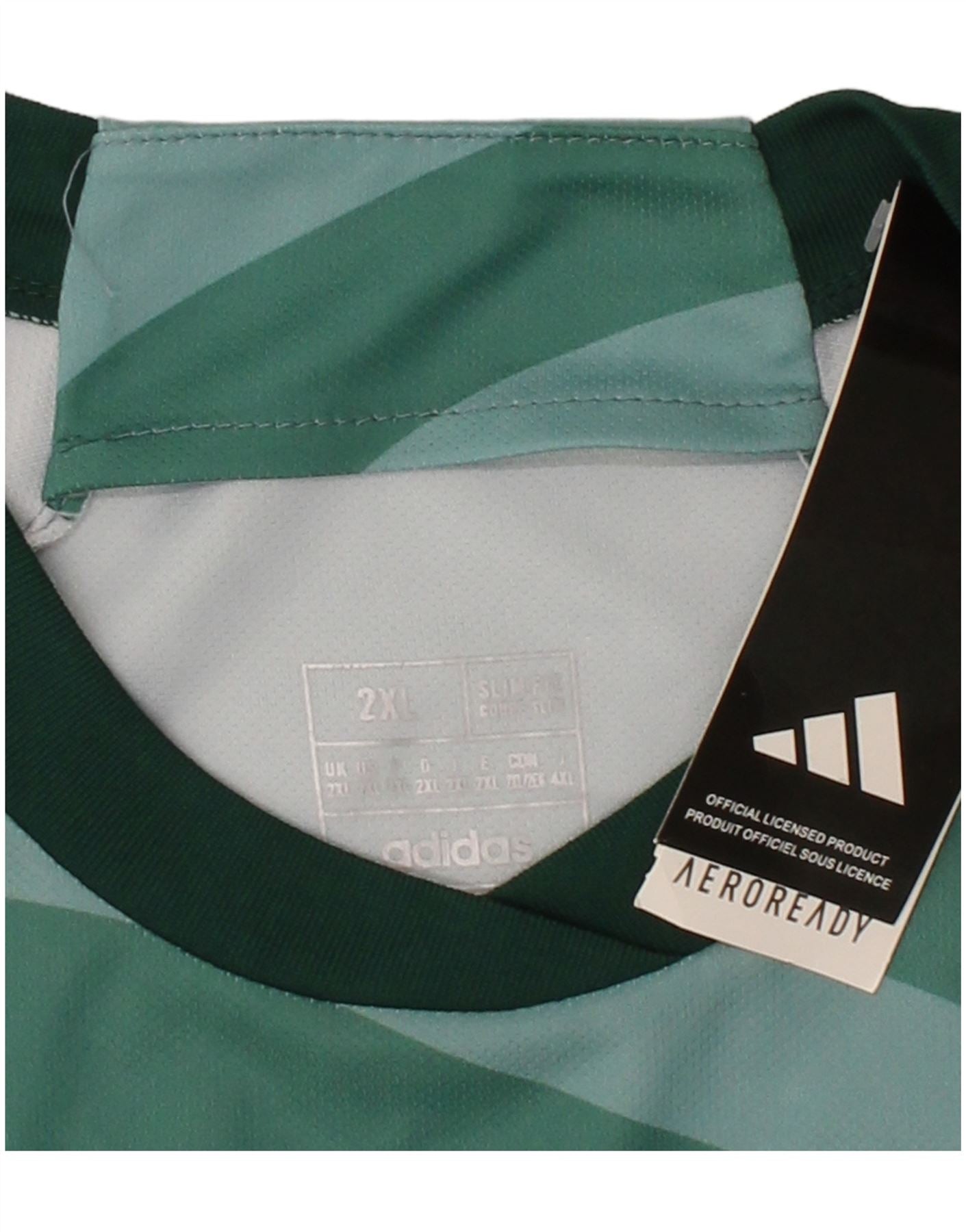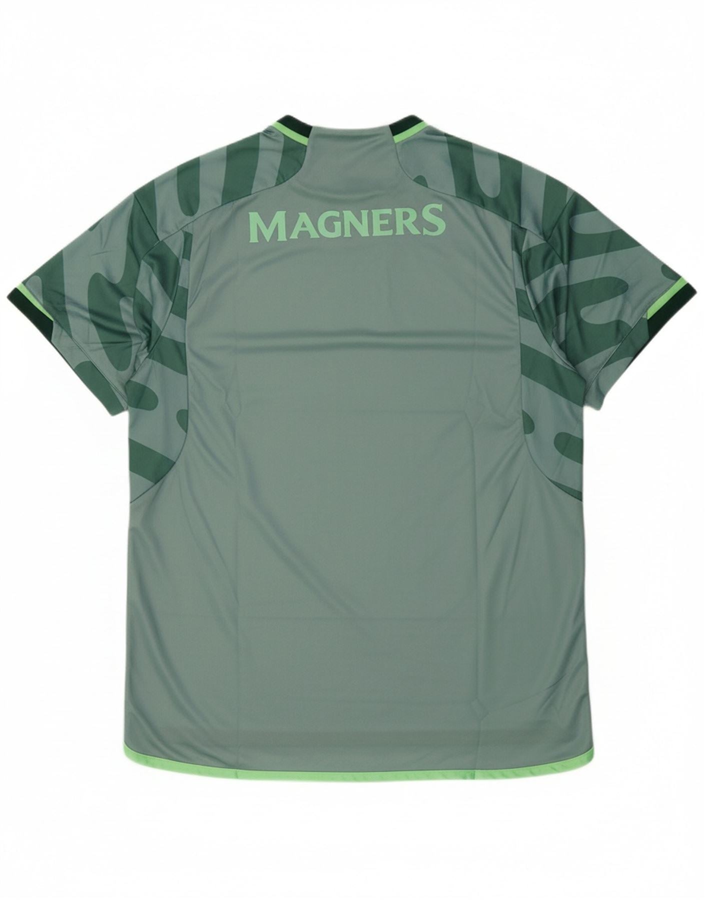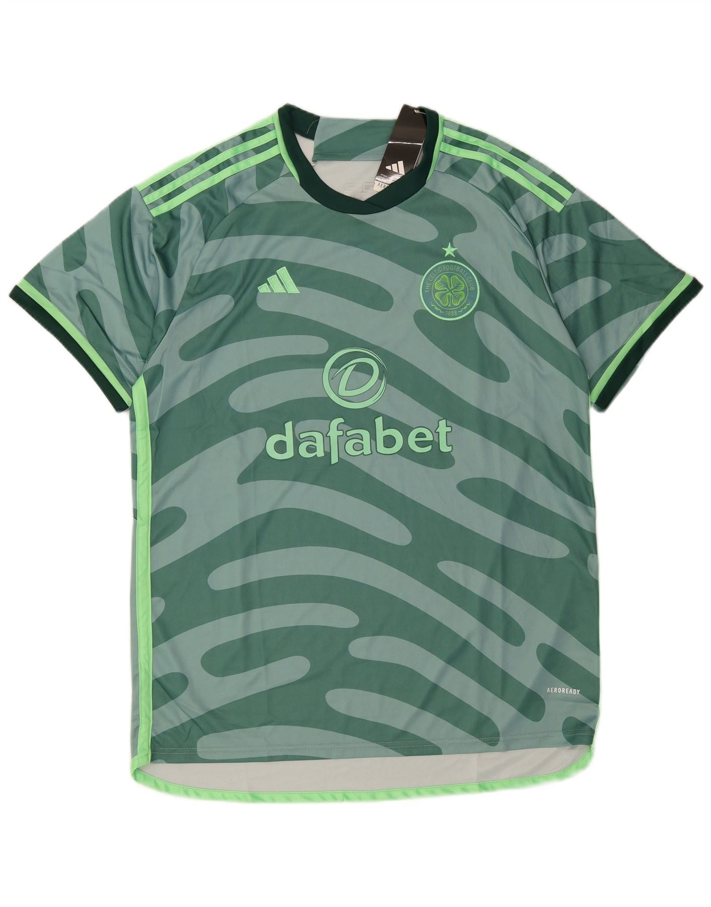 - AI Description: This Adidas mens Graphic T-Shirt Top is crafted from a lightweight, breathable green knit fabric. It features a classic round neck and short sleeves for comfortable wear. The regular fit ensures ease of movement. A distinctive camouflage pattern covers the design, complemented by an embroidered Celtic FC logo. This performance top combines sporty style with practical features, ideal for football enthusiasts.