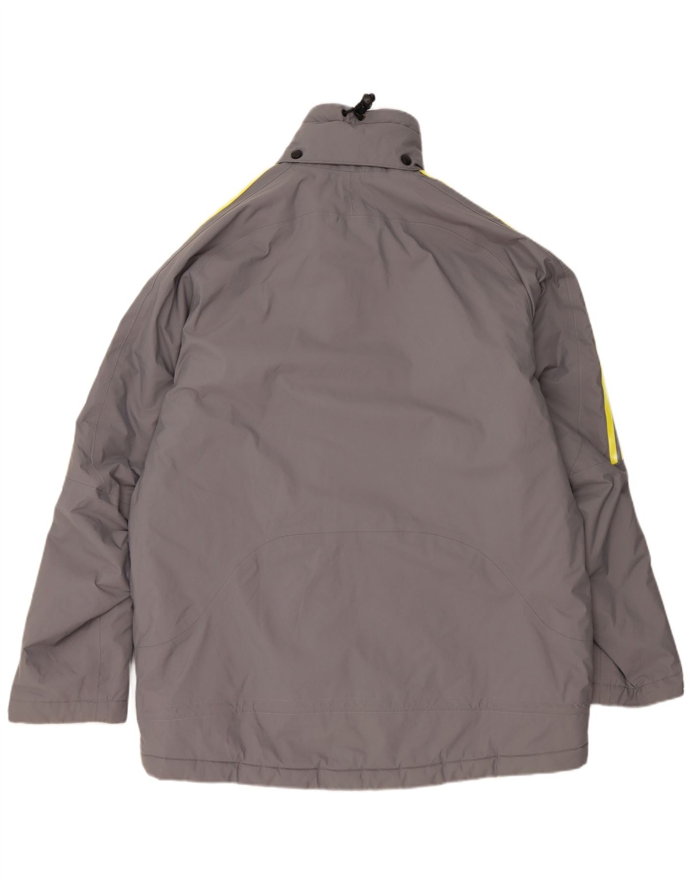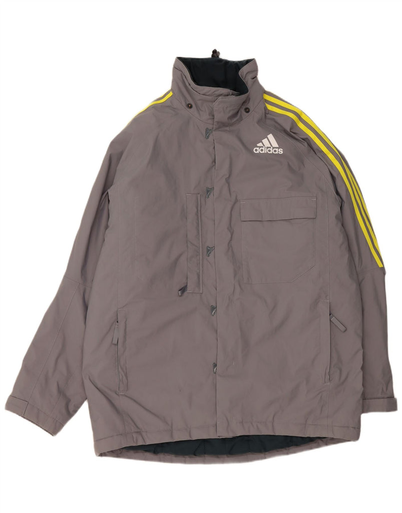 - AI Description: This Adidas mens padded jacket is crafted from durable grey polyester, offering a windproof finish. It features a high neck and a full zip closure for secure warmth. Long sleeves and a regular fit ensure comfortable movement. The design includes practical pockets and a protective hood. A subtle logo accent completes this sporty, functional piece.