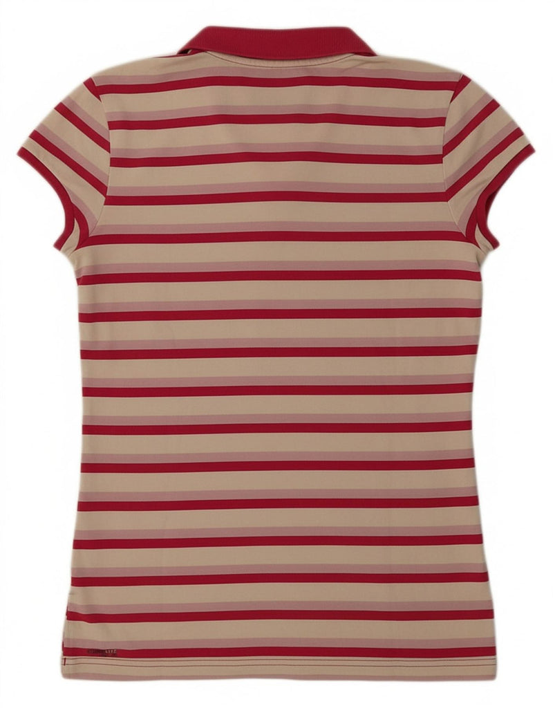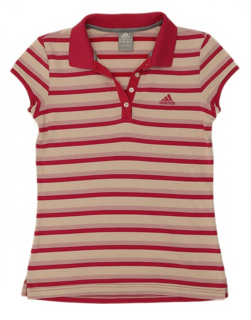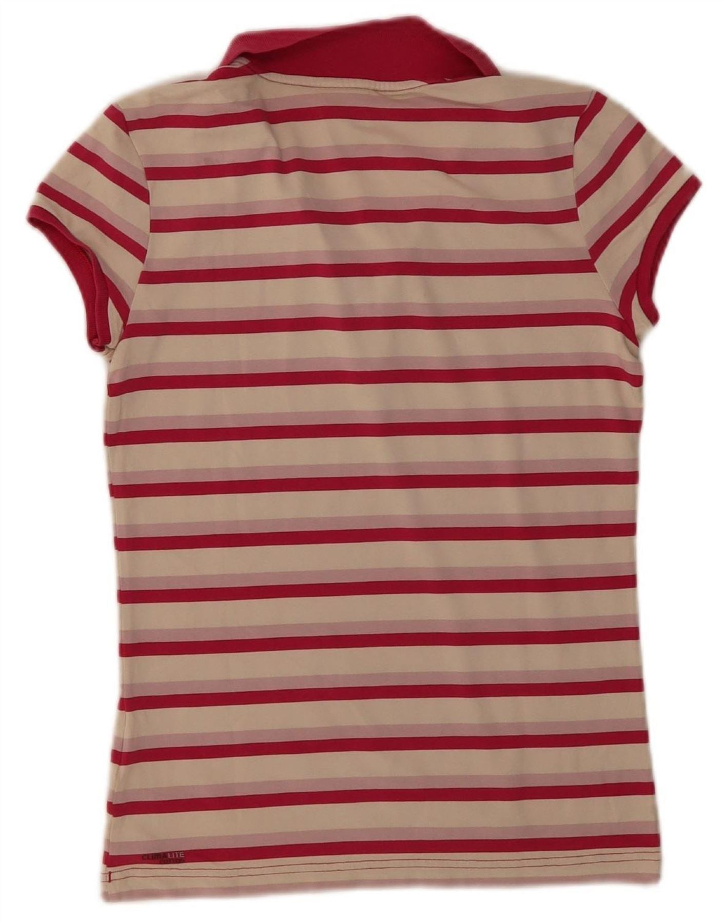- AI Description: This Adidas women's shirt is crafted from a soft knit fabric, offering exceptional comfort. It features a vibrant striped pattern in multicoloured hues, including red, off white, and beige. The shirt presents a classic collared neckline and practical short sleeves. A neat button-up front provides a clean closure. Designed with a regular fit, it ensures ease of movement. A subtle Adidas logo adds a signature athletic accent. This versatile shirt is perfect for sports or everyday casual wear.