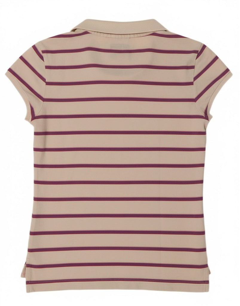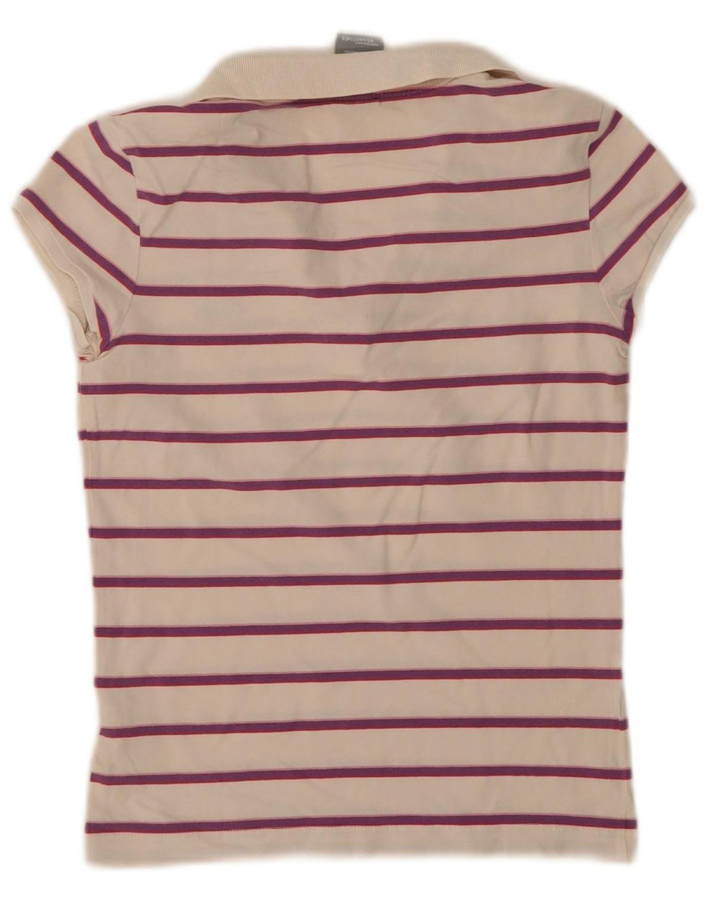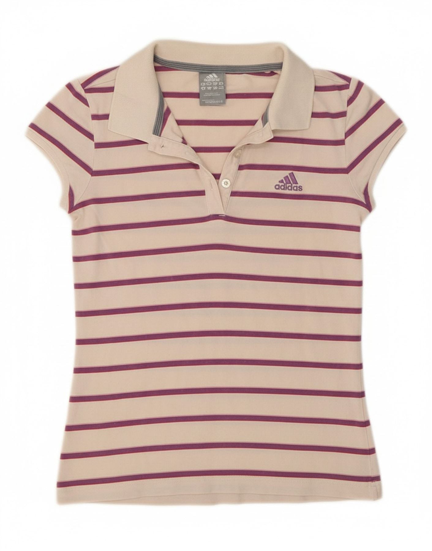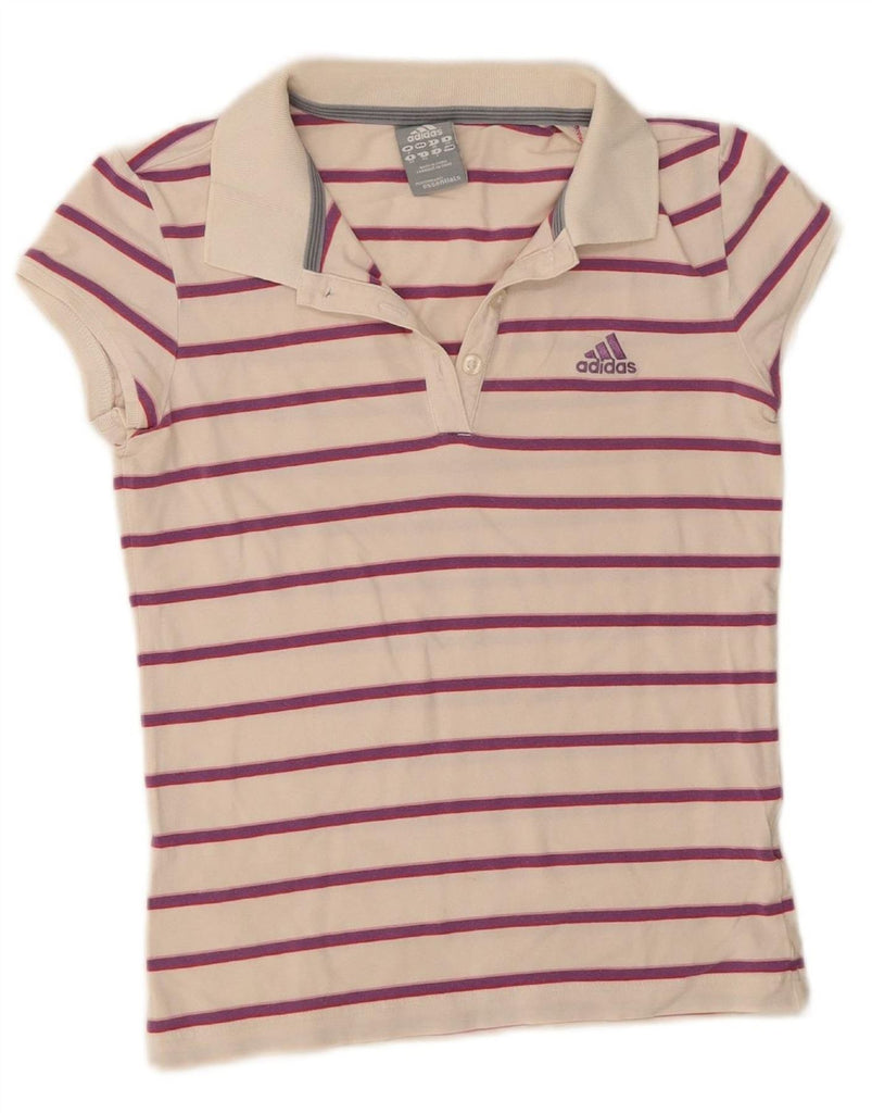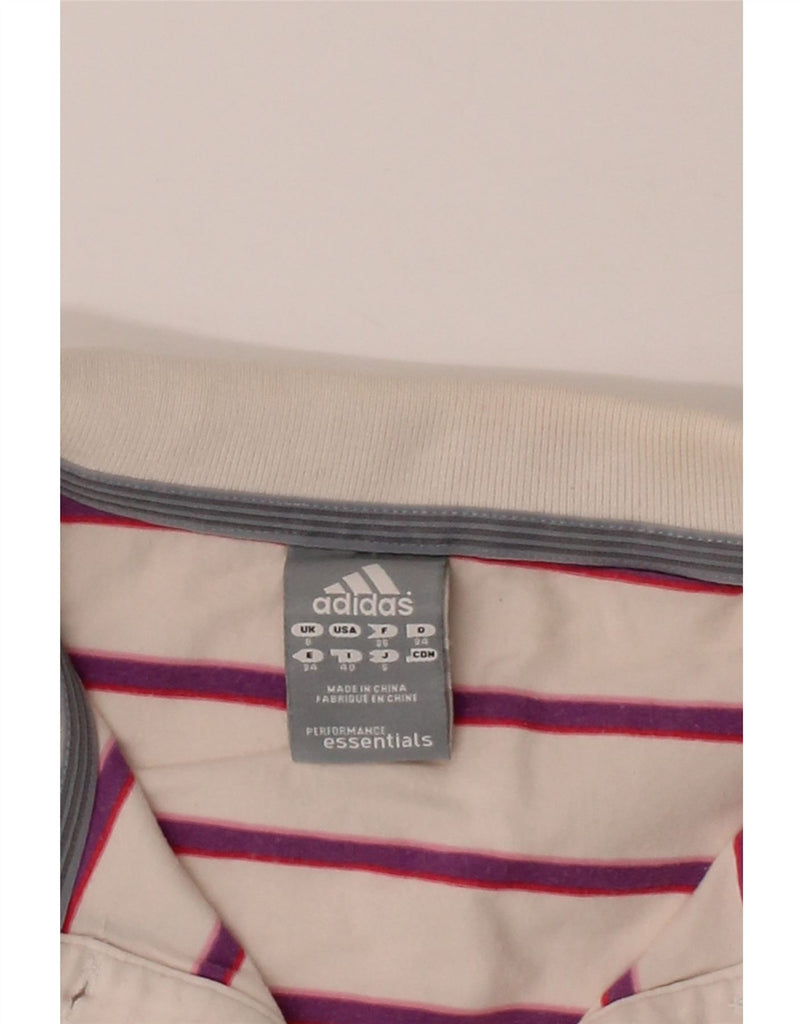 - AI Description: This Adidas womens T-shirt top is crafted from soft off-white jersey, offering a comfortable and breathable feel. It features a collared neckline and short sleeves, giving a classic silhouette. The button closure provides a neat finish to the design. A subtle striped pattern adds visual interest. The iconic Adidas logo provides a recognisable accent, completing this regular fit top.