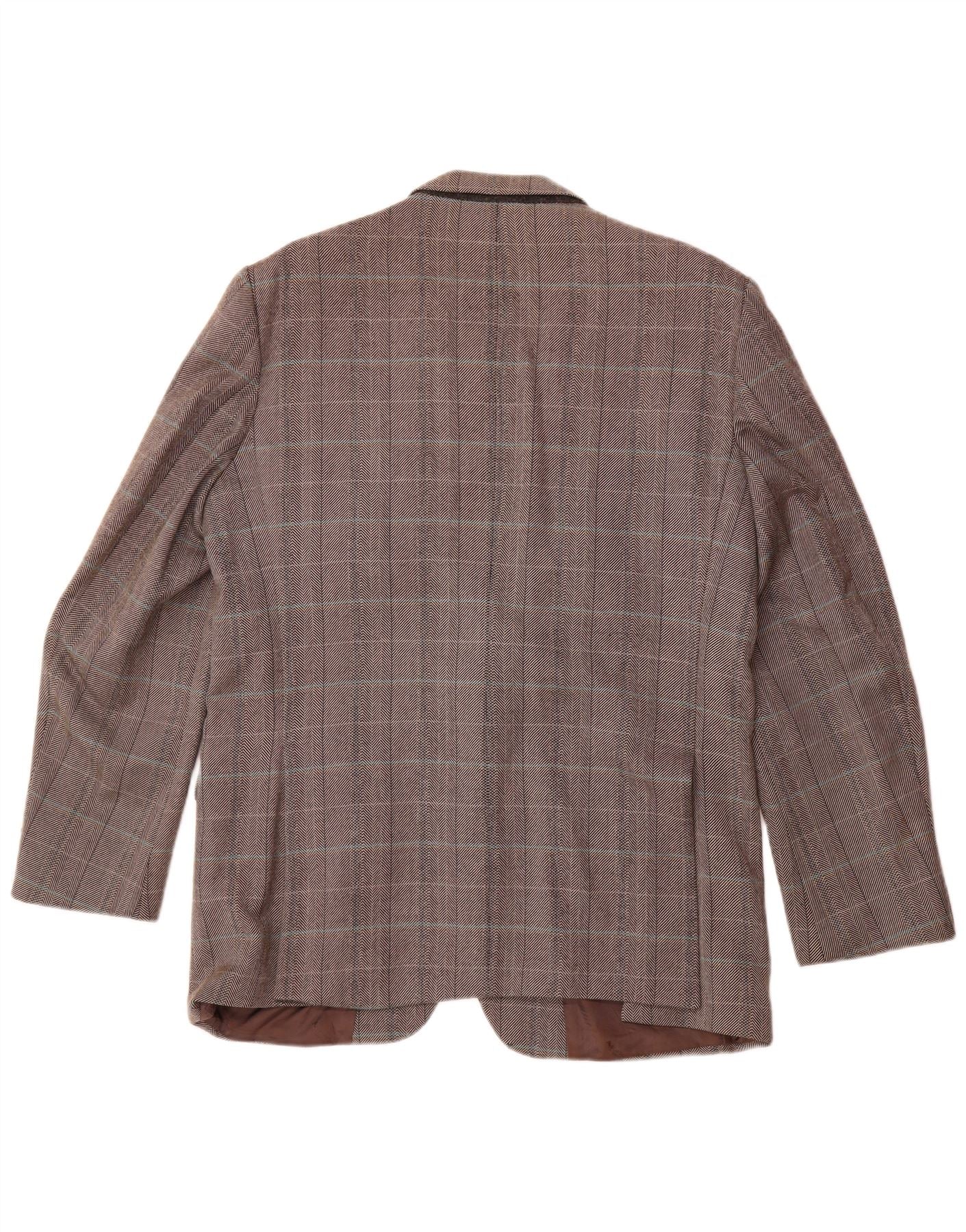 - AI Description: This Aquascutum mens blazer jacket is crafted from luxurious pure new wool tweed. It features a classic brown plaid pattern. The collared neckline and two-button front offer a timeless, refined look. Long sleeves and a regular fit ensure comfort. Practical pockets and a full lining complete this classic style.