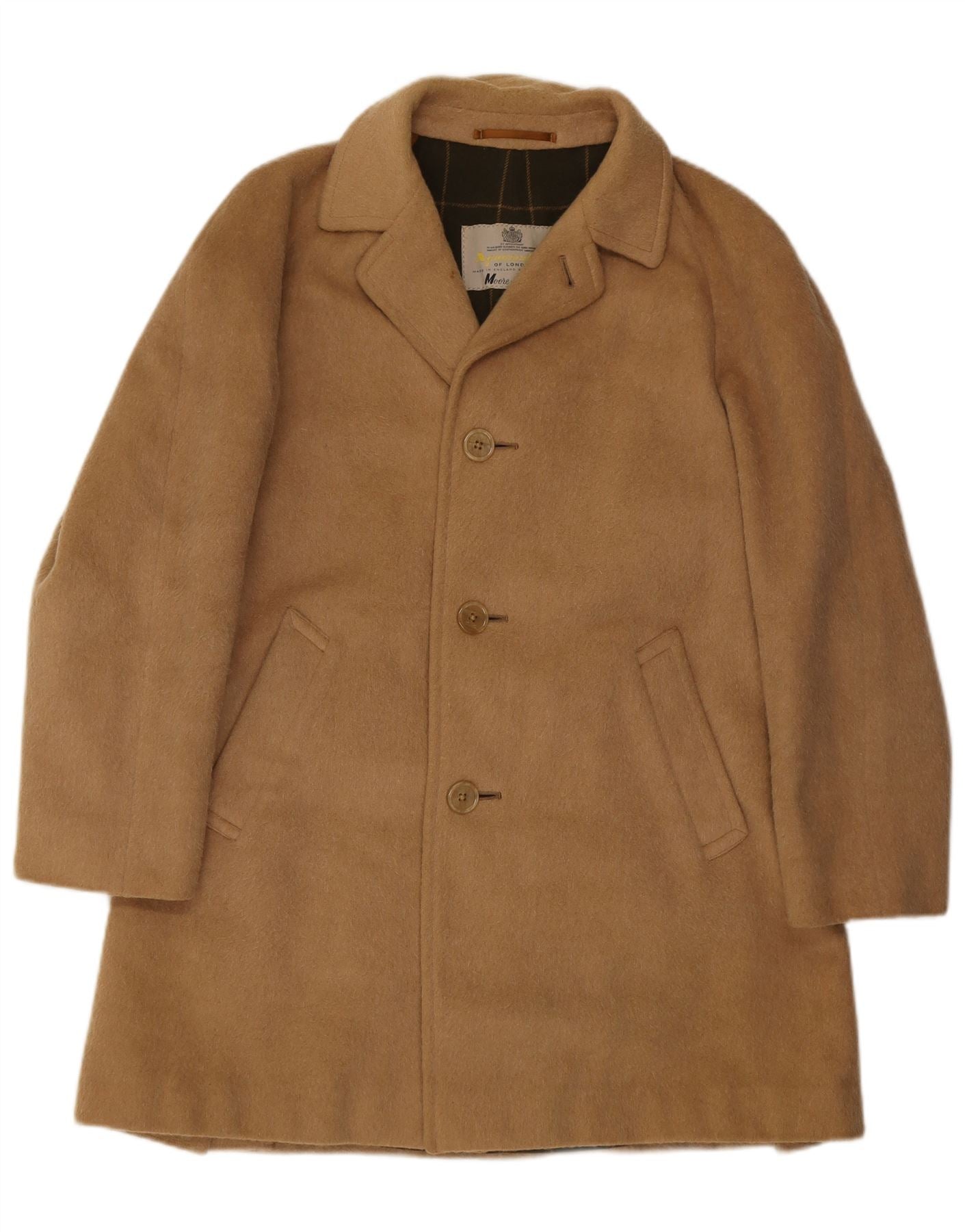 - AI Description: This Aquascutum mens overcoat is crafted from a classic woven fabric in a versatile beige hue. It features a collared neckline and a regular fit for timeless appeal. The long sleeves and button closure enhance its traditional silhouette. Fully lined and water resistant, it offers practical elegance. Functional pockets complete this classic design.