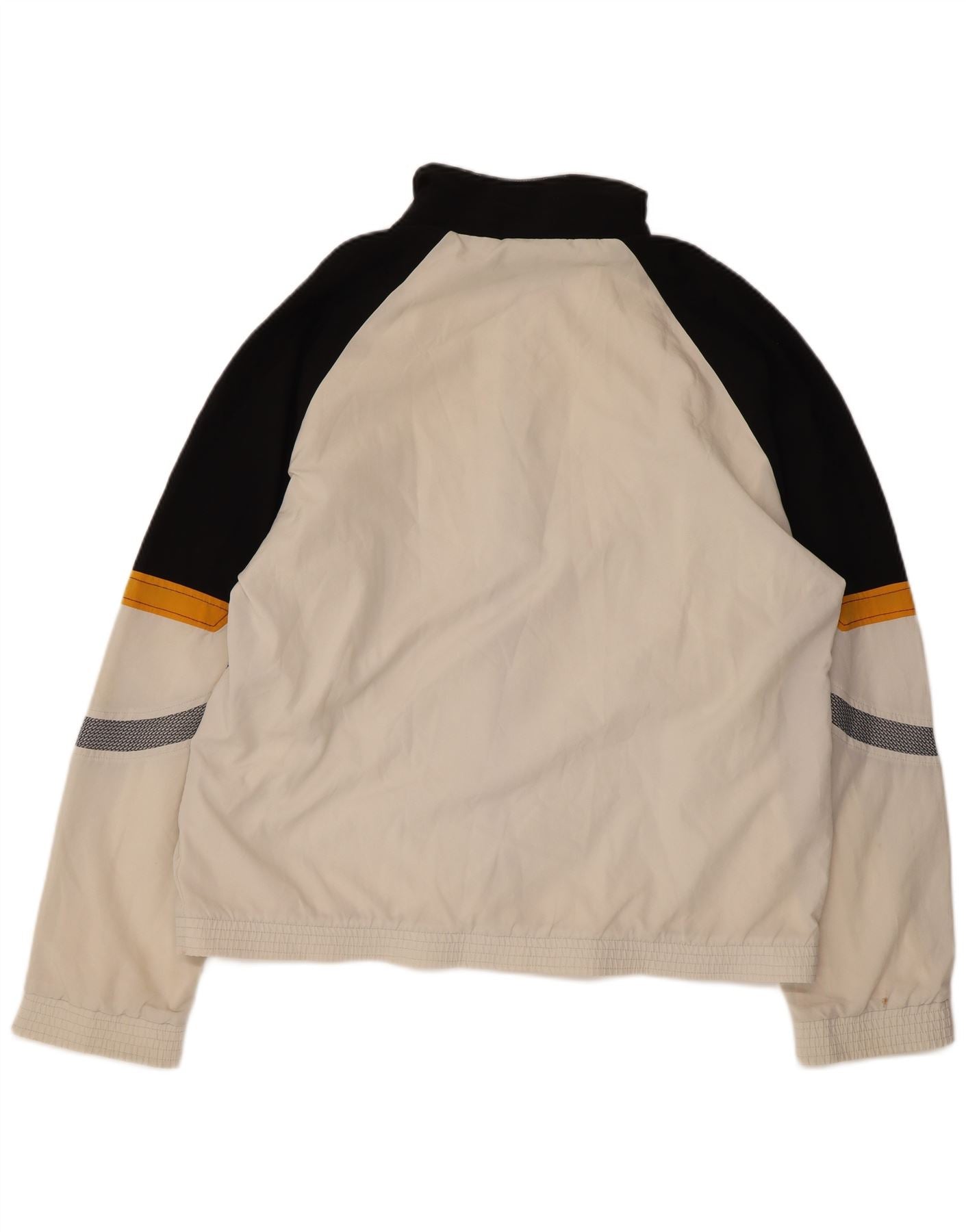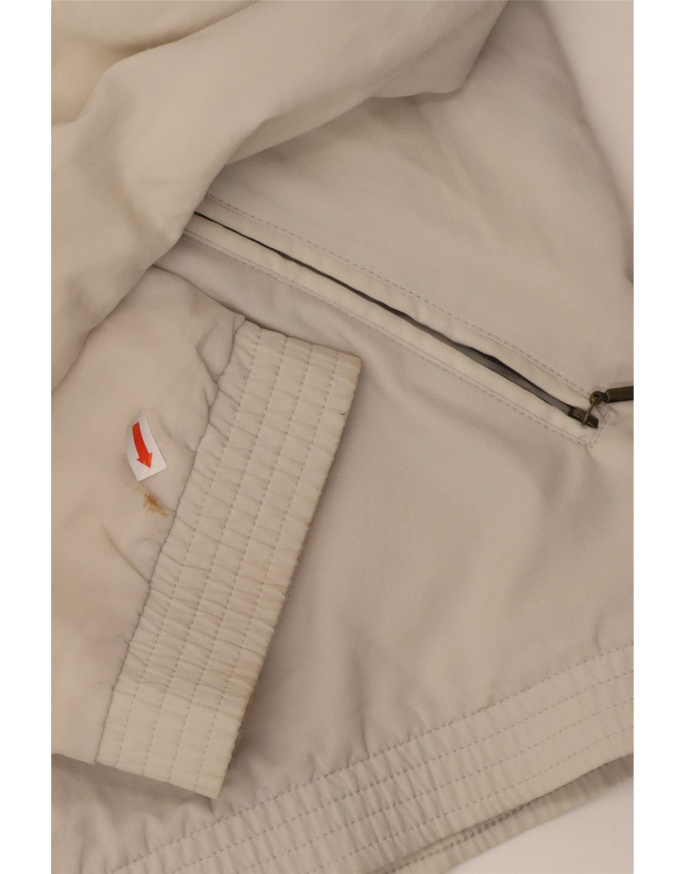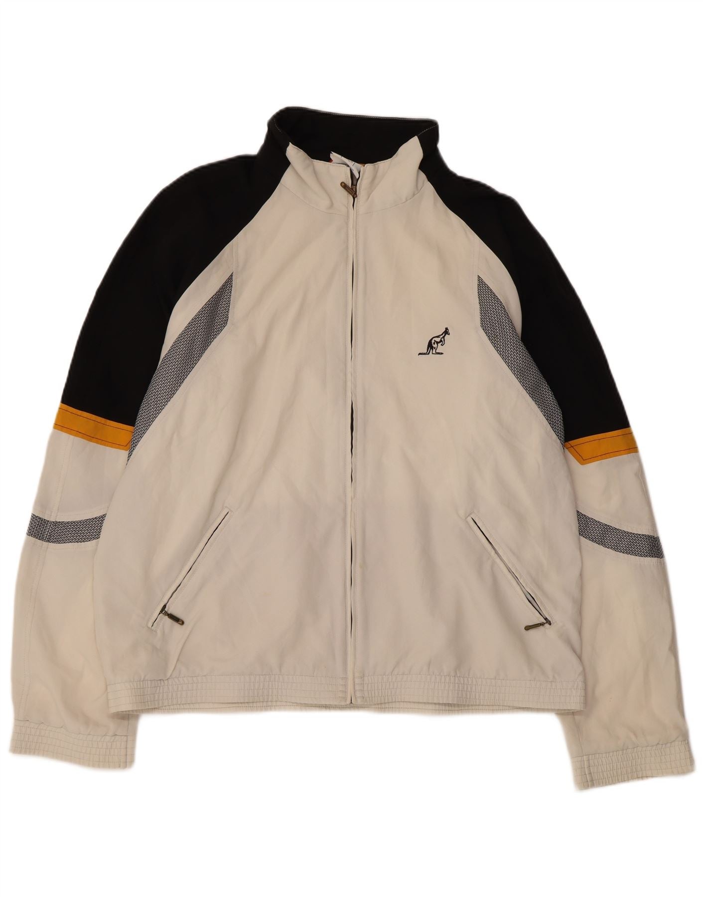 - AI Description: This Australian mens tracksuit top jacket is crafted from lightweight, off white woven polyester. It features a collared neckline and a full zip closure. An abstract pattern adds visual interest. Long sleeves and a regular fit ensure comfort. Zipped pockets provide practicality. A subtle logo accent completes the design.