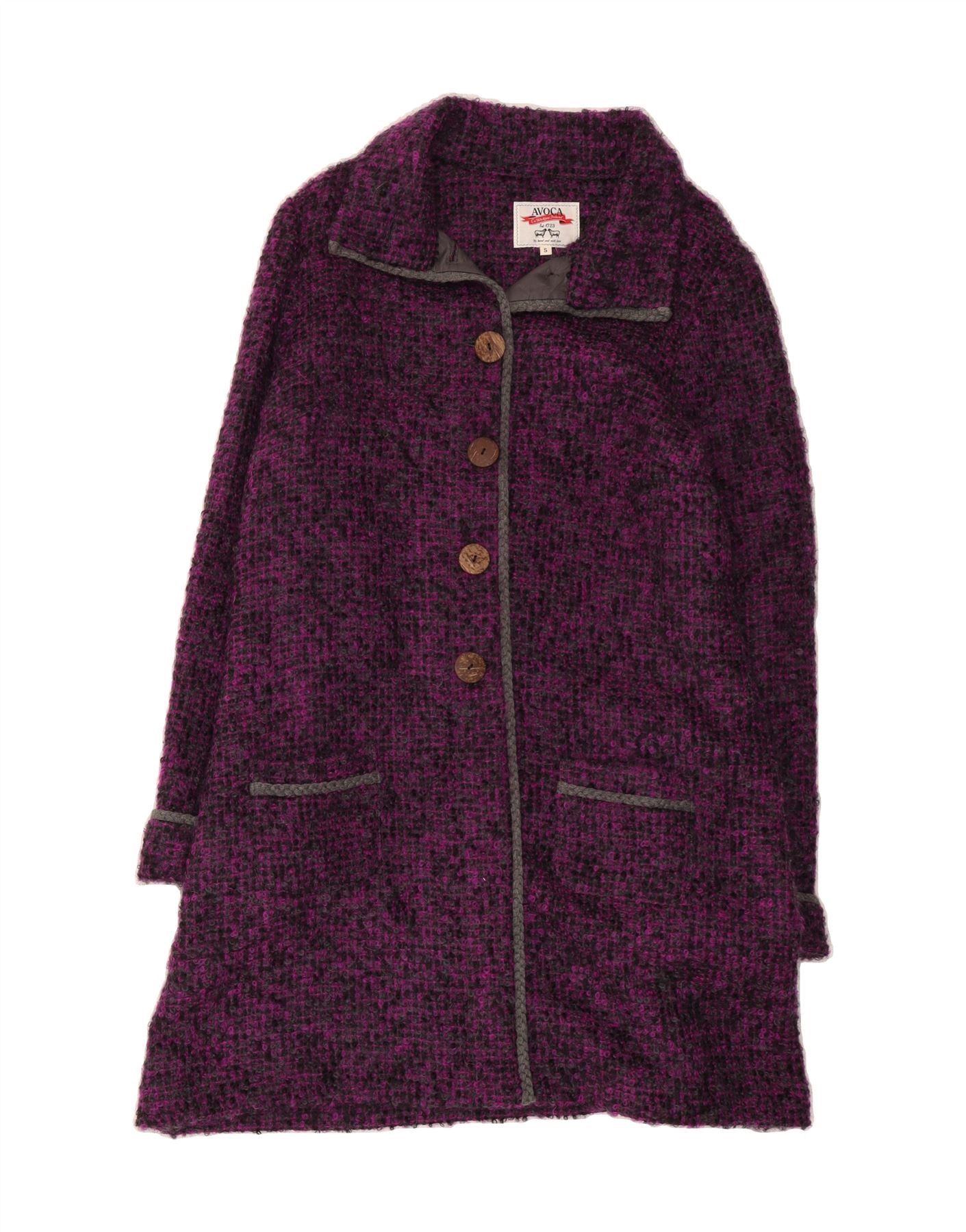 - AI Description: This pre-owned Avoca coat offers classic style in a vibrant purple tweed. Featuring an abstract pattern and a comfortable regular fit, this women's coat is both eye-catching and practical. The design incorporates a collared neckline, long sleeves, and button closure. Functional pockets and a full lining add to the appeal. Accentuated with button detailing, this coat is in excellent condition.