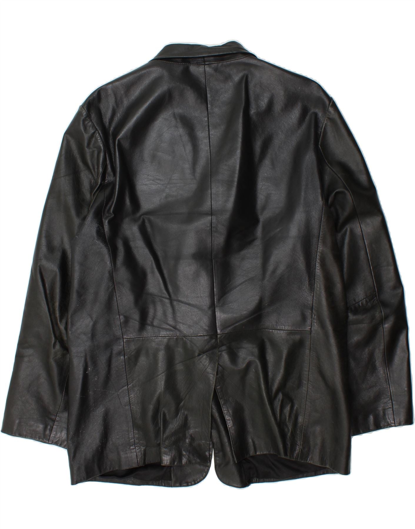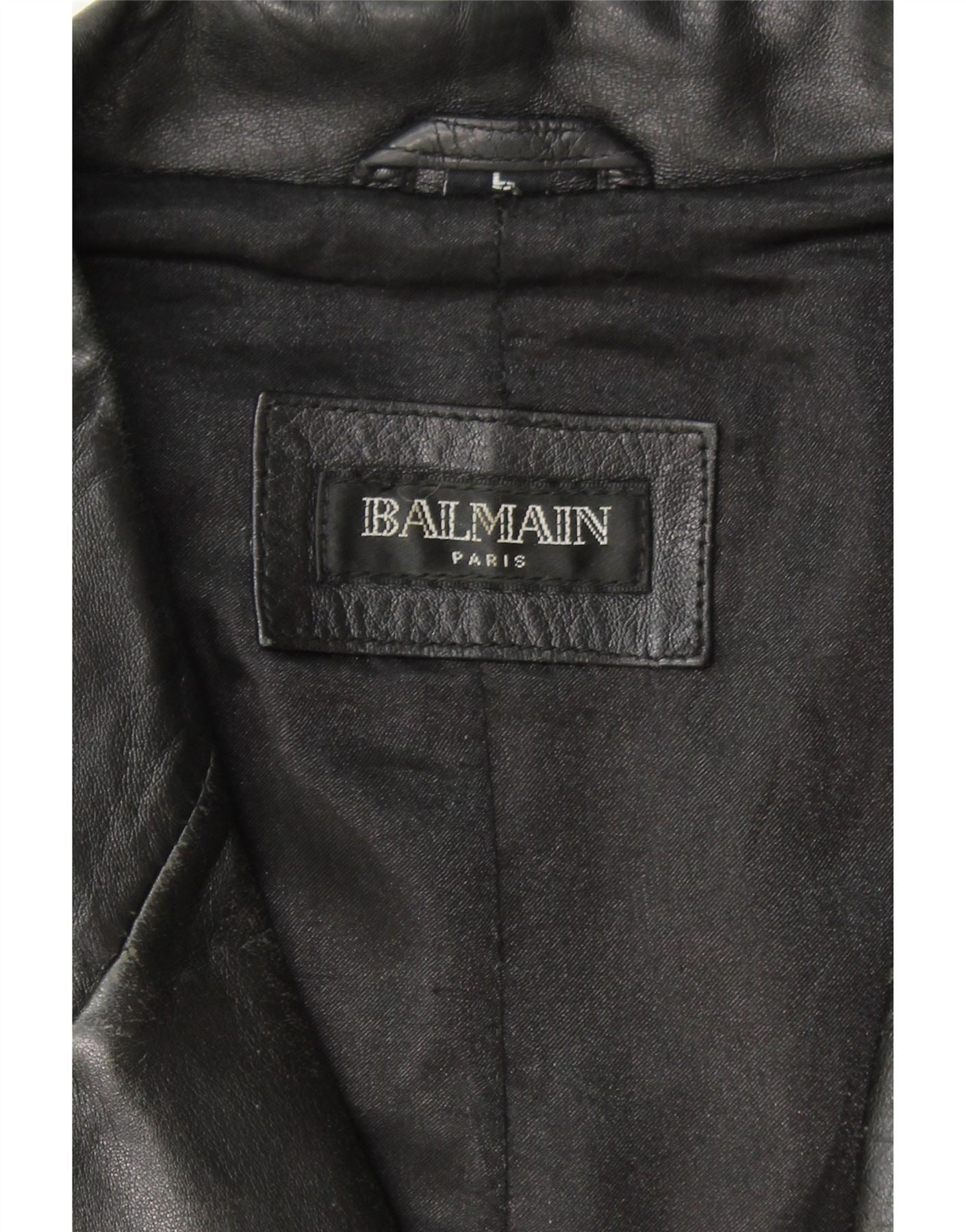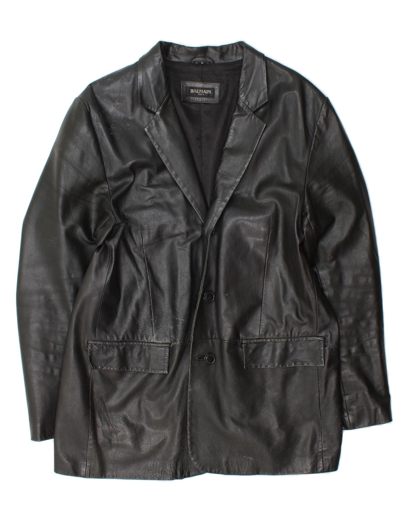 - AI Description: Balmain classic black leather blazer jacket for men. Crafted from high-quality leather, this lined jacket features a button closure, regular fit, and practical pockets. The design is accented with buttons. Pre-owned in good condition, it shows moderate visible wear, with scuff marks and creases on the leather. Size L.