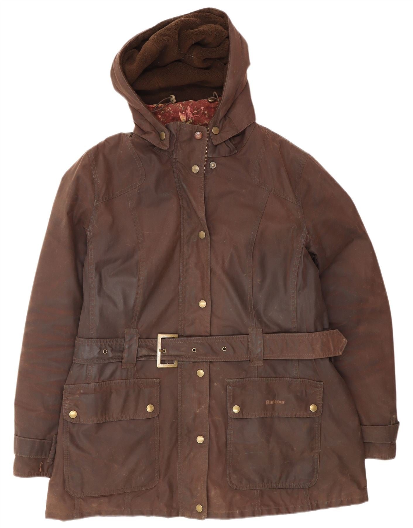 - AI Description: This Barbour womens waxed cotton jacket is crafted from durable brown waxed cotton, offering a classic finish. It features a collared neckline and long sleeves. The regular fit ensures comfortable wear. A practical hood and belted waist add functional style. Button and zip closures secure the front. Multiple pockets and buckle accents complete the timeless design.