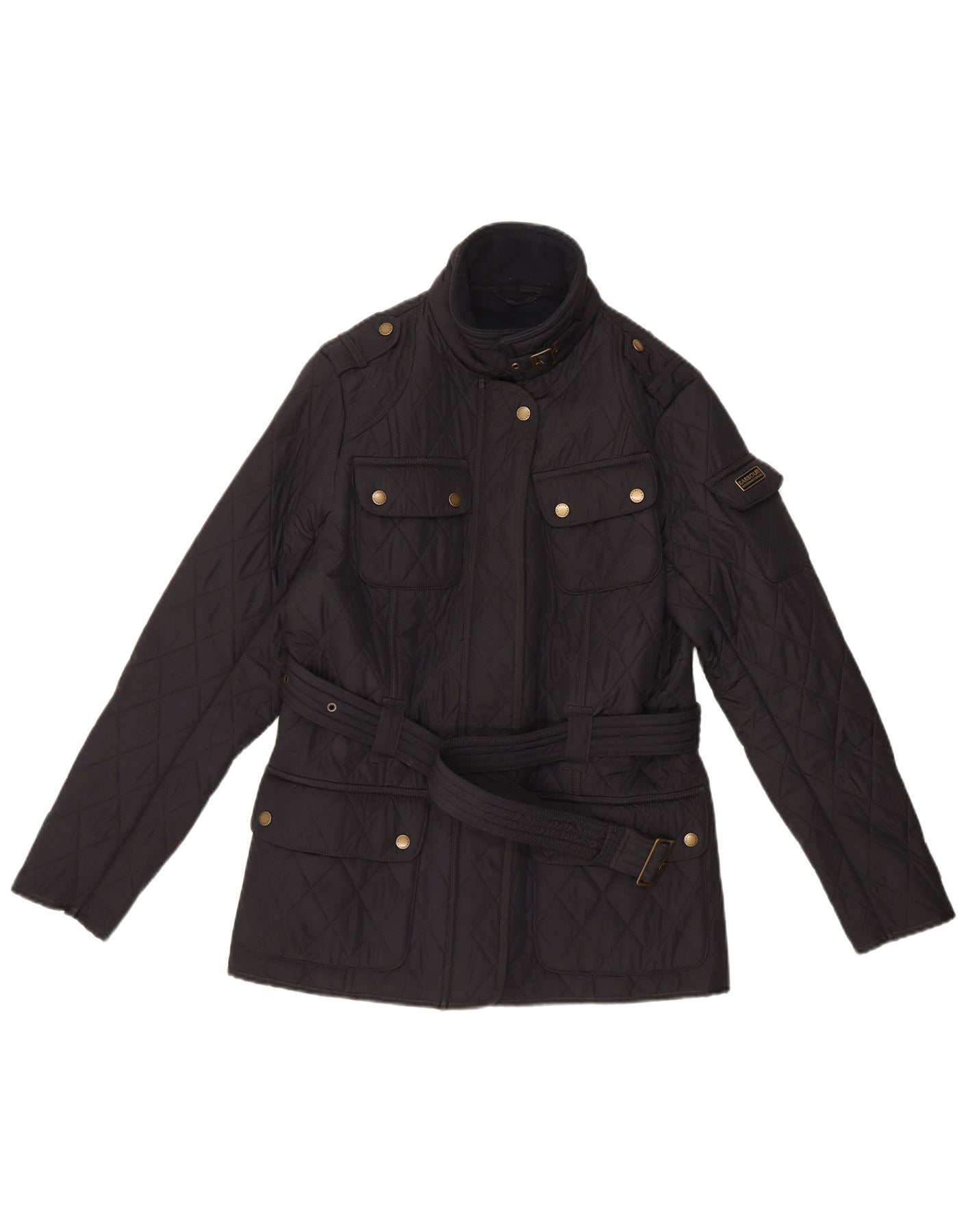 - AI Description: This Barbour womens quilted jacket is crafted from a woven fabric in classic black. Its quilted design adds texture and warmth. It features a collared neckline and long sleeves. The regular fit offers comfortable wear. A full zip closure secures the front. Practical pockets provide storage. A belted waist enhances the silhouette. The biker style gives it a contemporary edge.