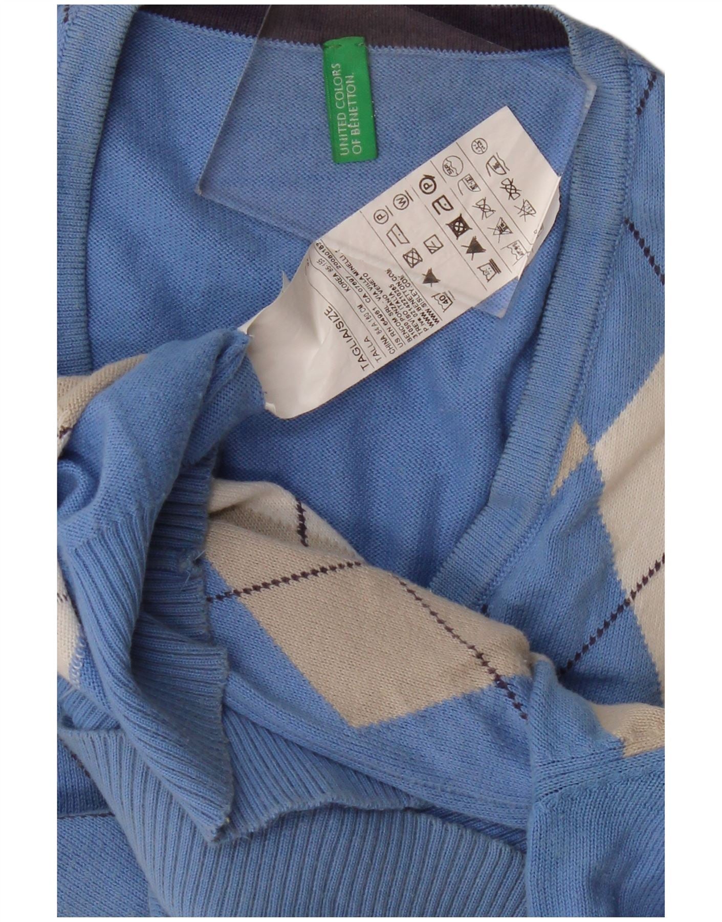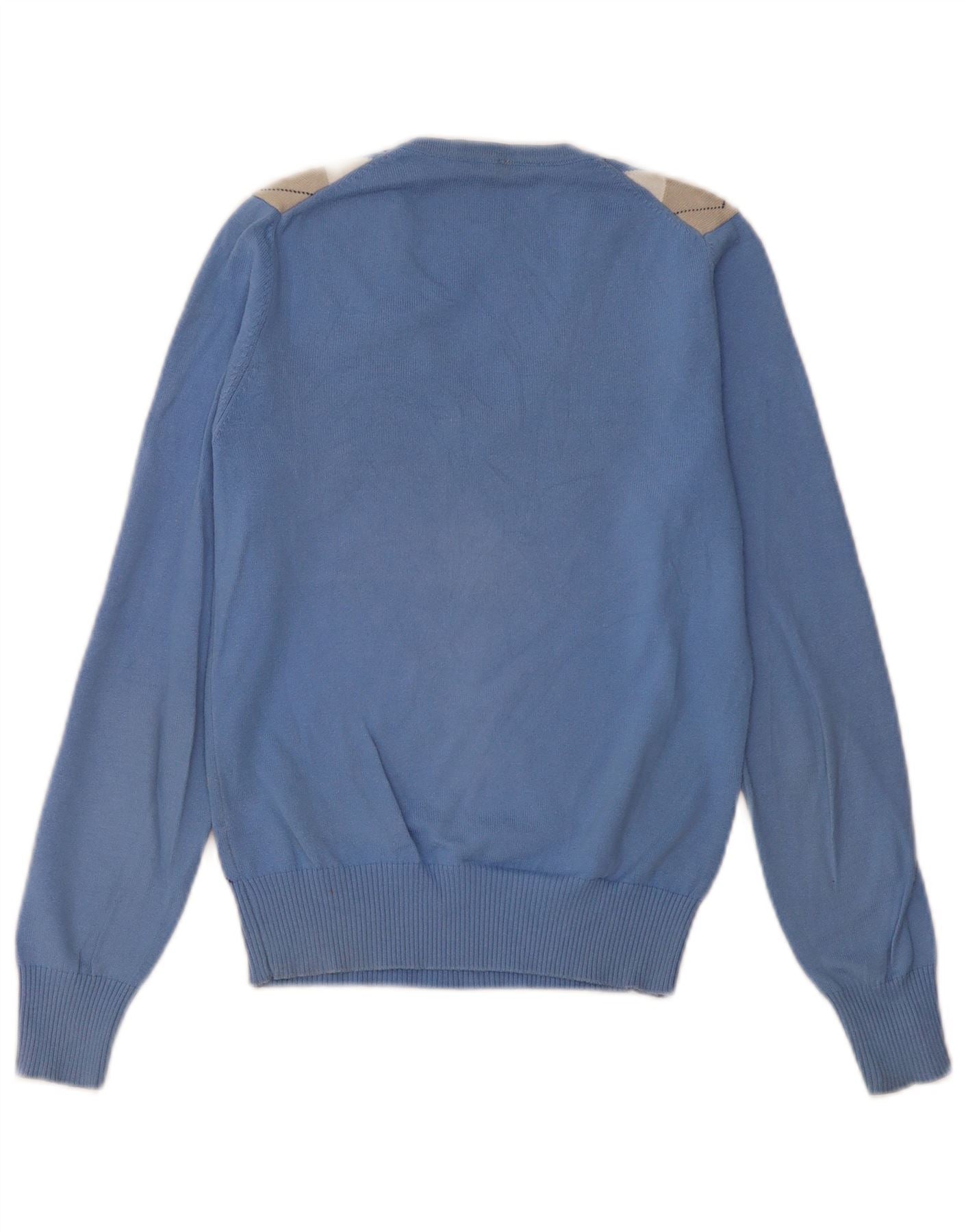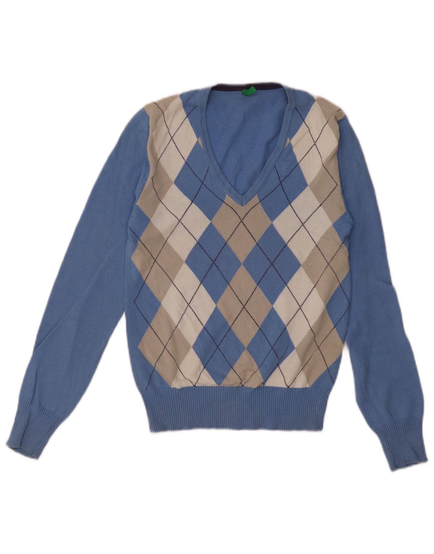 BENETTON Womens V-Neck Jumper Sweater IT 32 2XS Blue Argyle/Diamond Cotton