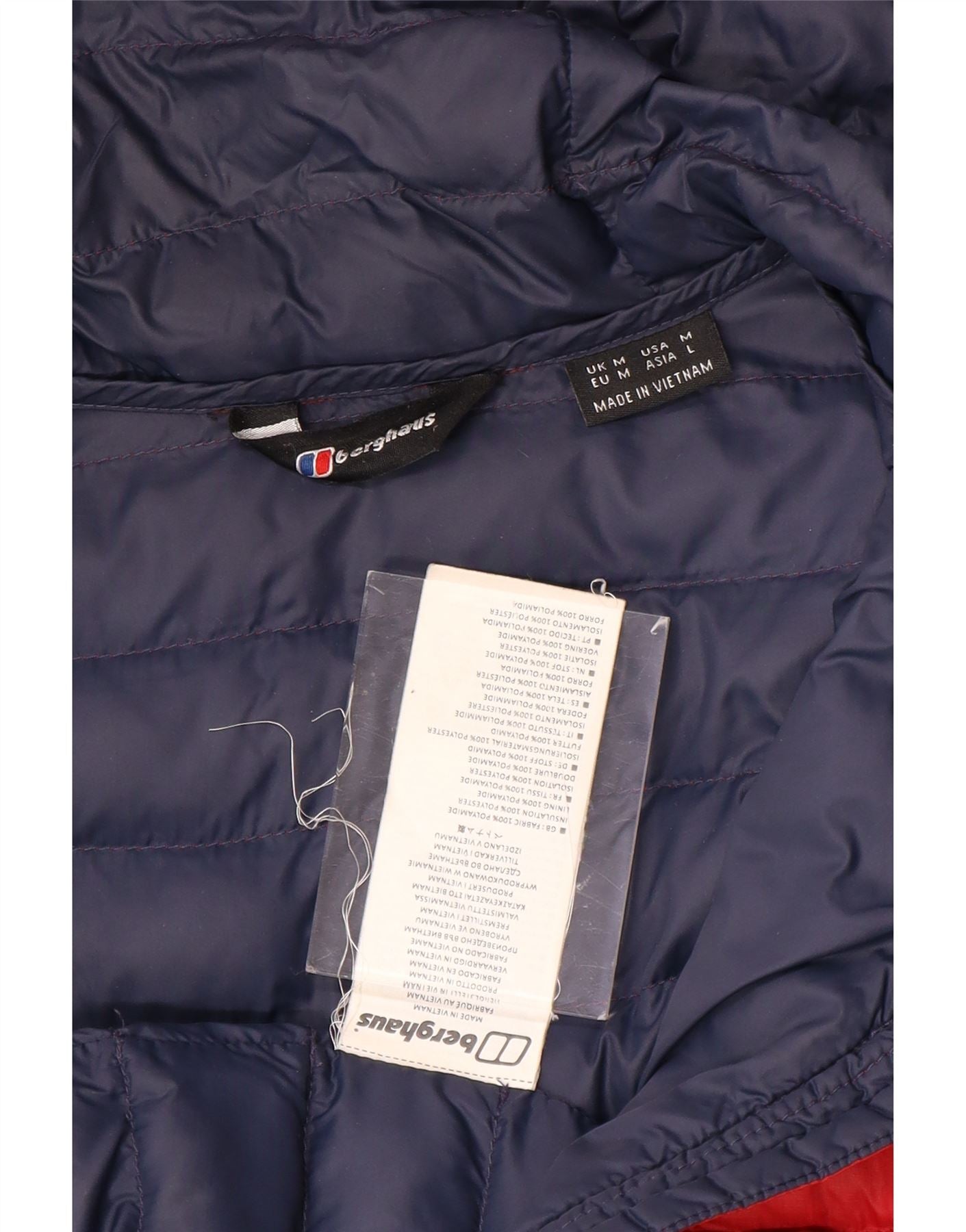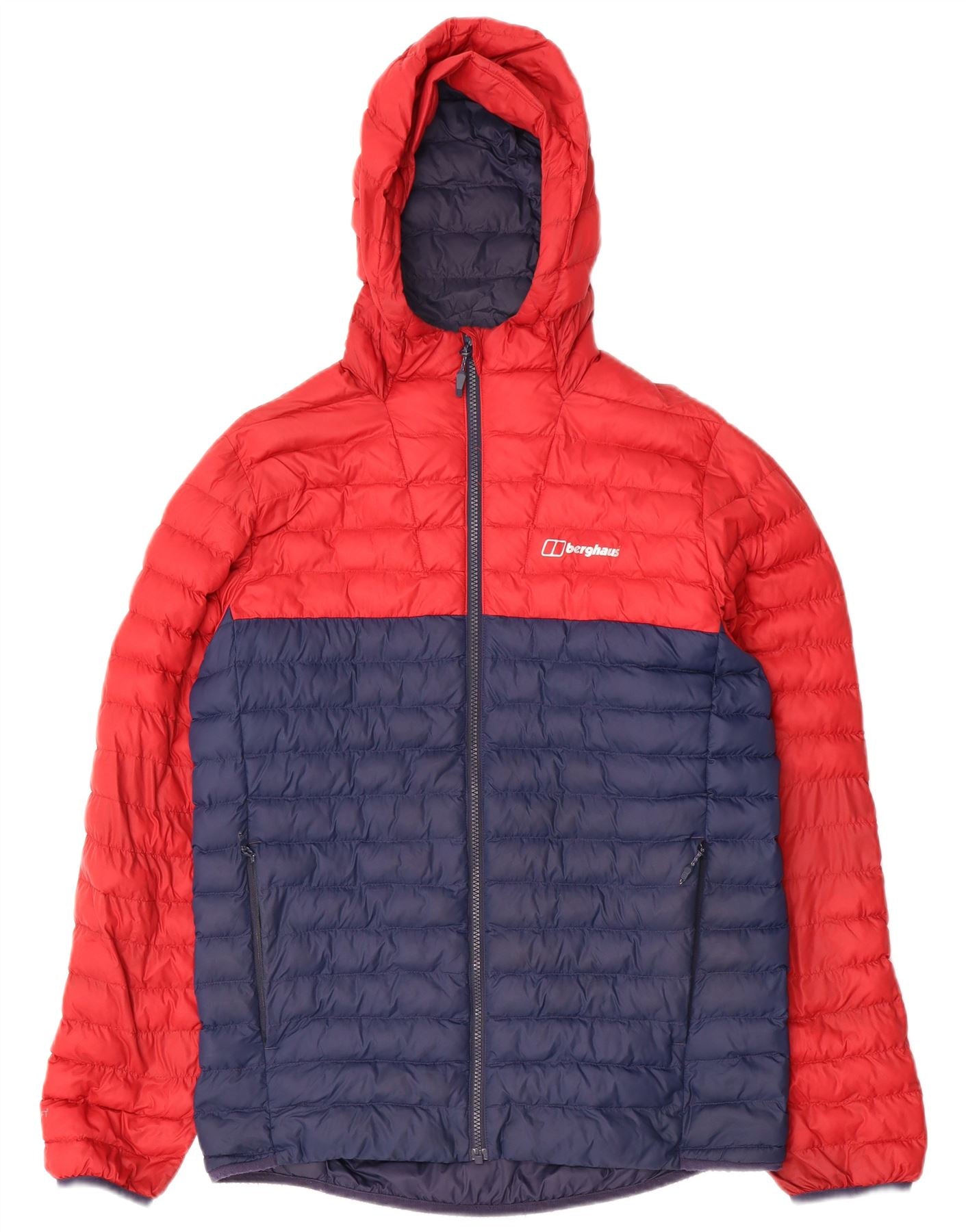 - AI Description: This Berghaus mens padded jacket is crafted from durable woven polyamide, offering lightweight thermal insulation. It features a regular fit and long sleeves. The hooded design provides extra protection. A striking colourblock pattern in red and navy blue adds visual interest. The full zip closure ensures practicality. A subtle logo accent completes the sports style.