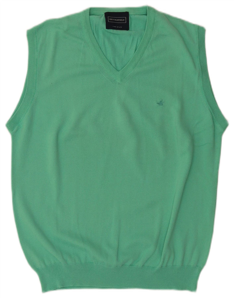 - AI Description: This Brooksfield mens knit vest is crafted from 100 percent cotton, offering a soft, breathable texture. Its classic V-neckline and sleeveless design provide a versatile, comfortable fit. The pullover style ensures easy wear. A regular fit maintains a smart silhouette. A subtle logo detail adds a refined brand touch to this timeless green garment.