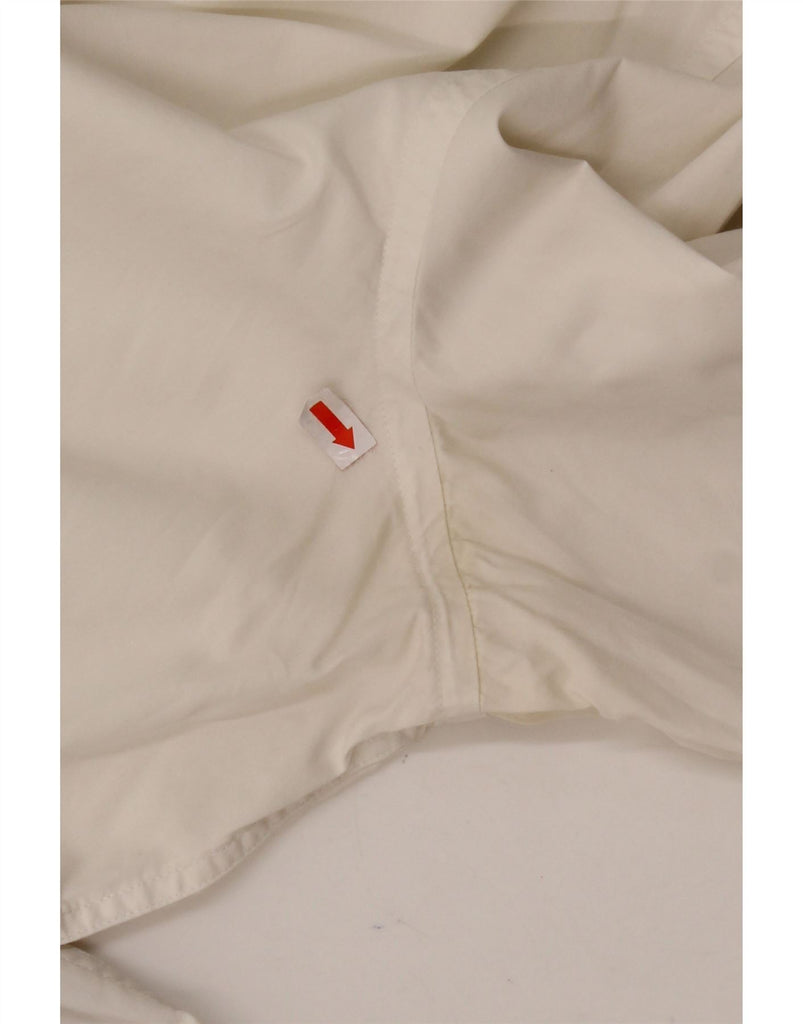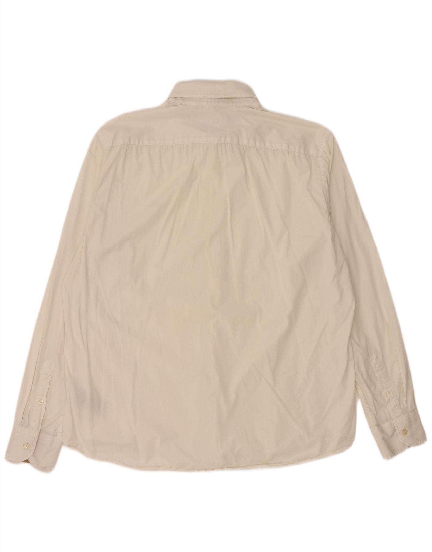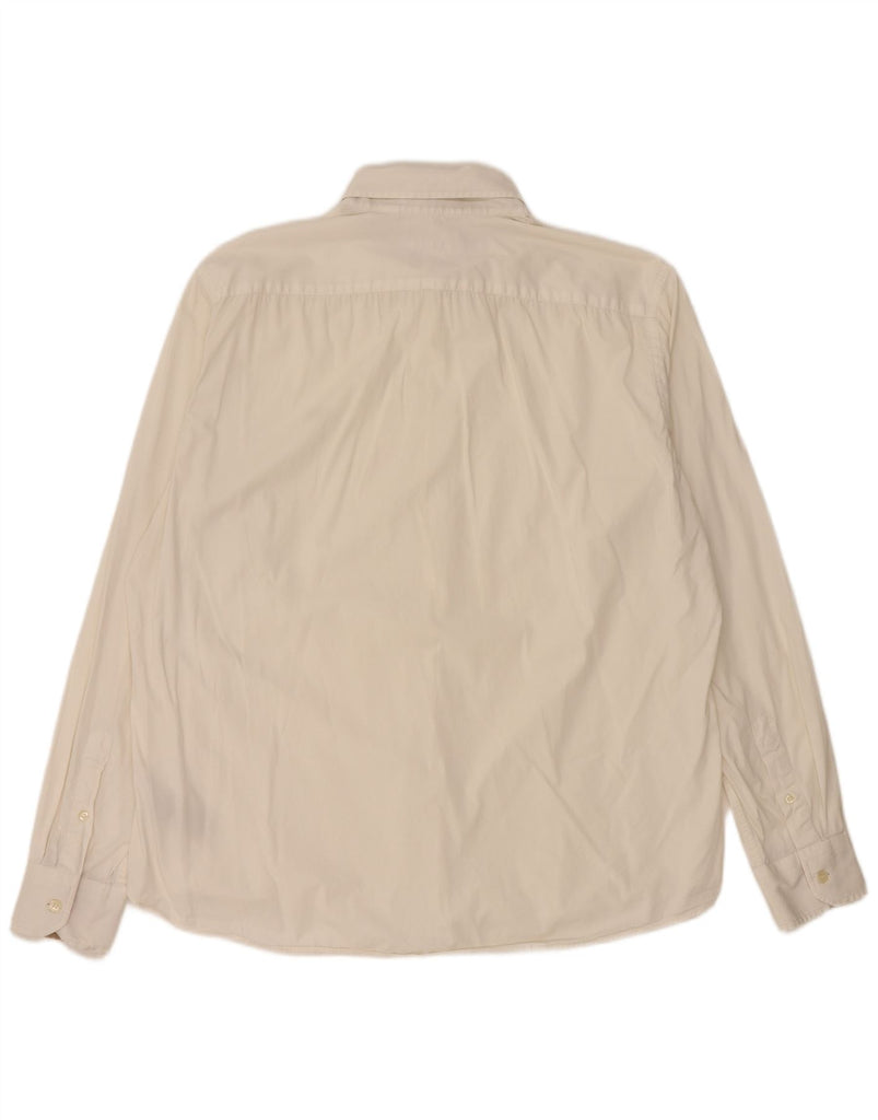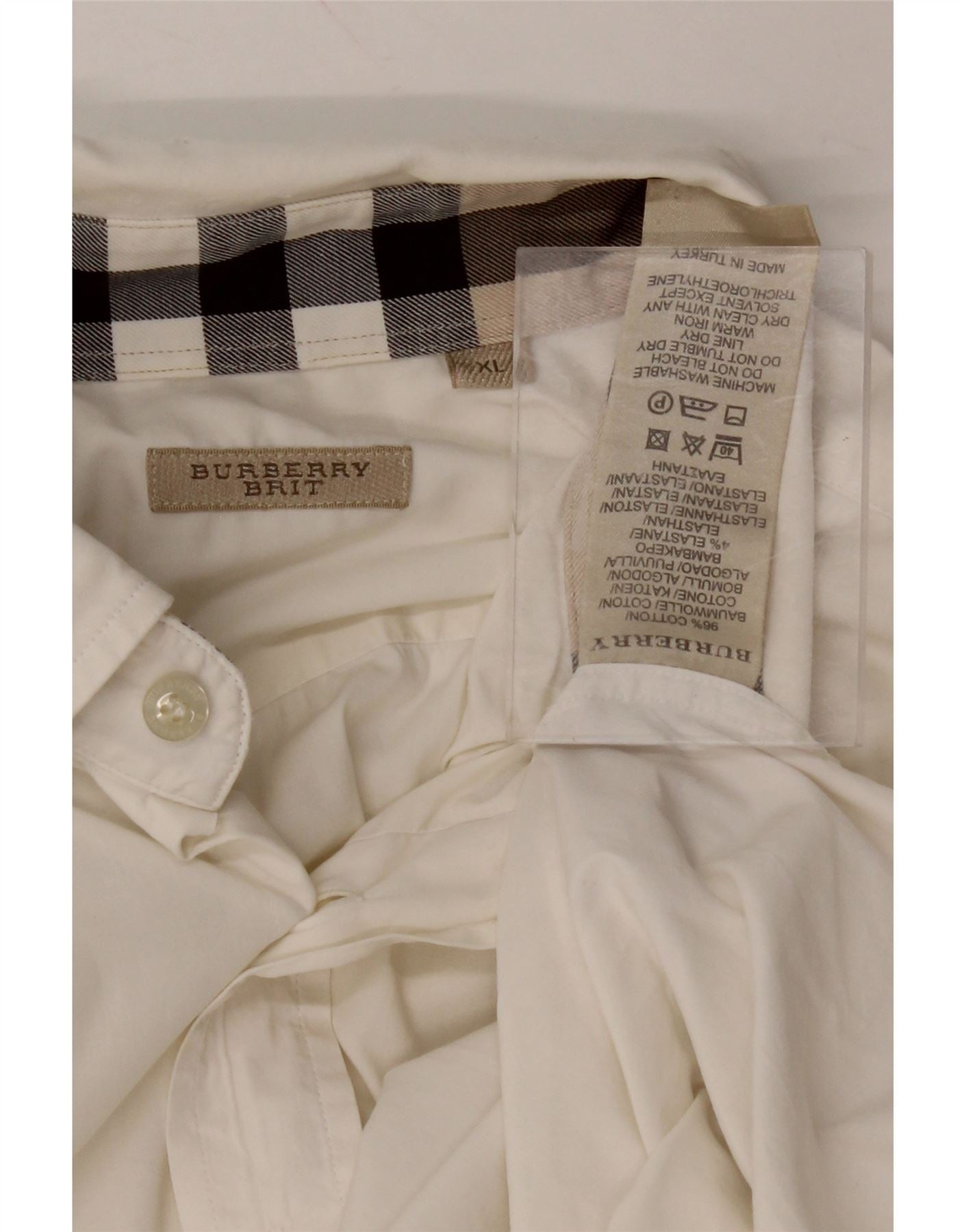 - AI Description: This Burberry Brit mens shirt is crafted from a woven off white cotton blend. It features a classic collared neckline and long sleeves with cuffed detailing. The button up front ensures a neat closure. With a regular fit and added stretch, this shirt offers both comfort and a smart silhouette. A subtle logo accent completes the timeless design.