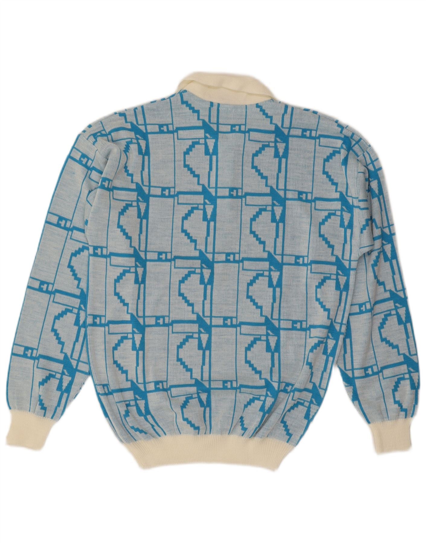 - AI Description: This C&A mens Polo Neck Jumper Sweater is crafted from a comfortable blue knit fabric. It features a distinctive geometric pattern throughout. The collared neckline with button closure offers a classic polo neck style. Long sleeves and a regular fit ensure comfort and versatility. Its retro style adds a timeless appeal, perfect for smart casual wear.