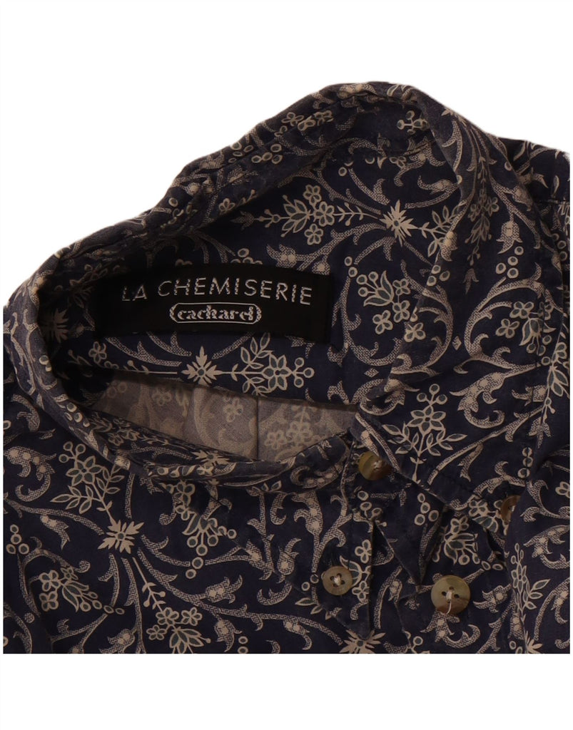 - AI Description: This Cacharel mens shirt is crafted from a finely woven fabric in a sophisticated navy blue. It features a classic collared neckline and a full button-up front for a timeless look. The long sleeves and regular fit ensure comfortable wear. A subtle floral abstract pattern adds a distinctive touch, making it a versatile piece for any wardrobe.