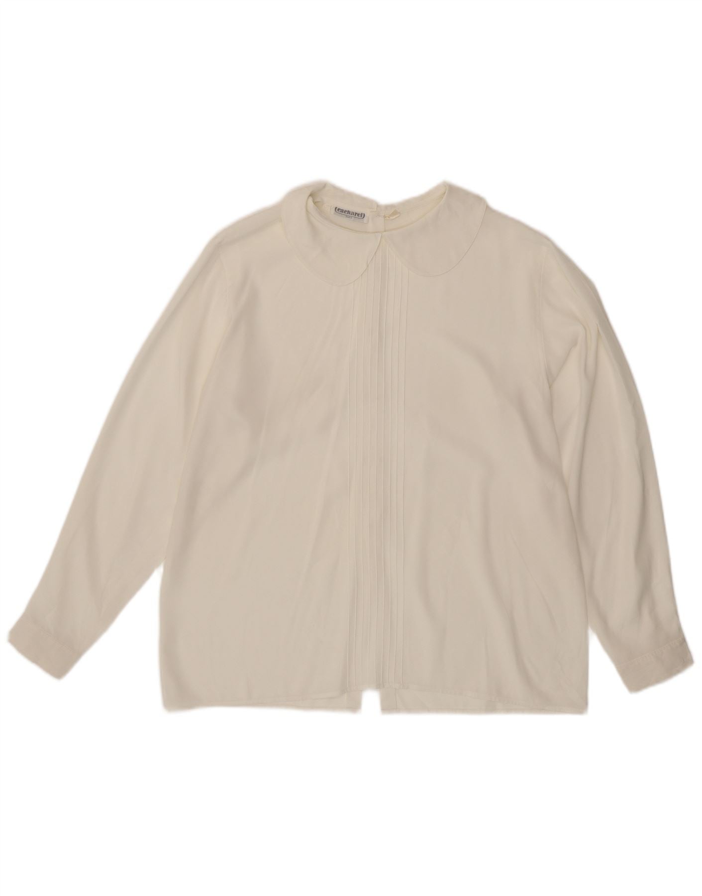 - AI Description: This Cacharel womens blouse top is presented in a sophisticated off white woven fabric. It features a classic collared neckline and long sleeves. The regular fit ensures comfortable wear. Button closures offer a neat finish. Subtle pleated accents add a refined touch to this elegant design.