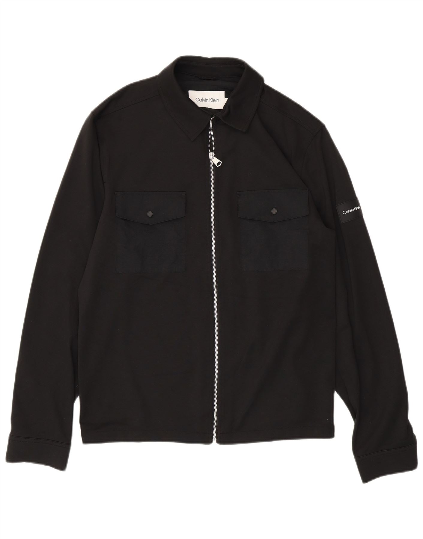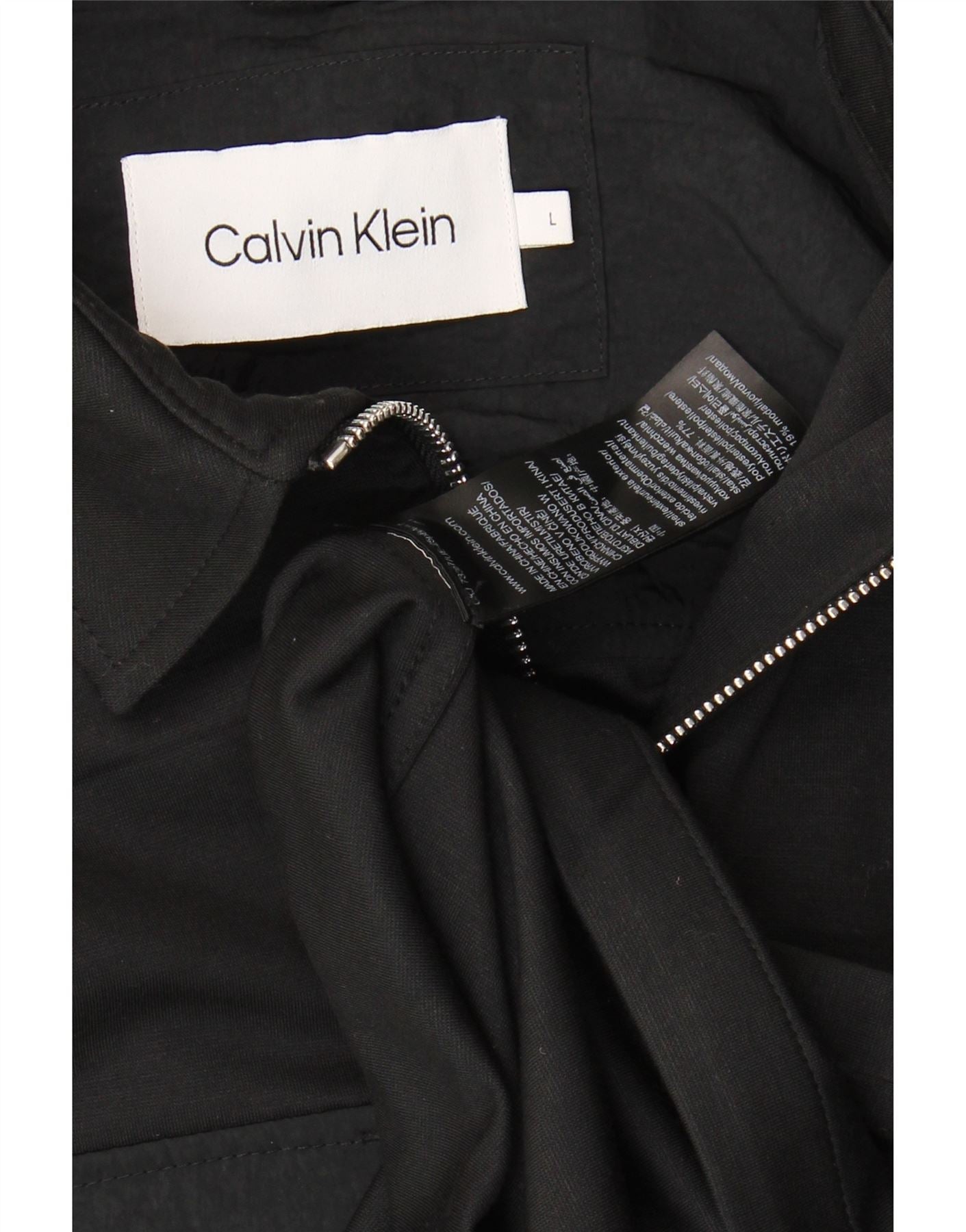- AI Description: This Calvin Klein mens jacket is crafted from a smooth viscose blend fabric in a versatile black hue. It features a classic collared neckline and long sleeves. A full zip closure secures the front, complemented by practical pockets. Subtle button accents add refined detail. The regular fit ensures comfortable wear and a modern silhouette.