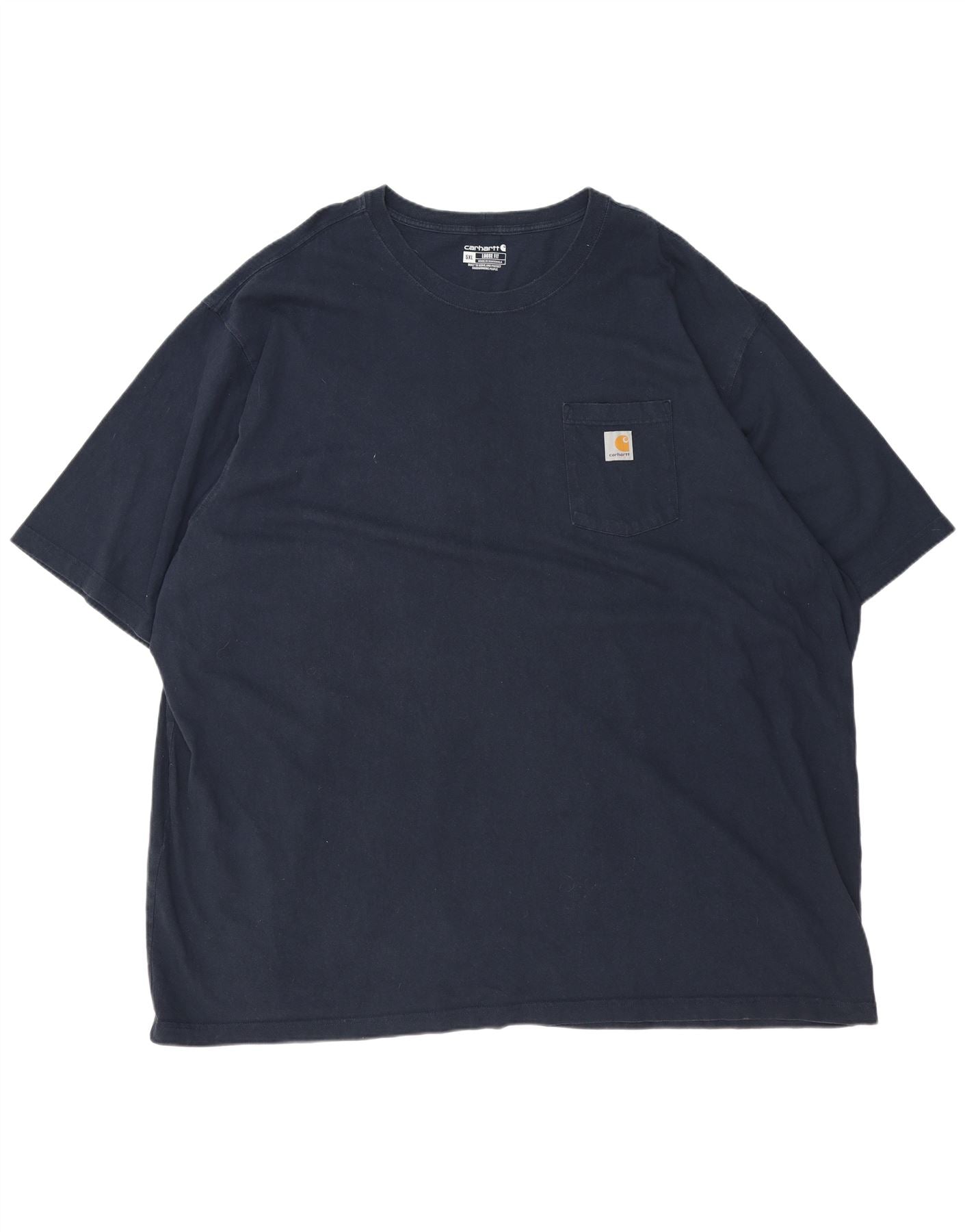 - AI Description: This Carhartt mens T-shirt is crafted from soft navy blue cotton jersey. It offers a relaxed fit for ultimate comfort and ease of movement. The classic round neck and short sleeves provide a timeless silhouette. A subtle chest pocket adds practical detail, while the iconic Carhartt logo is present. This pullover style is perfect for everyday wear.