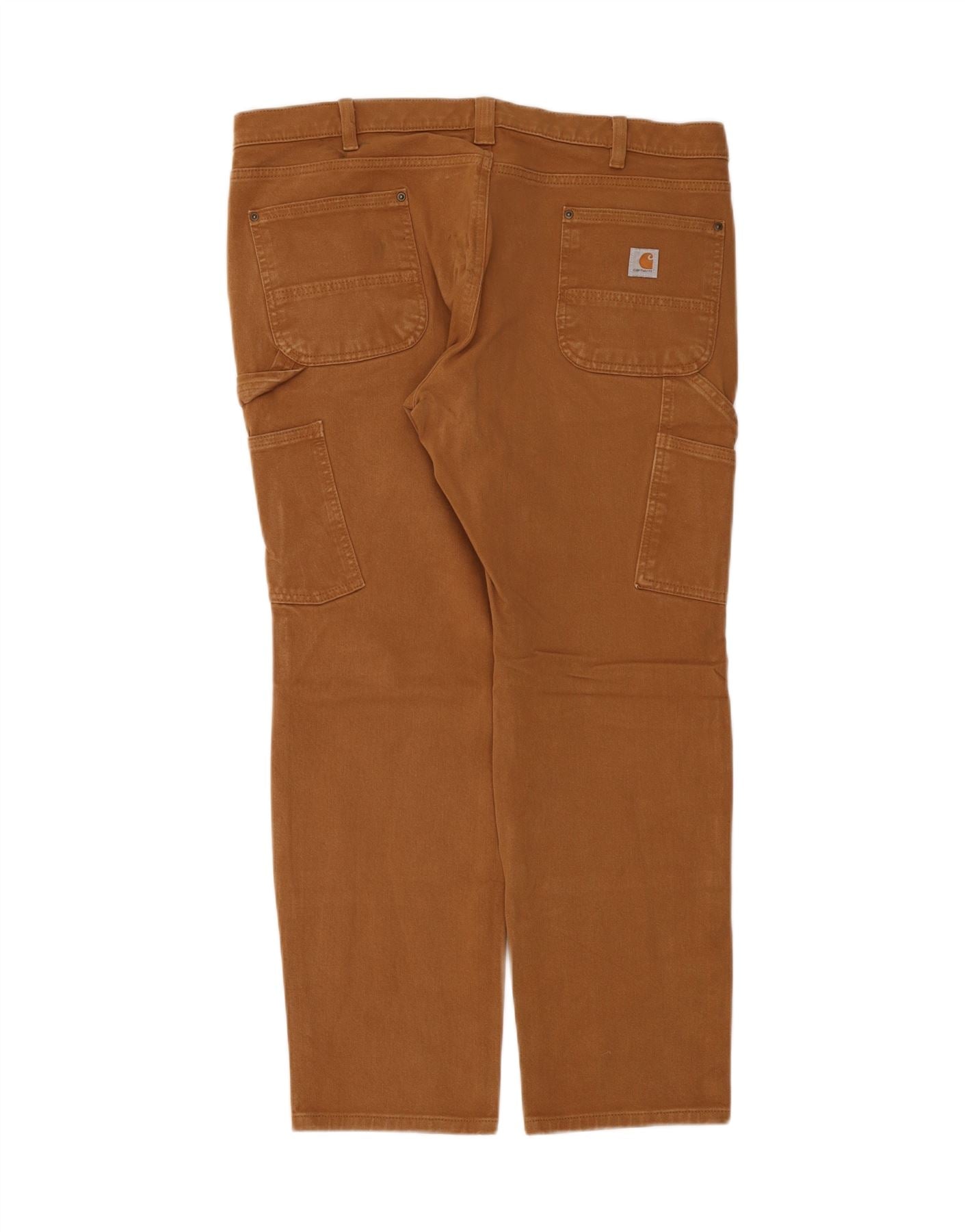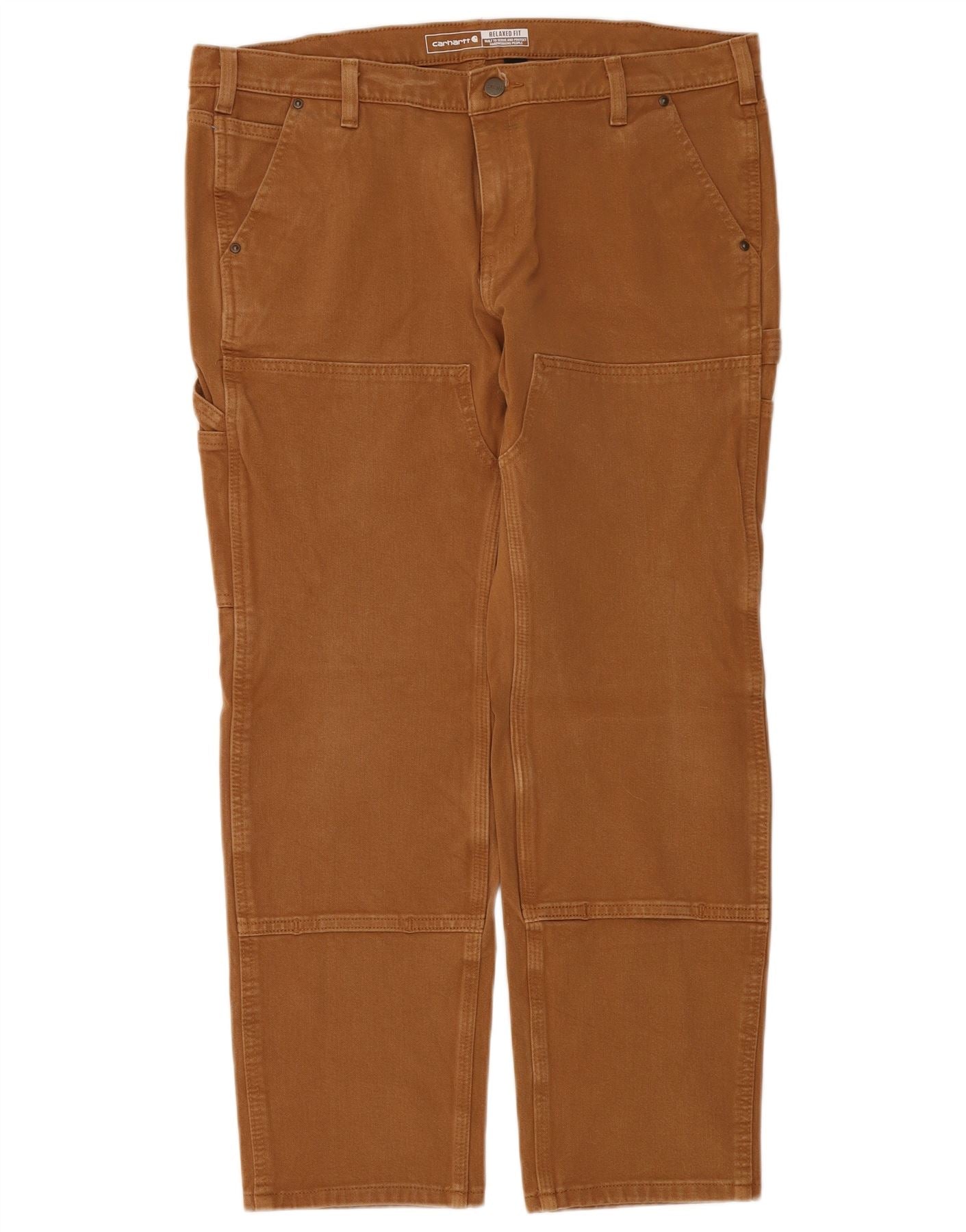 - AI Description: These Carhartt womens trousers are crafted from a durable brown cotton blend. The fabric includes elastane for added stretch and comfort. They feature a relaxed fit and a mid-rise waist. A secure button and zip closure ensures practicality. Multiple pockets offer functional storage. A subtle brand logo provides a classic accent. This design combines robust utility with everyday wearability.