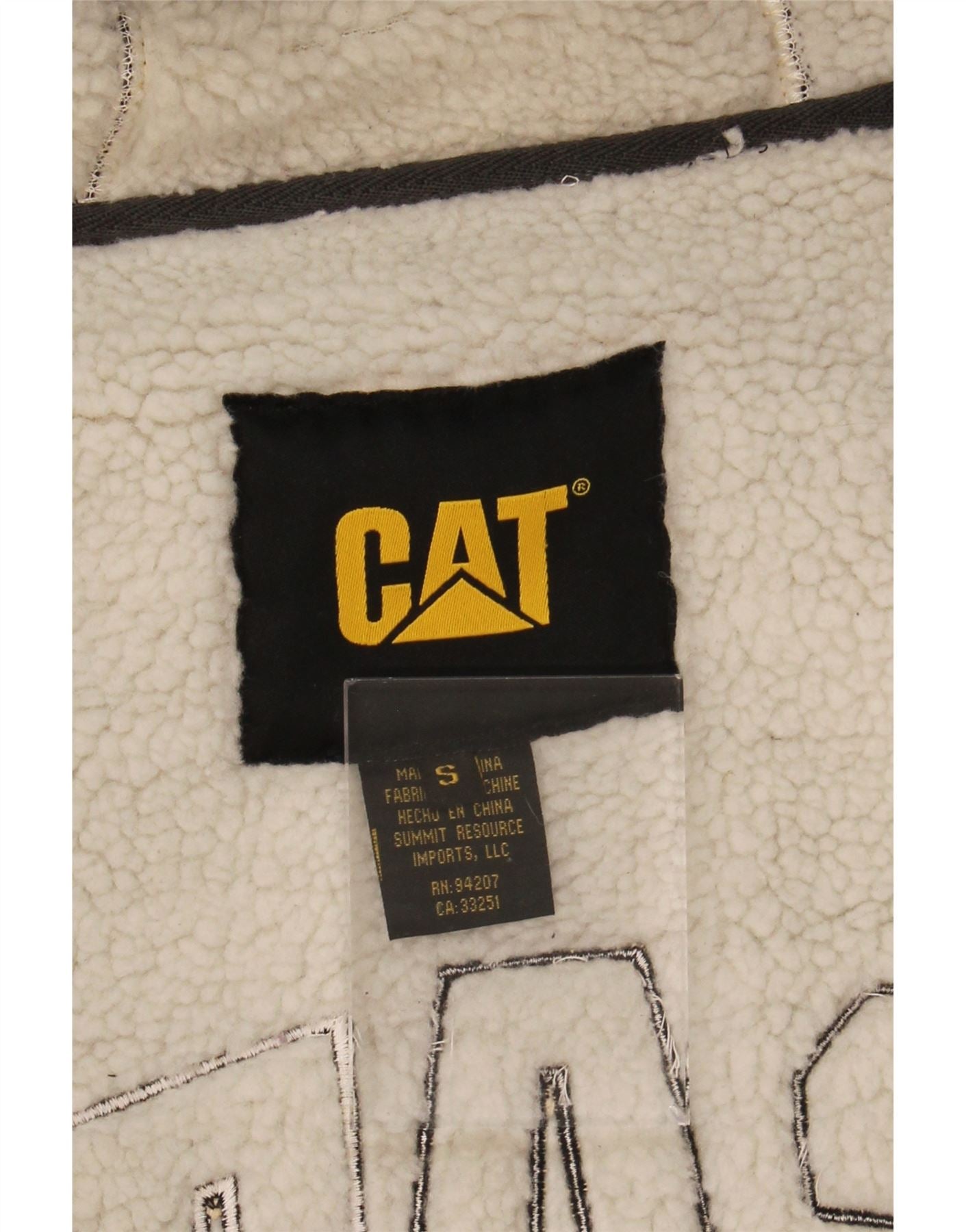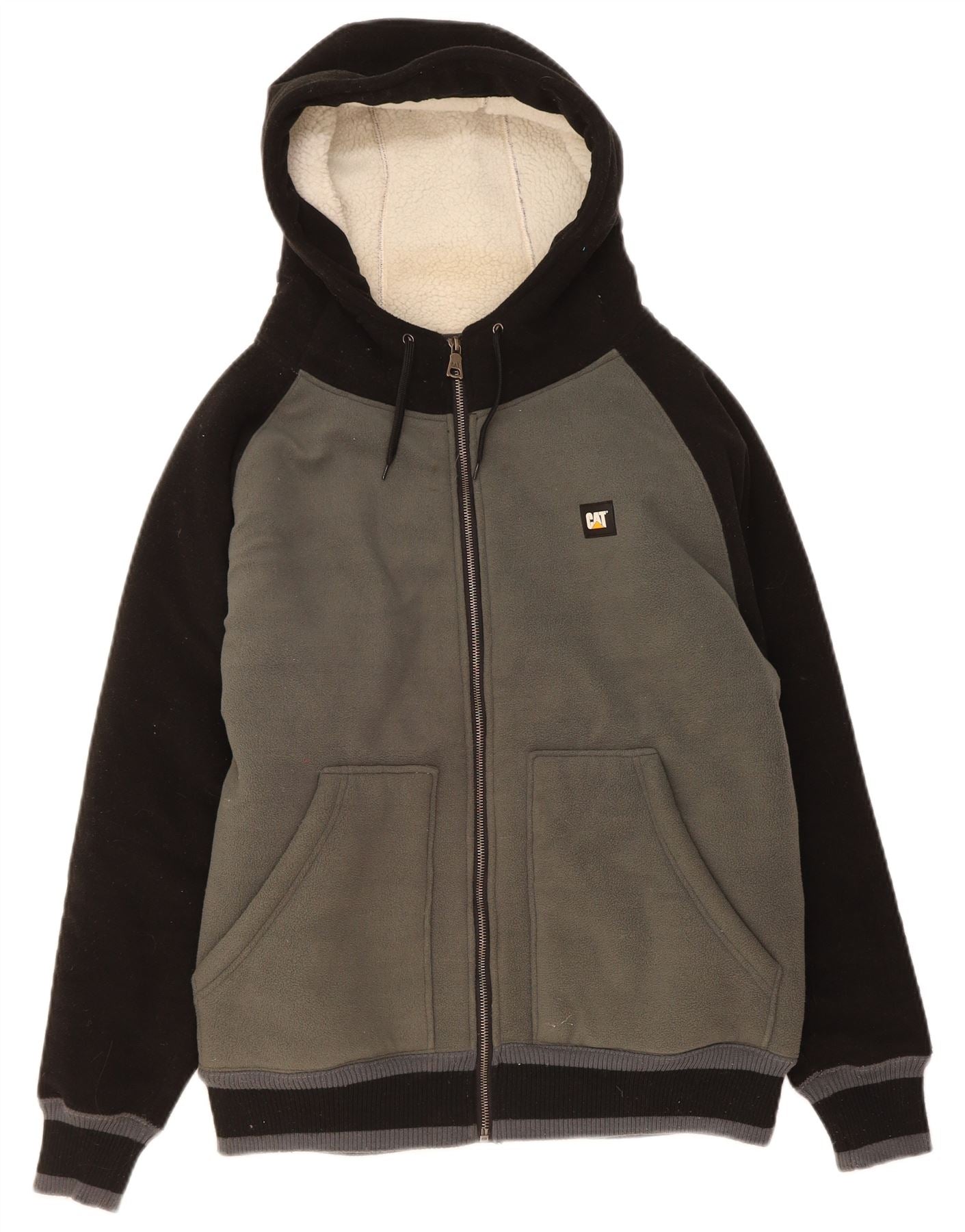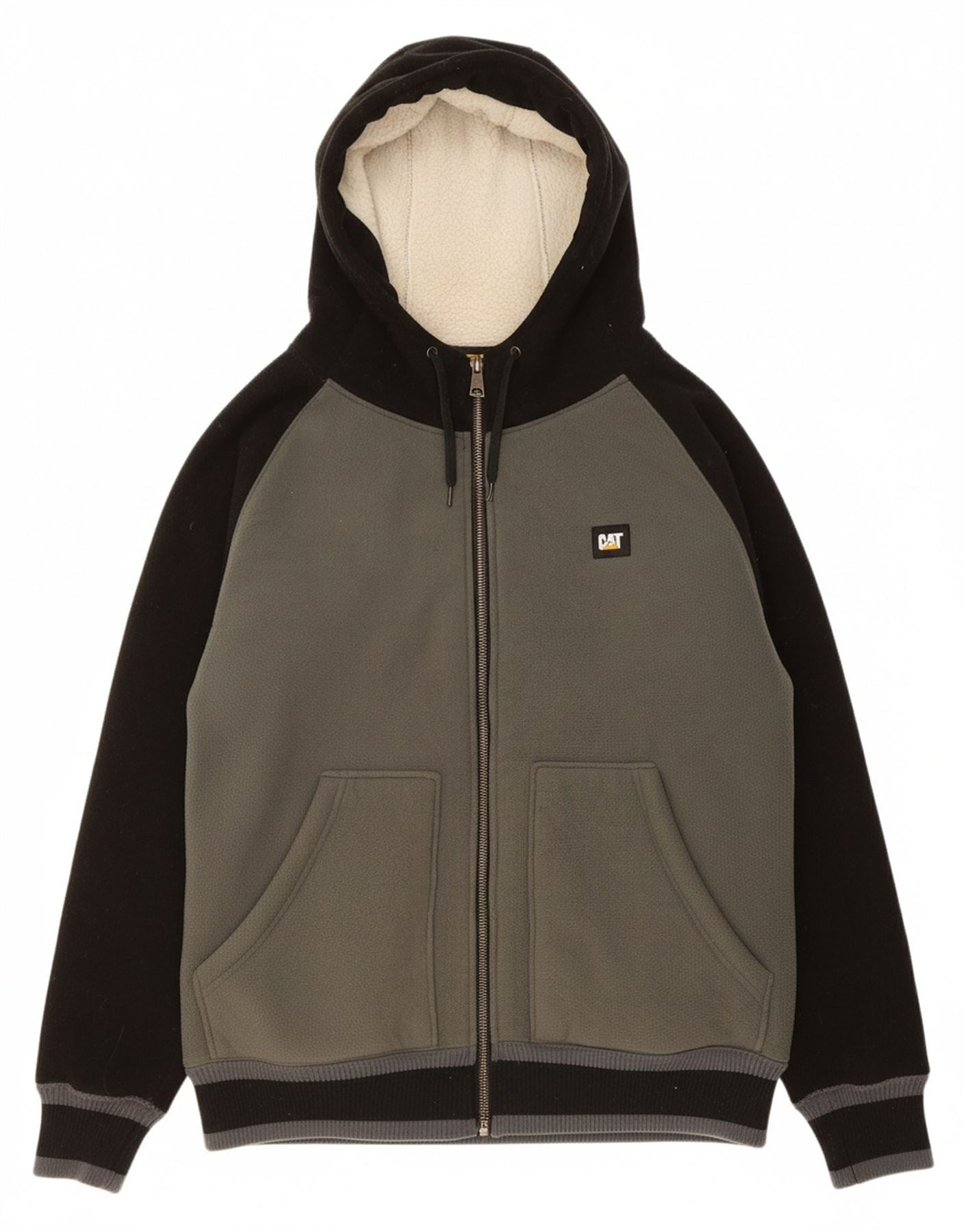 - AI Description: This CAT mens Zip Hoodie Sweater is crafted from soft fleece, featuring a luxurious sherpa lining for warmth. It presents a regular fit with a full zip closure for adaptable styling. The practical hooded neckline and long sleeves ensure comfort. Pockets offer convenience, whilst a prominent multicoloured design in black, grey, and off white creates visual interest. A signature spell-out logo provides a bold brand accent.