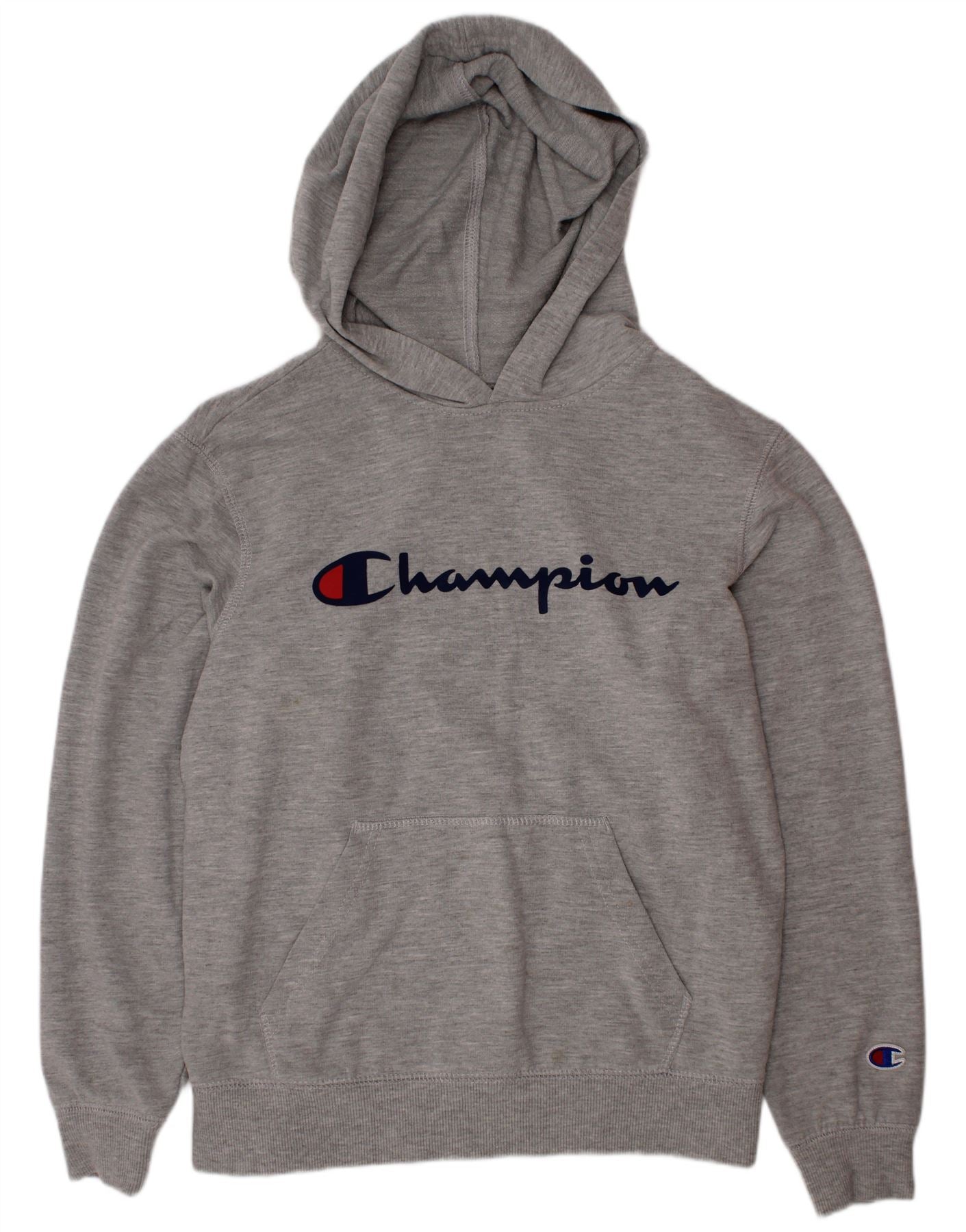 CHAMPION Boys Graphic Hoodie Jumper 9-10 Years Medium Grey Flecked Cotton