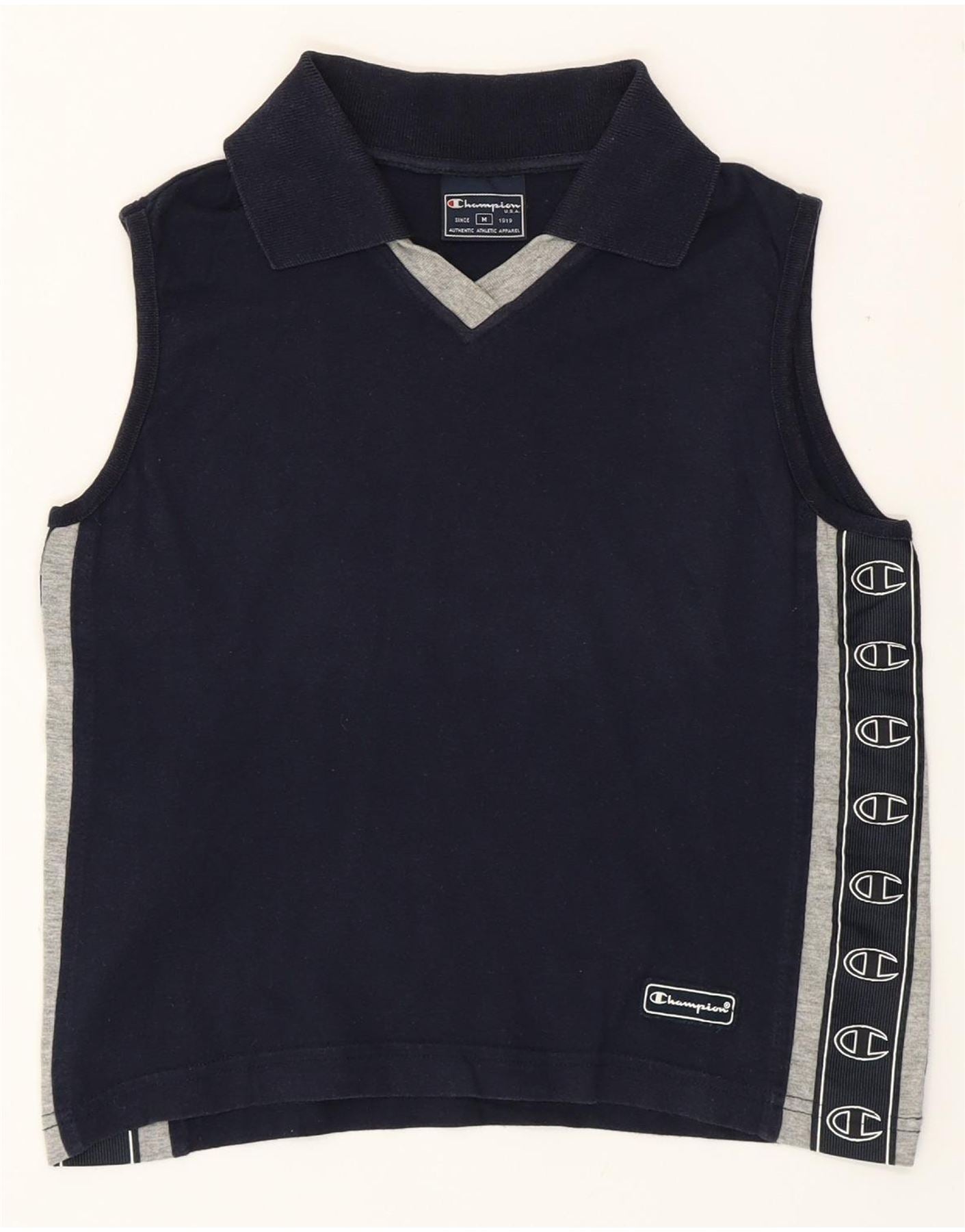 CHAMPION Womens Crop Graphic Polo Shirt UK 12 Medium Navy Blue Colourblock