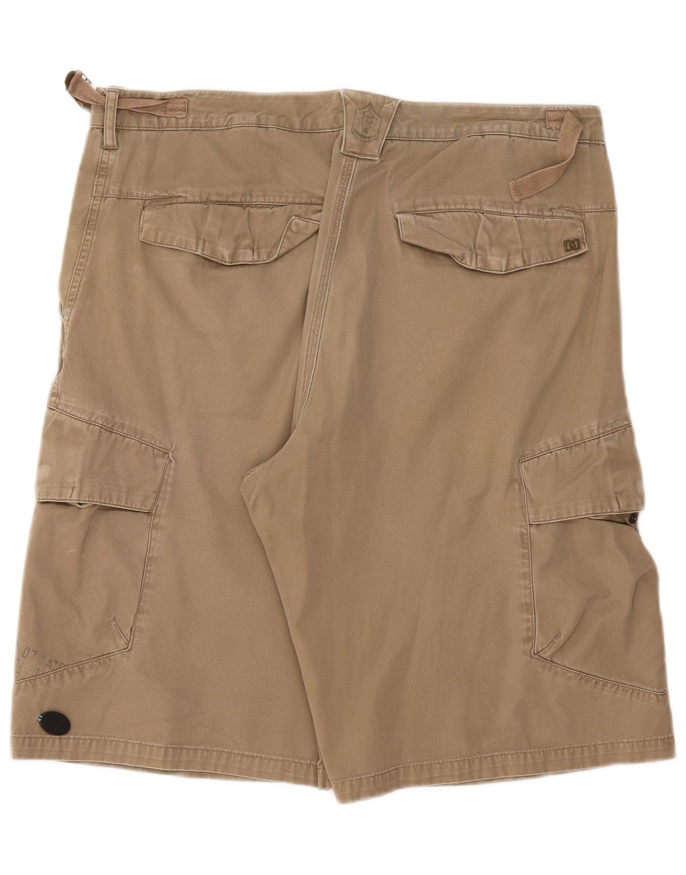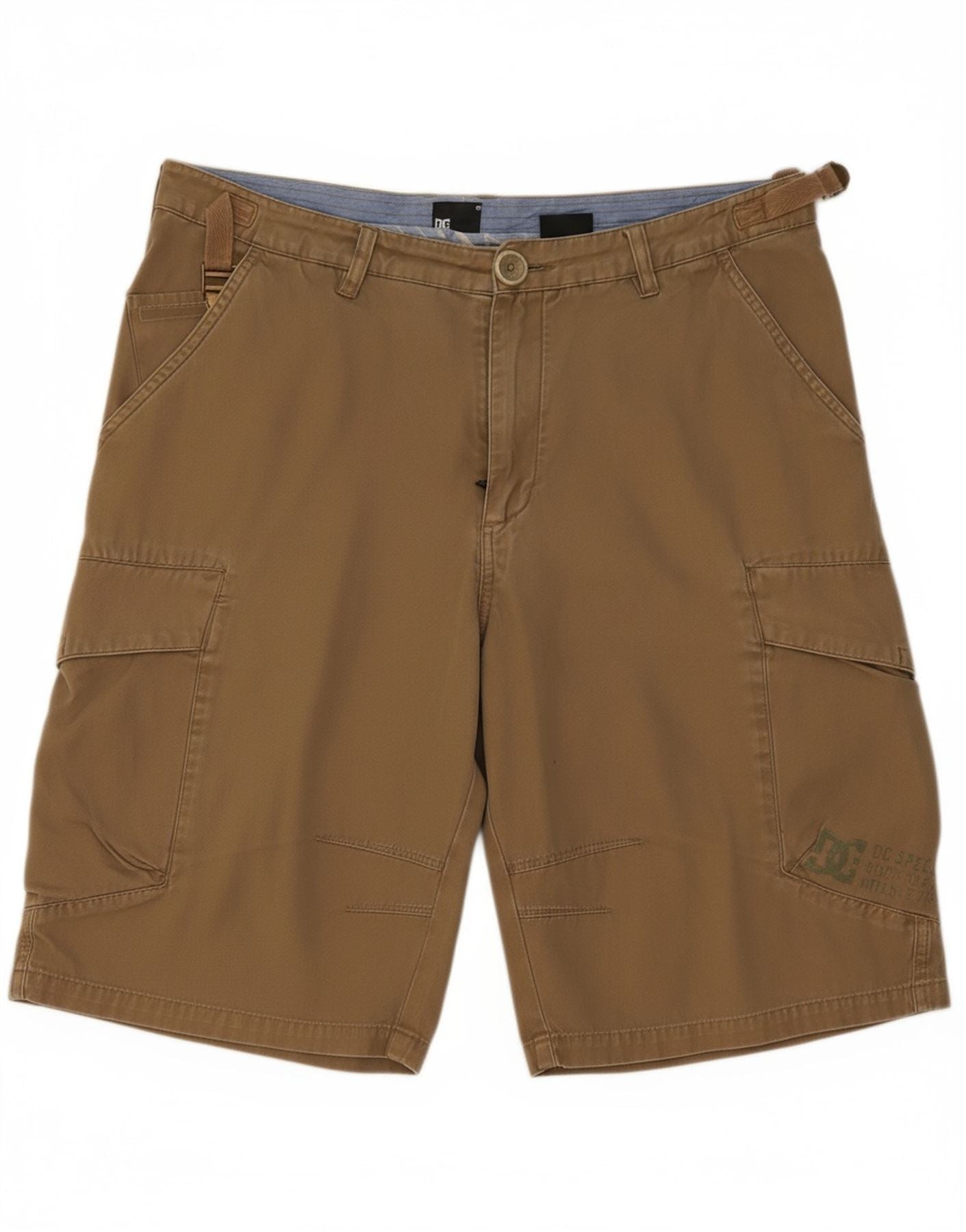 - AI Description: This DC mens Cargo Shorts are crafted from durable khaki woven fabric. They offer a regular fit for comfortable wear. The button and zip closure provides a secure fastening. Practical utility pockets are integrated throughout. A subtle brand logo adds a modern finishing touch. These shorts are perfect for versatile casual styling.