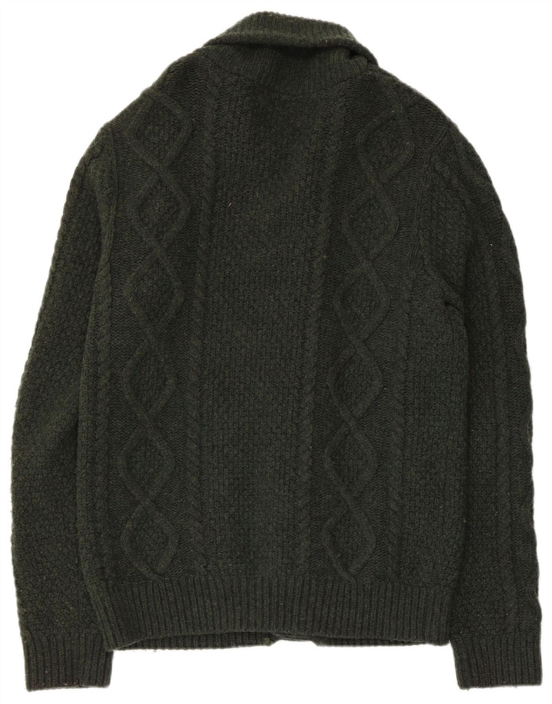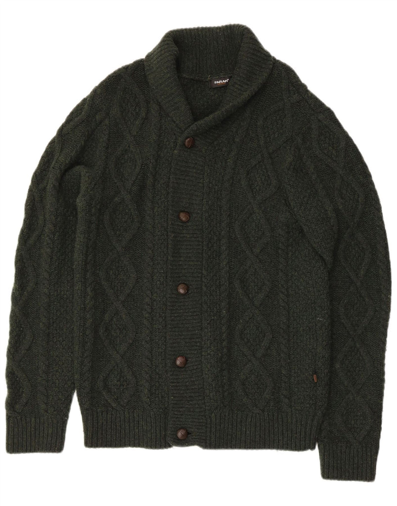- AI Description: This Farah mens cardigan sweater is crafted from luxurious 100 percent virgin wool knit. Its heavyweight construction offers exceptional thermal comfort. The classic regular fit features long sleeves and a distinguished collared shawl neck. A button closure runs down the front, adding a refined touch. This piece combines timeless style with practical warmth.