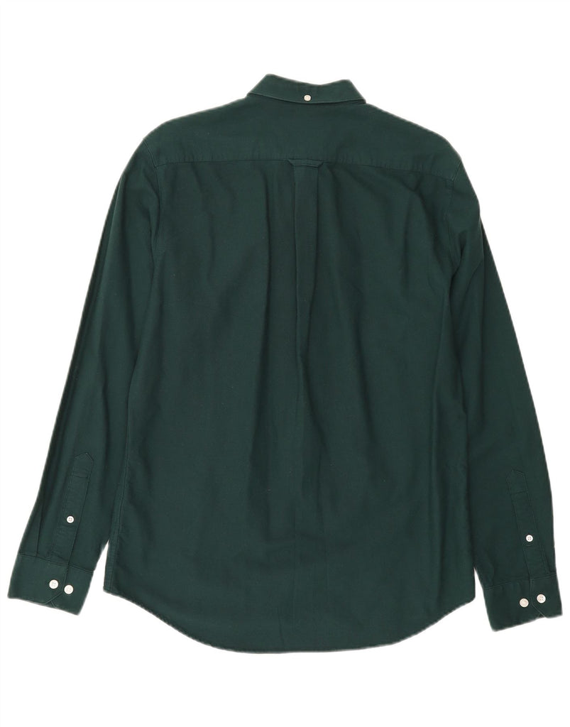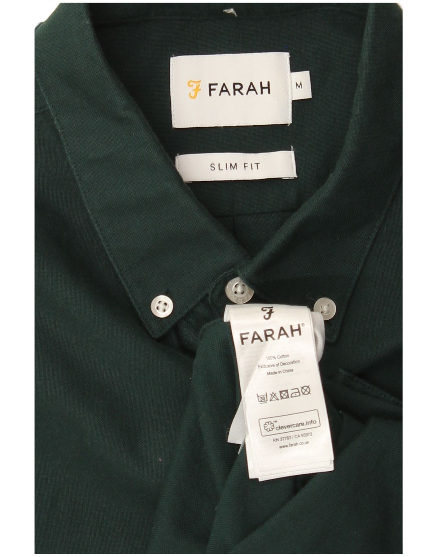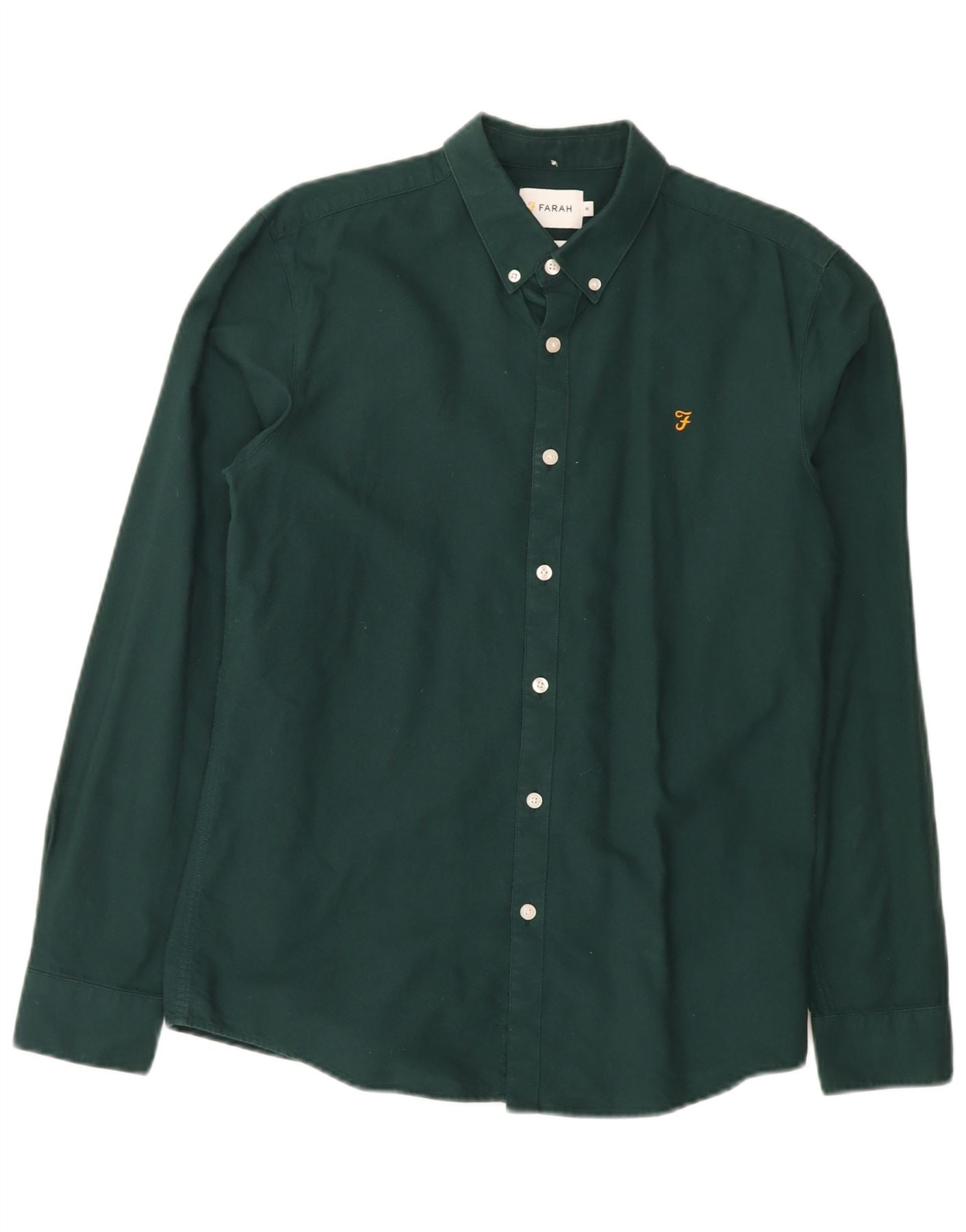 - AI Description: This Farah mens shirt is crafted from 100 percent woven cotton, offering a crisp yet comfortable feel. It comes in a versatile green hue, perfect for smart casual wear. A subtle embroidered logo adds a signature touch. The collared neckline and full button-up front provide a classic, refined look. Long sleeves complete the traditional silhouette. Designed with a modern slim fit, it offers a tailored appearance that is both sharp and flattering.