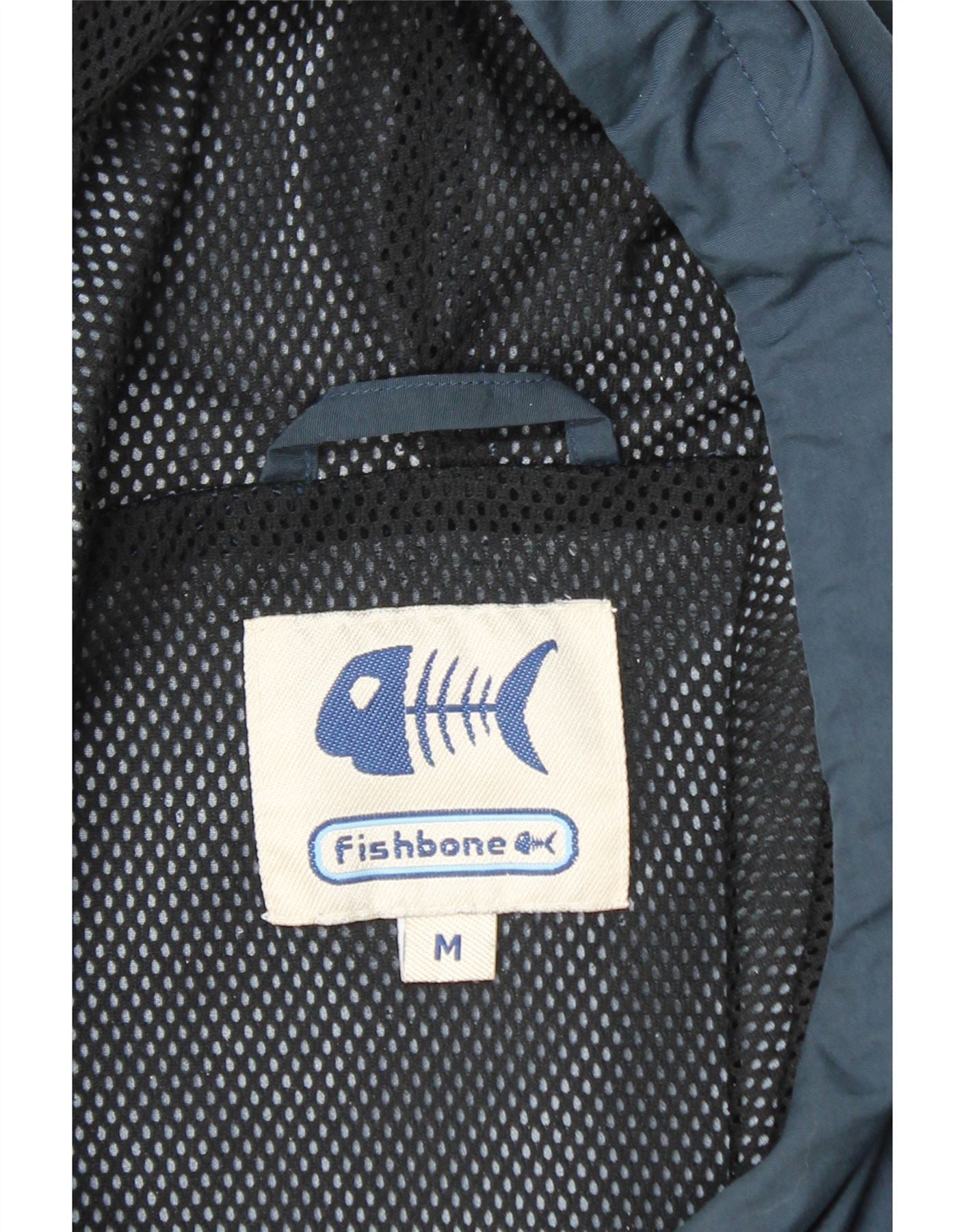 - AI Description: This pre-owned Fishbone anorak jacket in blue is a classic and practical choice. Crafted from woven fabric, this regular fit, hooded pullover features long sleeves, an adjustable waist, and water-resistant properties. The jacket includes pockets and a logo accent. It's labelled as size M and shows minor signs of general wear. Ideal as a windbreaker or rain jacket.