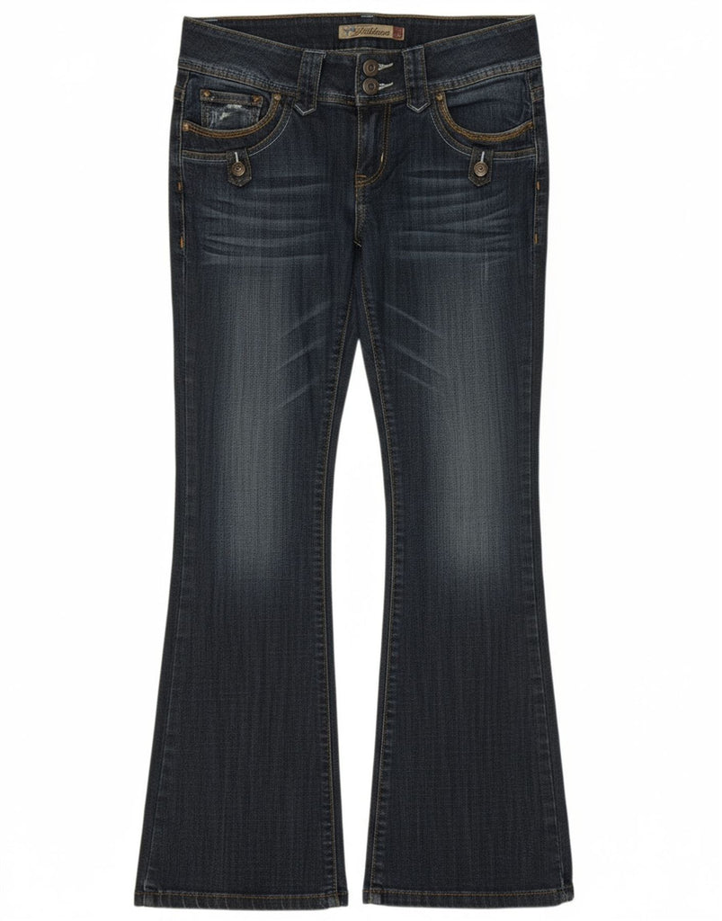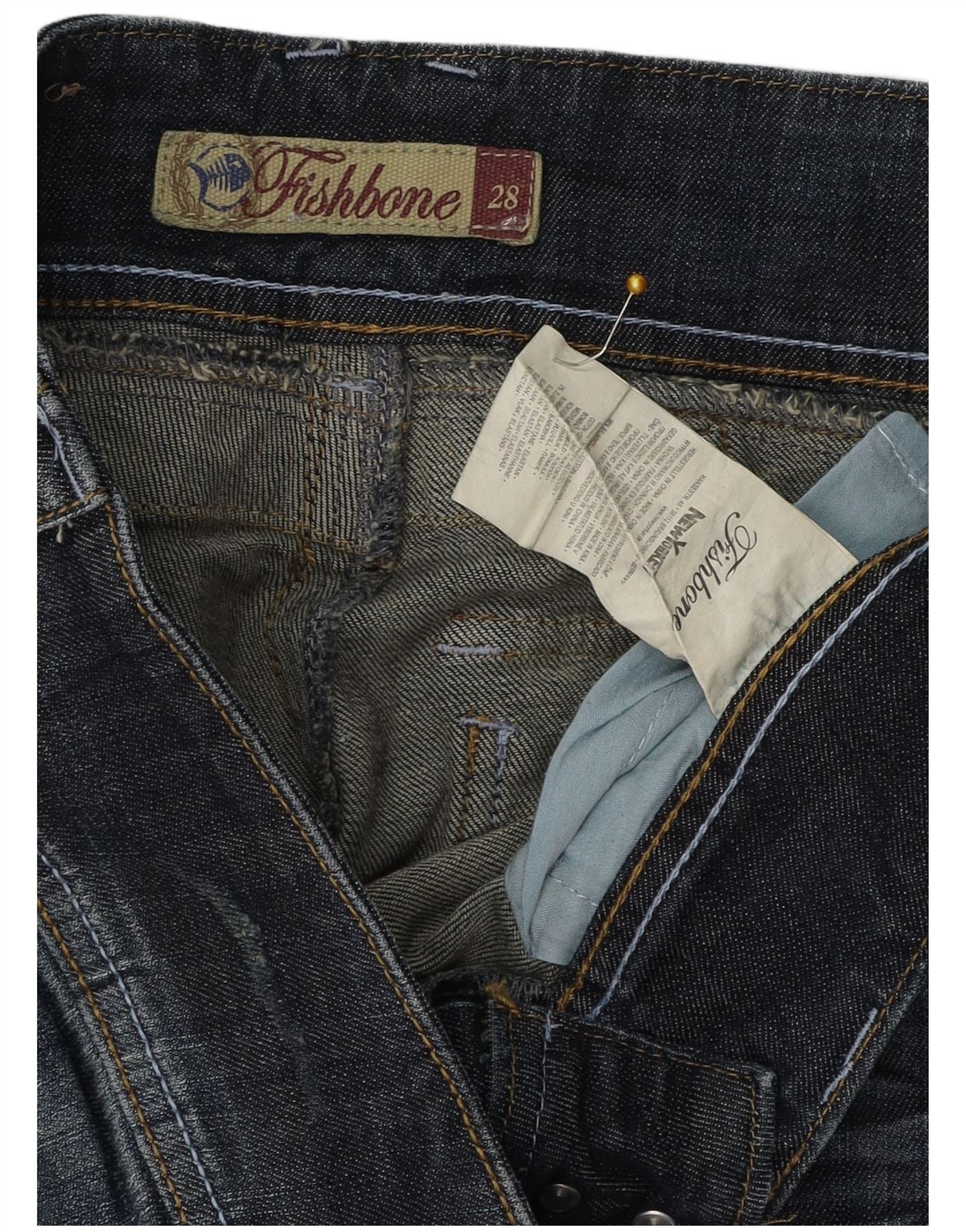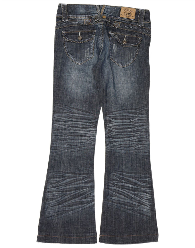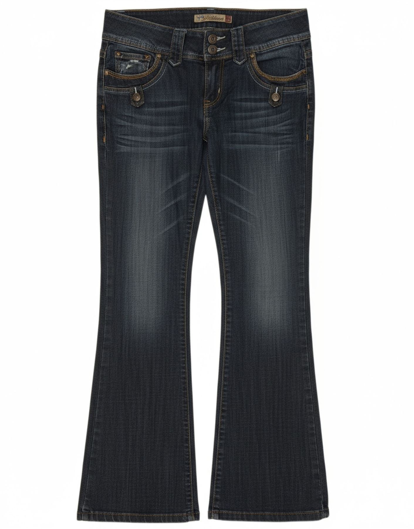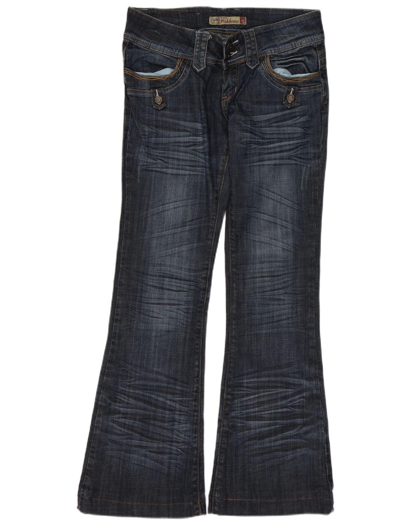 - AI Description: These Fishbone womens bootcut jeans are crafted from blue cotton denim with a hint of elastane for comfort. They feature a low waist and a classic button closure. The regular fit through the leg flares gently from the knee. Subtle distressed detailing adds a contemporary edge. Functional pockets complete the design, offering a classic yet modern style.