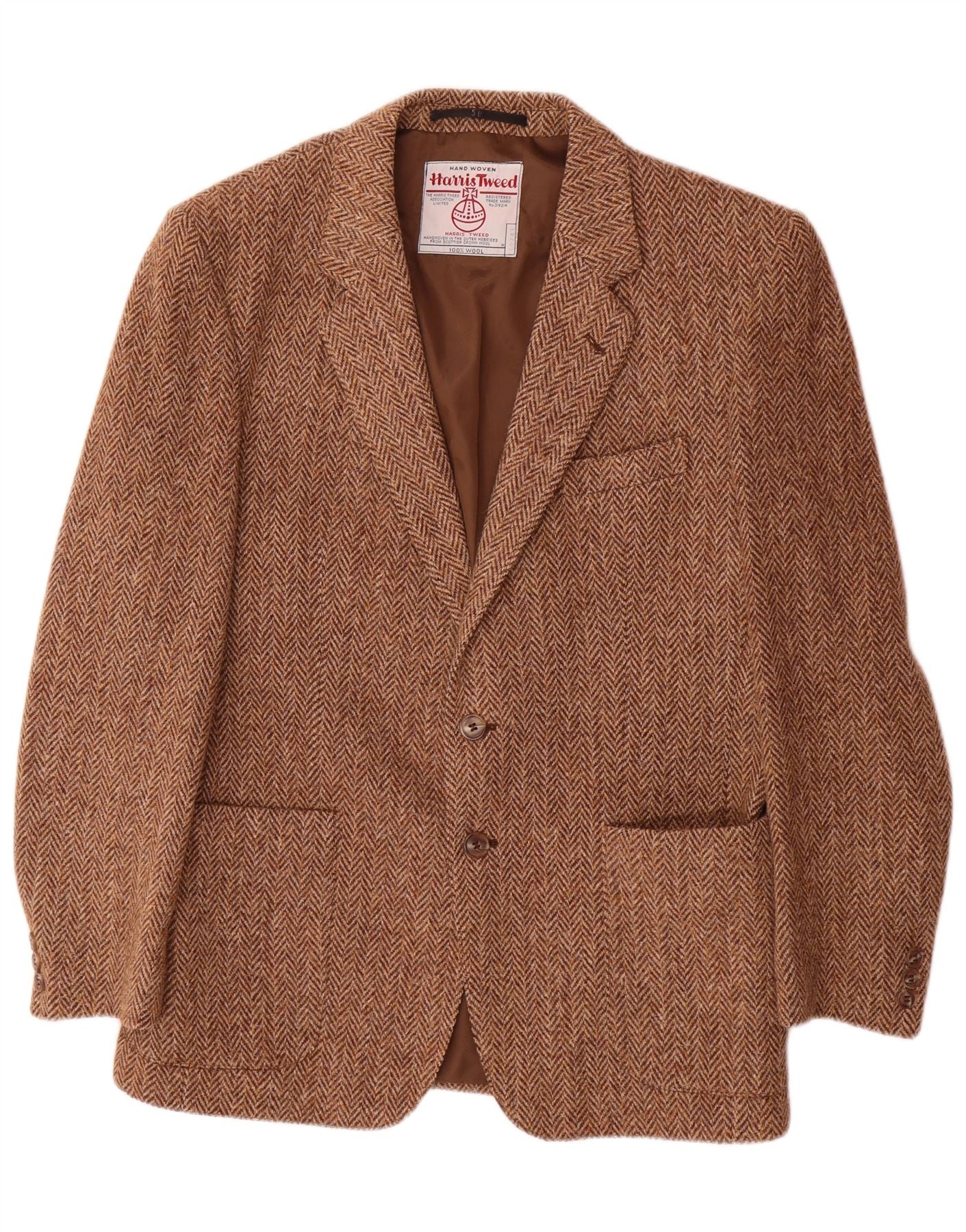 - AI Description: This Harris Tweed mens blazer jacket is crafted from rich brown 100 percent wool tweed. Its herringbone pattern adds classic texture. The collared neckline and two-button front create a refined silhouette. Long sleeves and a regular fit ensure comfortable wear. It features practical pockets and a full lining for added warmth and structure. This piece embodies timeless British style.