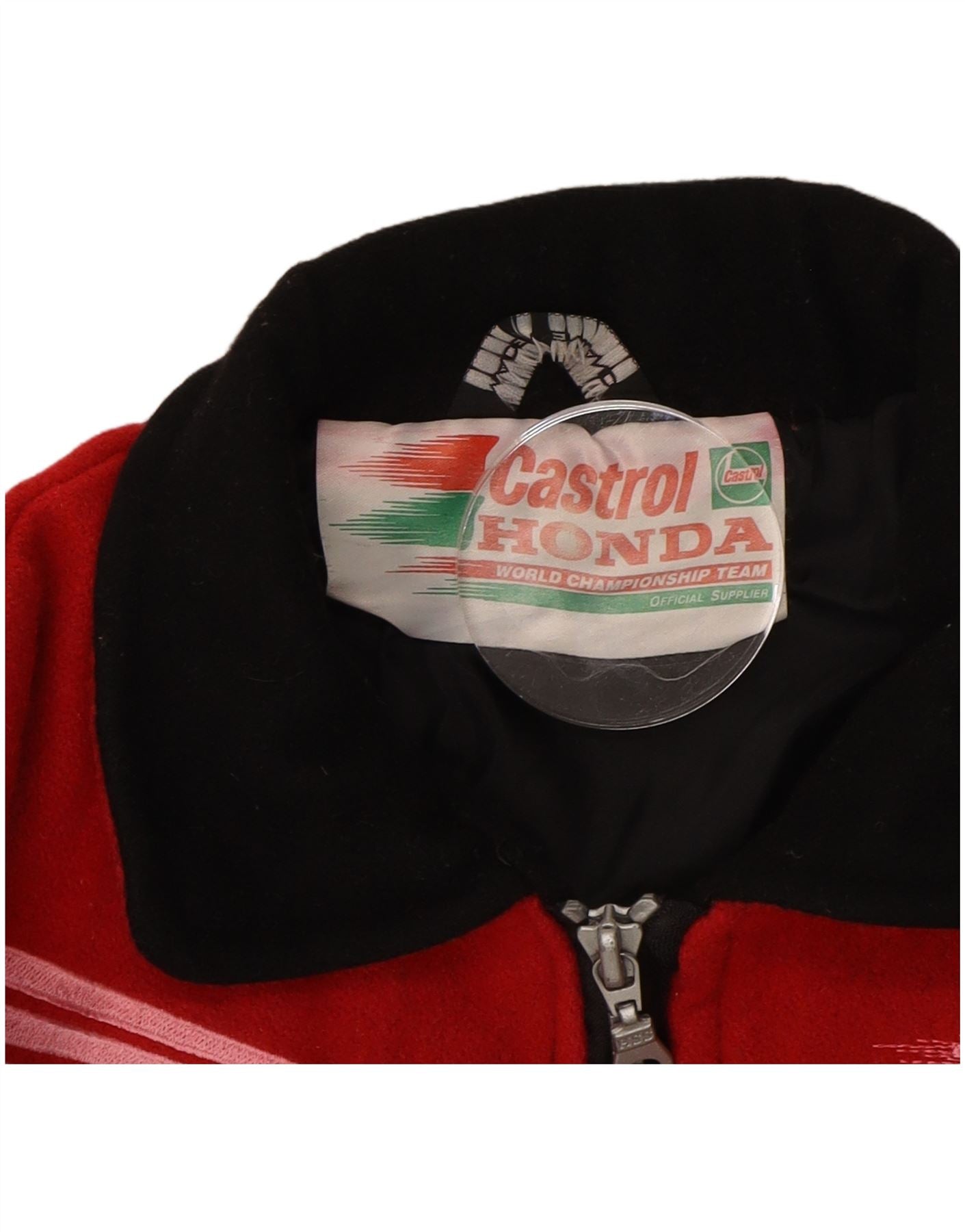 - AI Description: This HONDA girls' Racer Jacket is crafted from 100 percent polyester fleece, offering warmth and a soft texture. It features a striking red, black, multicoloured, and white design with prominent Castrol Honda World Championship Team graphics and logos. The collared neckline and full zip closure provide a classic bomber fit. Long sleeves and a regular fit ensure comfort. Practical pockets add functionality to this stylish motorcycle-inspired piece.