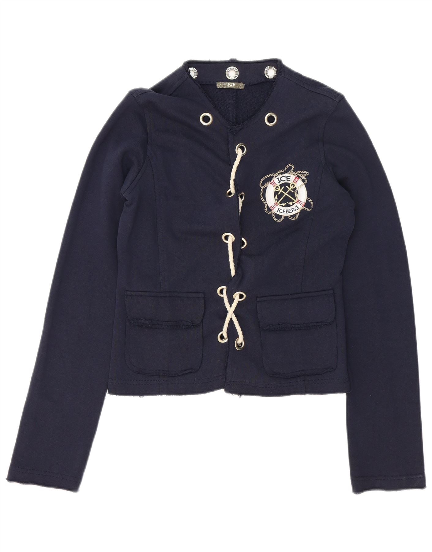 ICEBERG Womens Front Tie Blazer Jacket IT 46 Large Navy Blue Cotton
