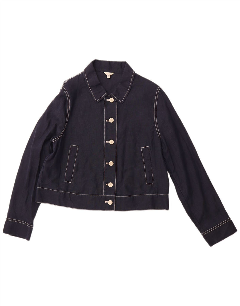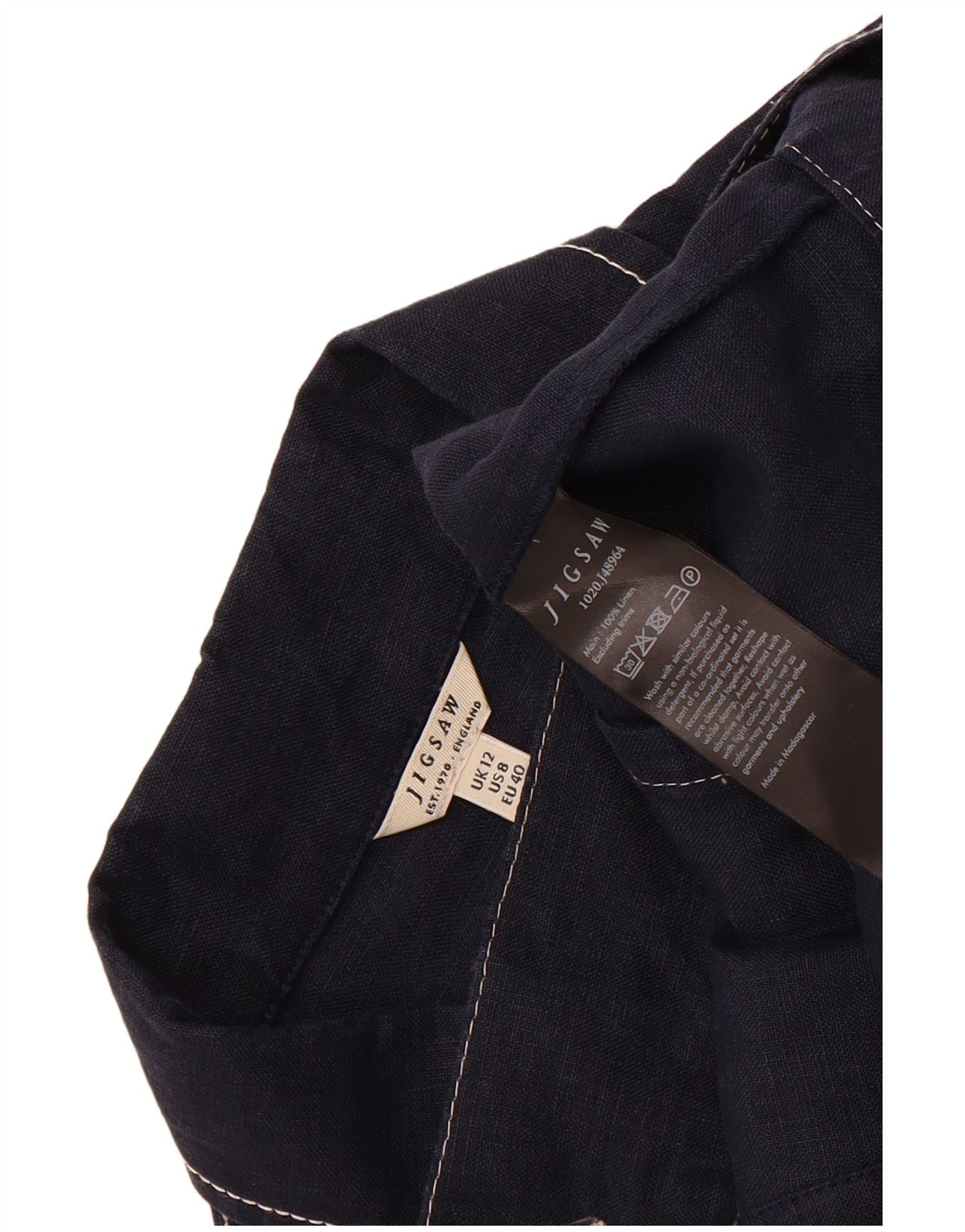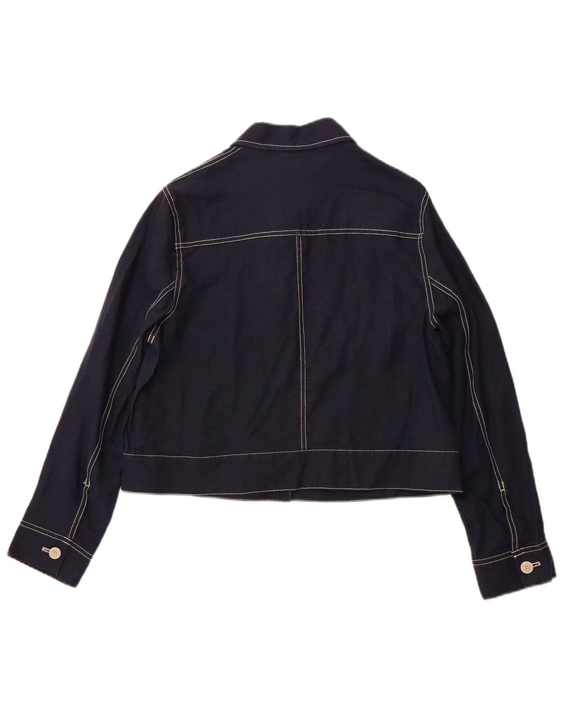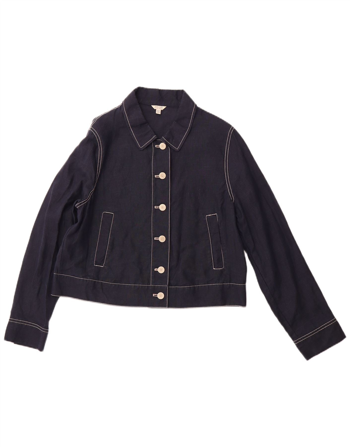 - AI Description: This Jigsaw womens jacket is crafted from 100 percent woven linen in a rich navy blue. It features a classic collared neckline and long sleeves. The front is secured with a six button closure. Practical pockets add functional detail. A regular fit ensures comfortable wear and a timeless silhouette. This classic style offers versatile elegance for any occasion.