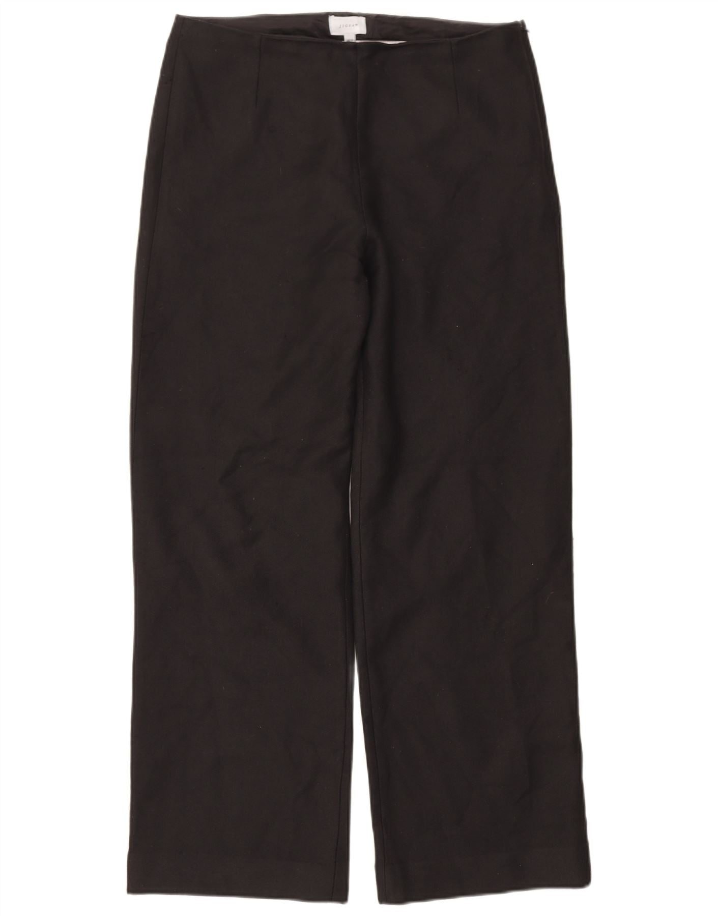 - AI Description: These Jigsaw women's cropped trousers are crafted from a luxurious virgin wool blend, offering a soft feel with natural stretch. The pull-on design features an elasticated waist for comfort and a smooth silhouette. They boast a regular fit, tapering to a contemporary cropped length. Presented in classic black, these trousers are versatile and refined, perfect for smart casual wear.