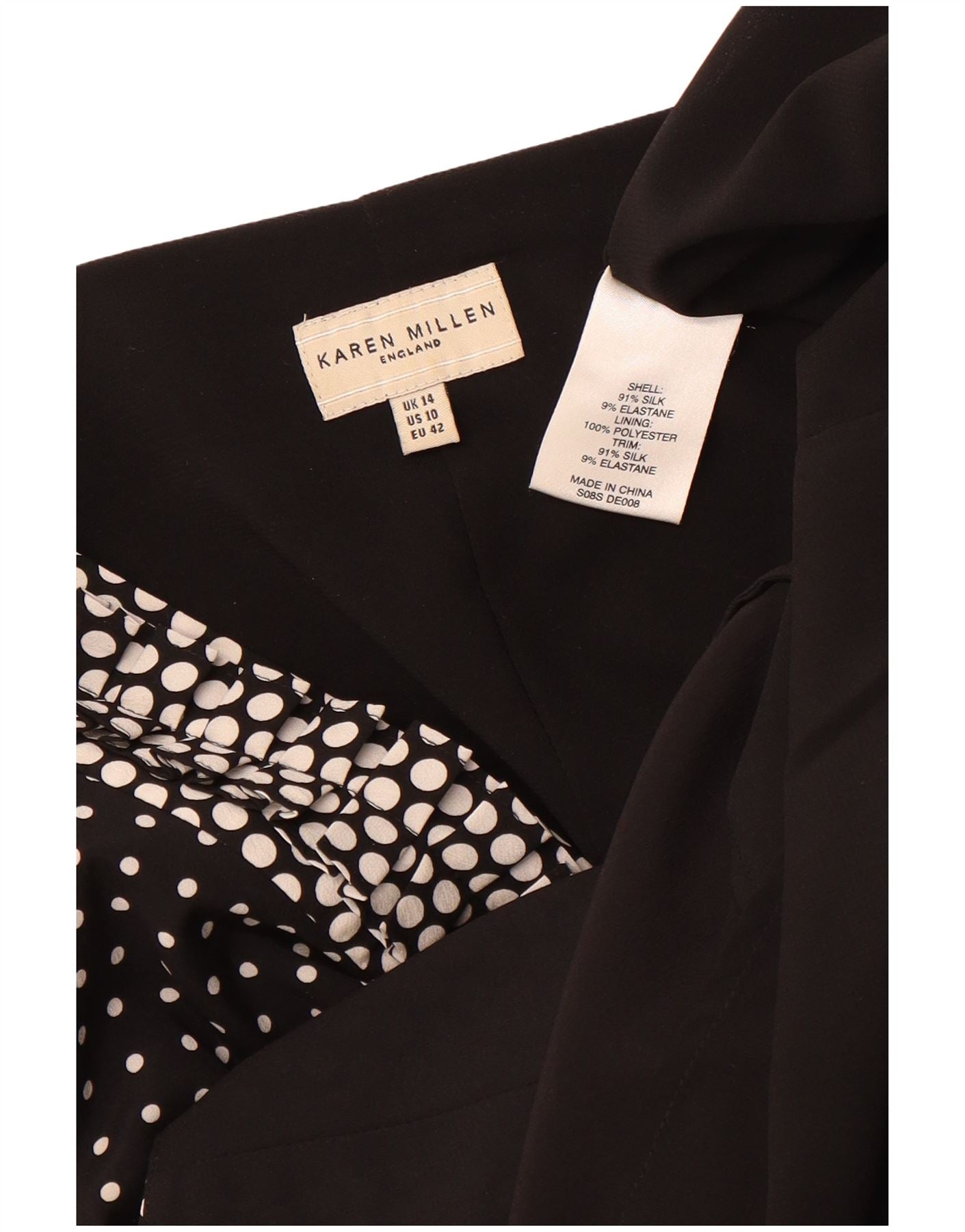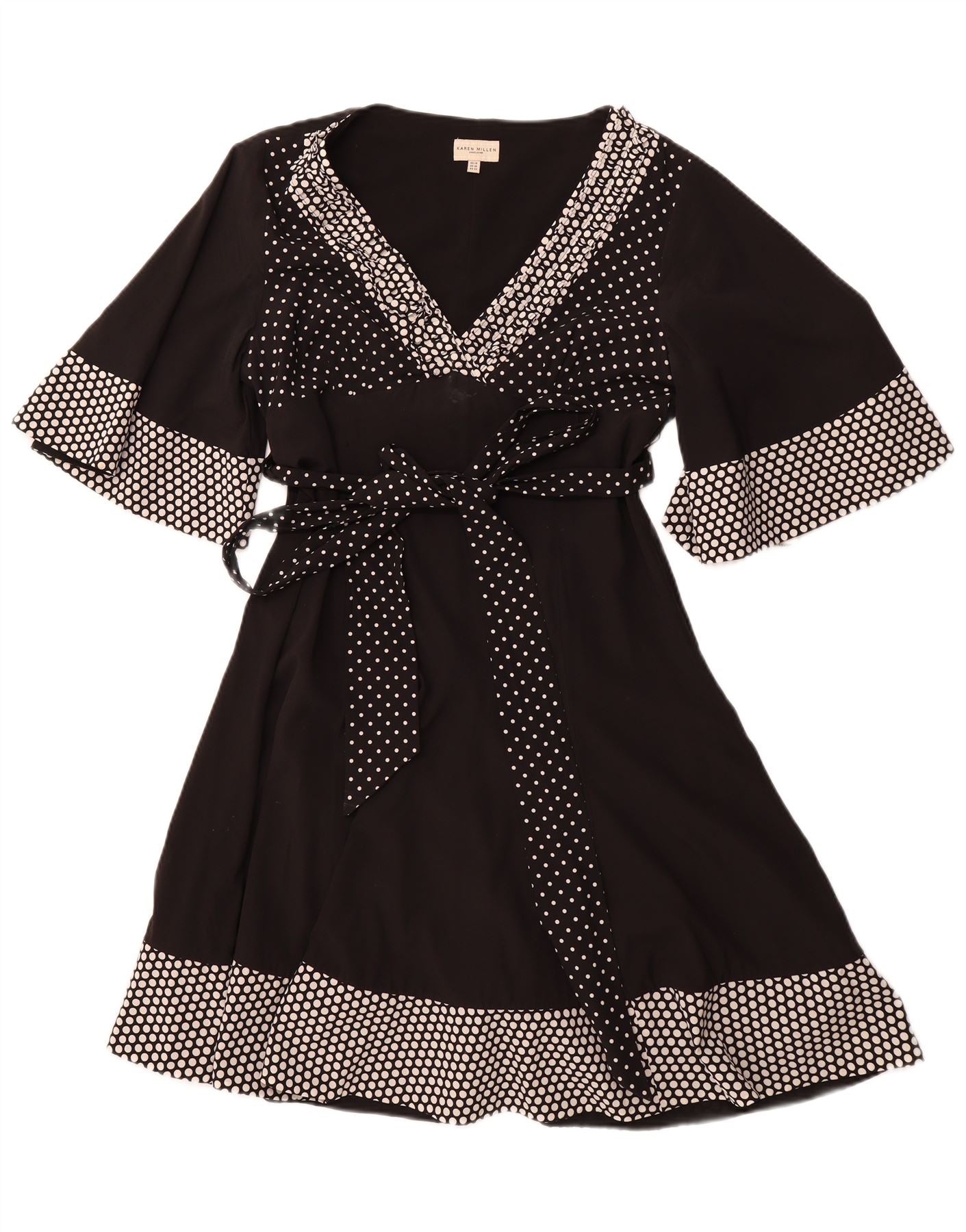 - AI Description: This Karen Millen womens wrap dress is crafted from a luxurious silk blend fabric, offering a smooth, elegant drape. It features a classic polka dot pattern against a sophisticated black background. The V-neckline and 3/4 sleeves provide a refined silhouette. An empire waist with a front tie closure accentuates the figure. Subtle ruffle detailing adds a feminine touch. The regular fit ensures comfortable wear with timeless style.