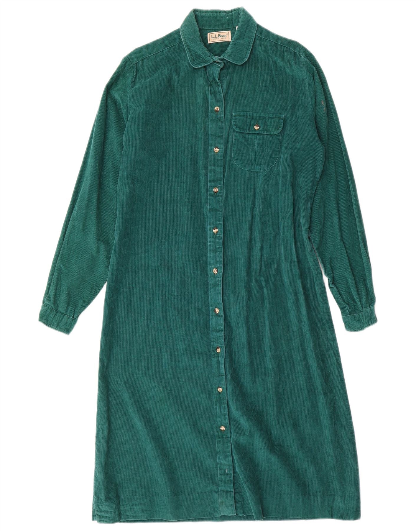 - AI Description: This L.L.Bean womens shirt dress is crafted from soft green corduroy, offering a rich, textured feel. It features a classic collared neckline and a full button-up front. Long sleeves provide warmth, while the regular fit ensures comfortable wear. Practical pockets add functionality. The button accents complete its timeless, classic style.