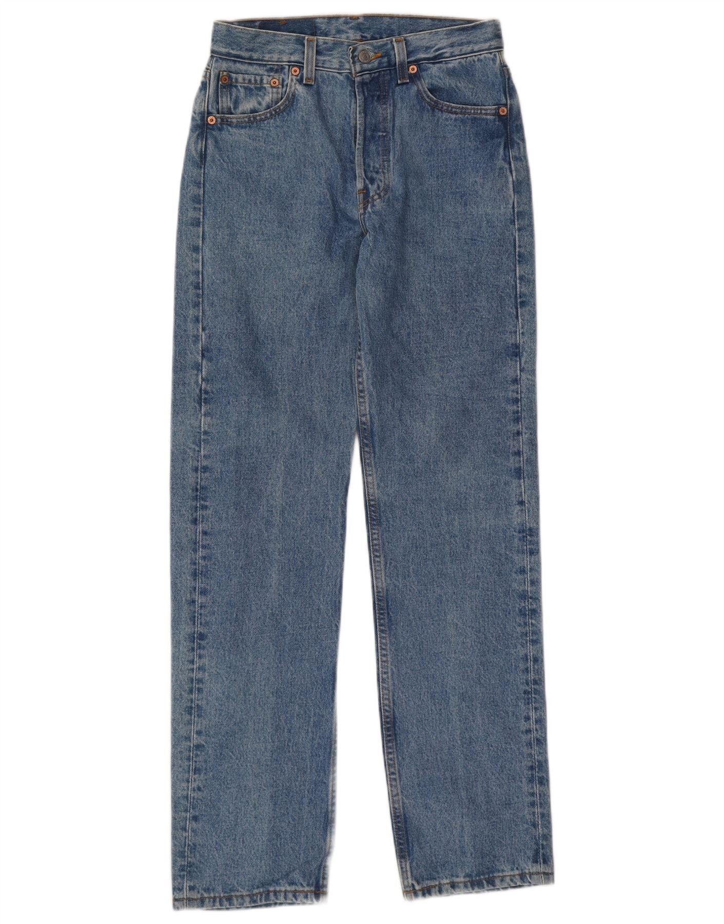- AI Description: This Levi's women's 501 straight jeans are crafted from durable blue cotton denim. They feature a classic mid-rise waist and a button closure. The straight leg cut offers a timeless, regular fit. Practical pockets and a subtle brand logo complete the design. This iconic style provides enduring comfort and versatility for everyday wear.