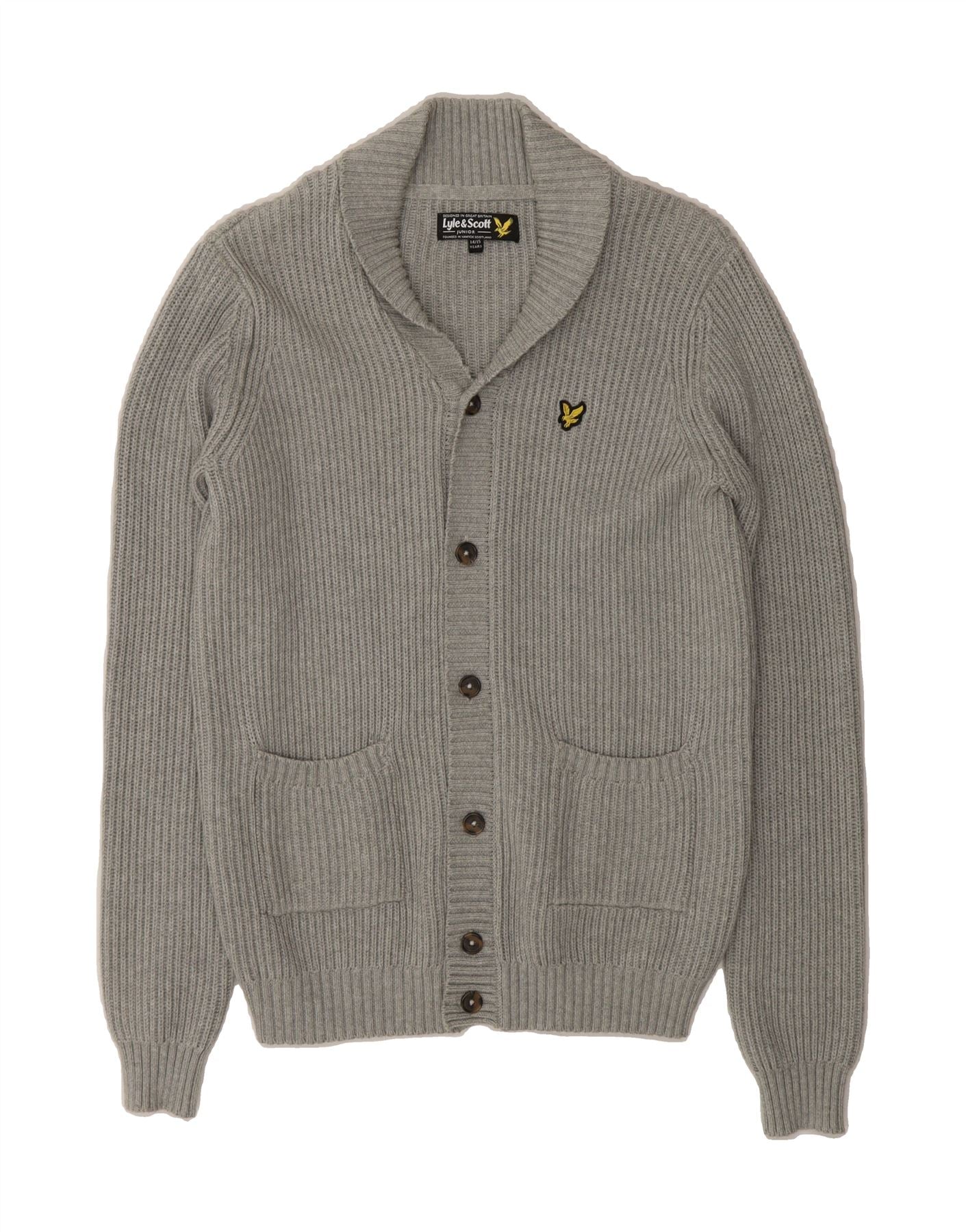 - AI Description: This pre-owned Lyle & Scott boys' cardigan sweater is crafted from 100% cotton knit. In excellent condition, the grey, long-sleeved cardigan features a collared neckline and button closure. Accented with buttons and the brand's logo, it offers a regular fit with practical pockets. The garment, labelled size 14/15 years, embodies a preppy style. Made in Great Britain.
