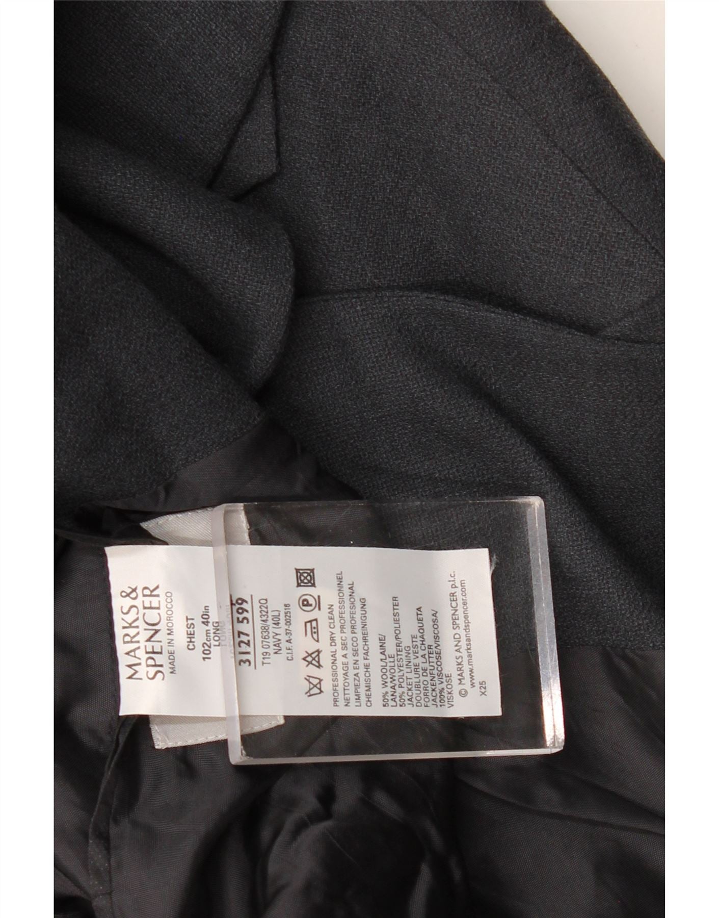 - Περιγραφή AI: Αυτό το ανδρικό σακάκι 2 τεμαχίων Marks & Spencer παρουσιάζεται σε ένα εκλεπτυσμένο μείγμα από μαλλί μπλε navy. Διαθέτει κλασική λαιμόκοψη με γιακά και μπροστινό κούμπωμα με δύο κουμπιά. Τα μακριά μανίκια και η κανονική εφαρμογή παρέχουν μια άνετη, παραδοσιακή σιλουέτα. Οι πρακτικές τσέπες είναι ενσωματωμένες στο σχέδιο. Αυτό το σακάκι προσφέρει διαχρονικό στυλ και επαγγελματικό φινίρισμα, ιδανικό για επίσημο ντύσιμο.