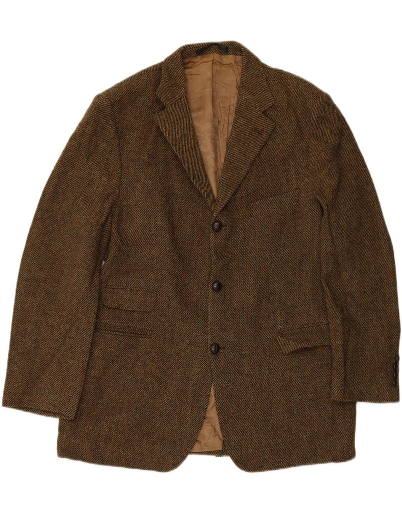 - AI Description: This Marks & Spencer mens Blazer Jacket is crafted from rich Harris Tweed pure new wool. Its flecked brown weave offers a distinctive texture. The classic fit features a collared neckline and long sleeves. A three-button closure secures the front. It is fully lined for comfort and structure. Practical pockets complete the design. This timeless piece exudes sophisticated British style.