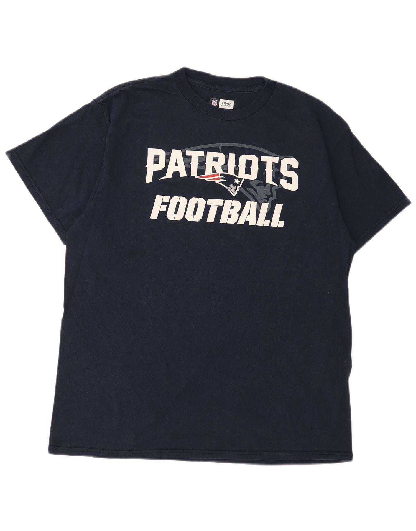 - AI Description: This NFL Team Apparel mens Graphic T-Shirt Top is crafted from soft navy blue jersey fabric. It features a classic round neck and short sleeves. The regular fit ensures comfortable wear. A prominent New England Patriots logo graphic adorns the front. This design celebrates American Football style, perfect for fans of the NFL.