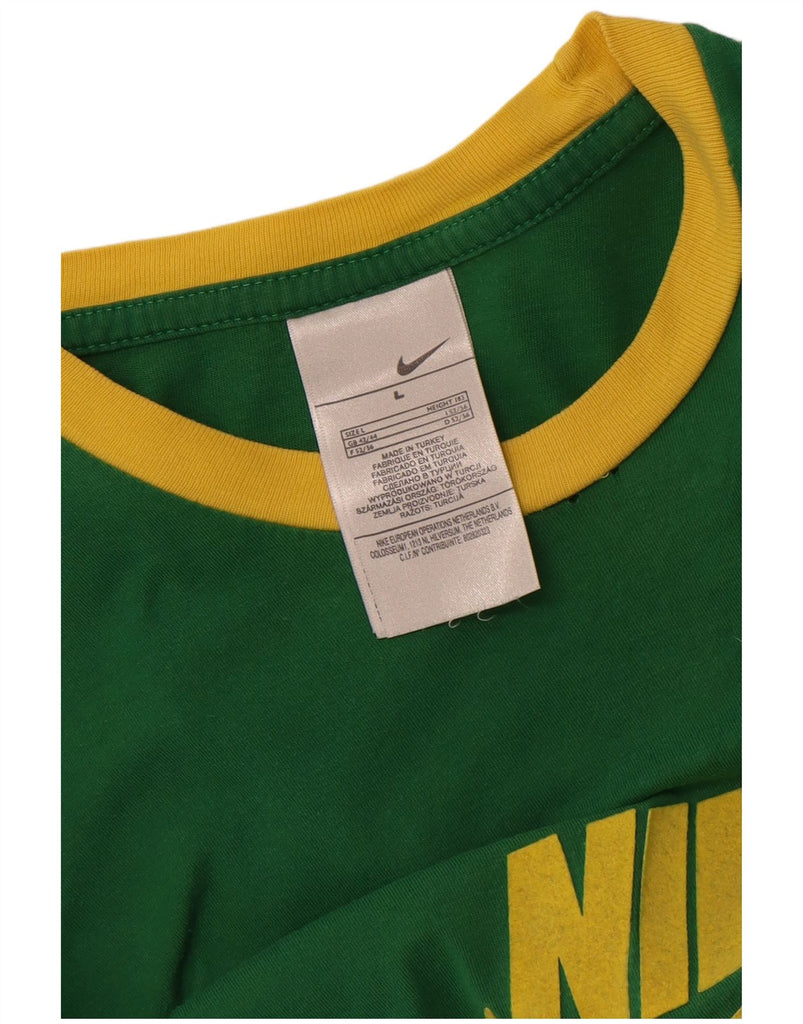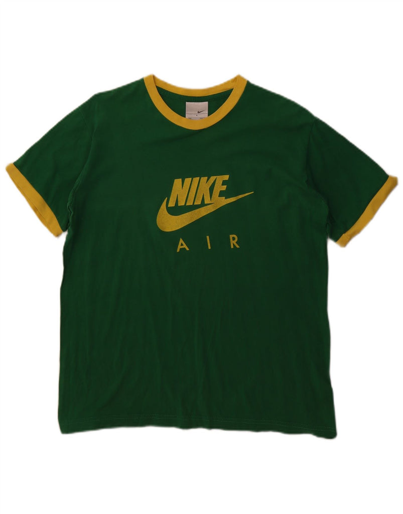 - AI Description: This Nike mens Graphic T-Shirt Top is crafted from soft green jersey fabric. It features a classic round neck and short sleeves. The regular fit ensures comfortable wear. A prominent Nike Air logo accentuates the design. This sports style pullover offers effortless athletic appeal. It is perfect for everyday casual or active use.