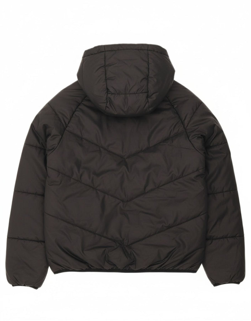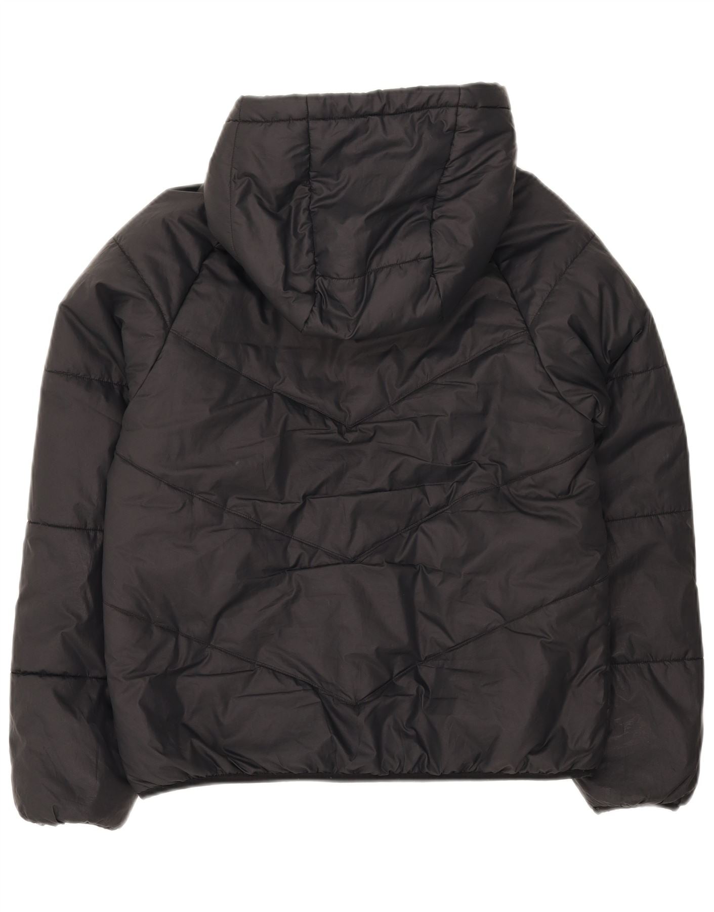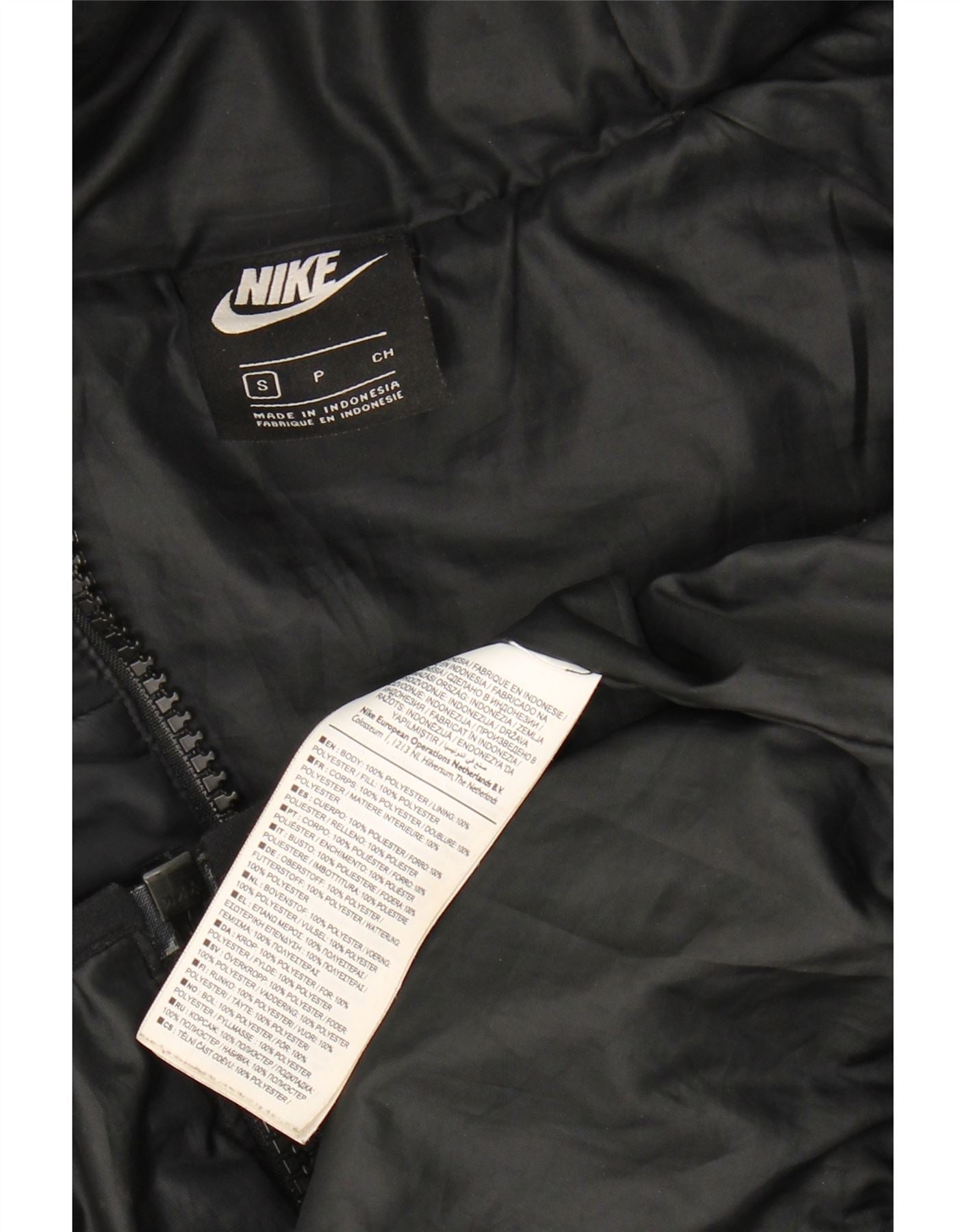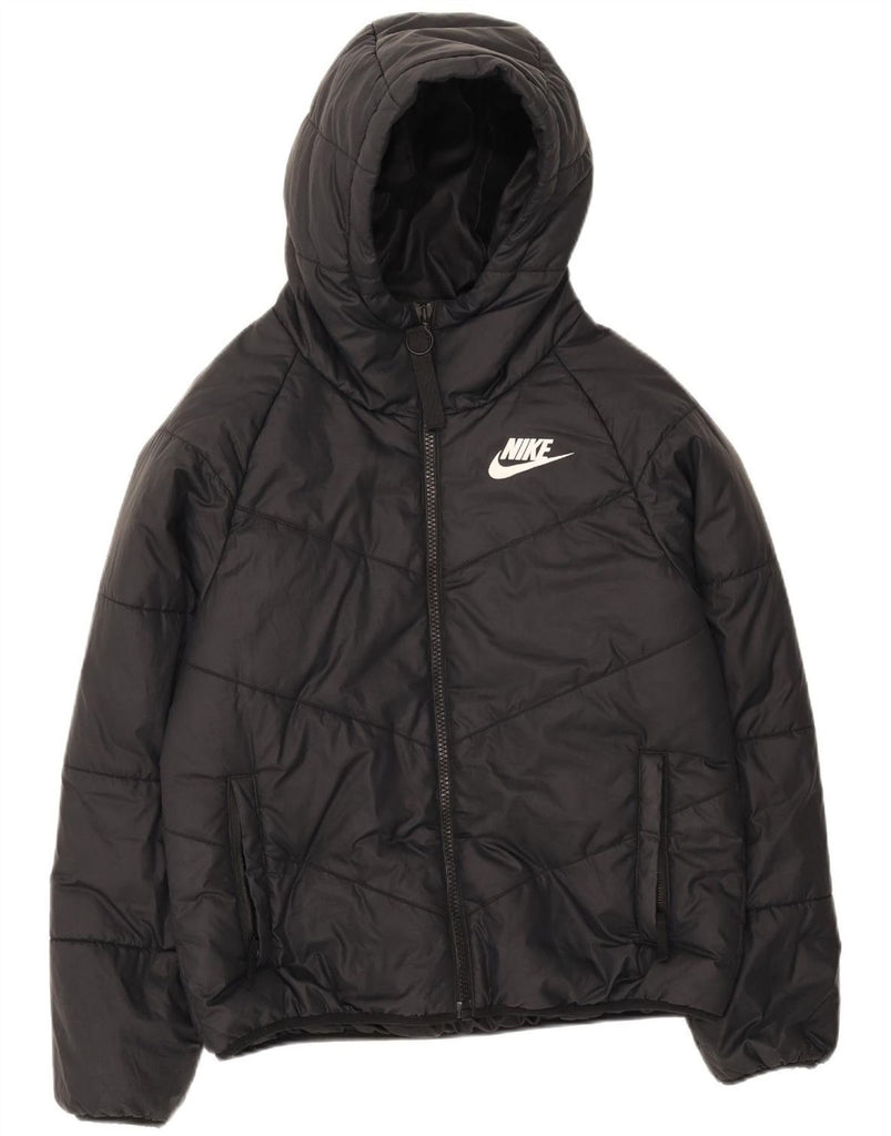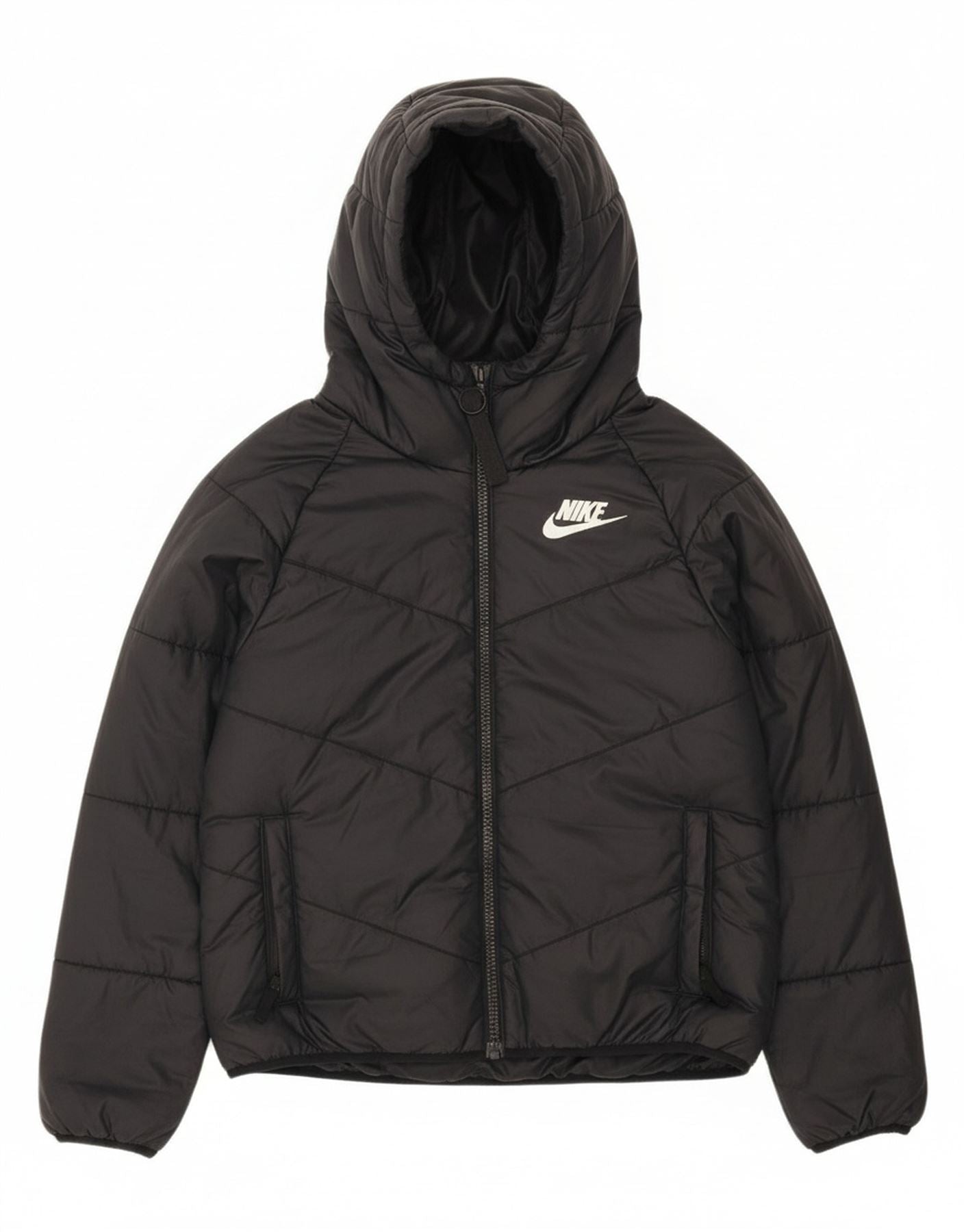 - AI Description: This Nike women's padded jacket is crafted from woven polyester with a smooth finish. It features a regular fit and long sleeves for warmth and comfort. The hooded neckline and zip closure offer practical protection from the elements. Zipped pockets provide secure storage. A logo accent adds a signature touch. The black colour ensures versatile styling.