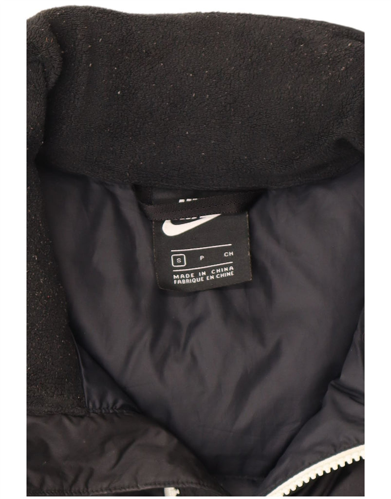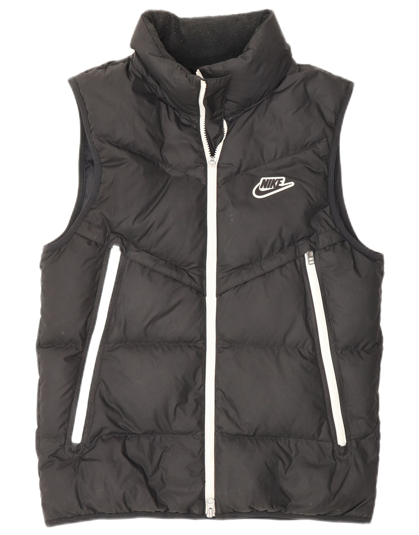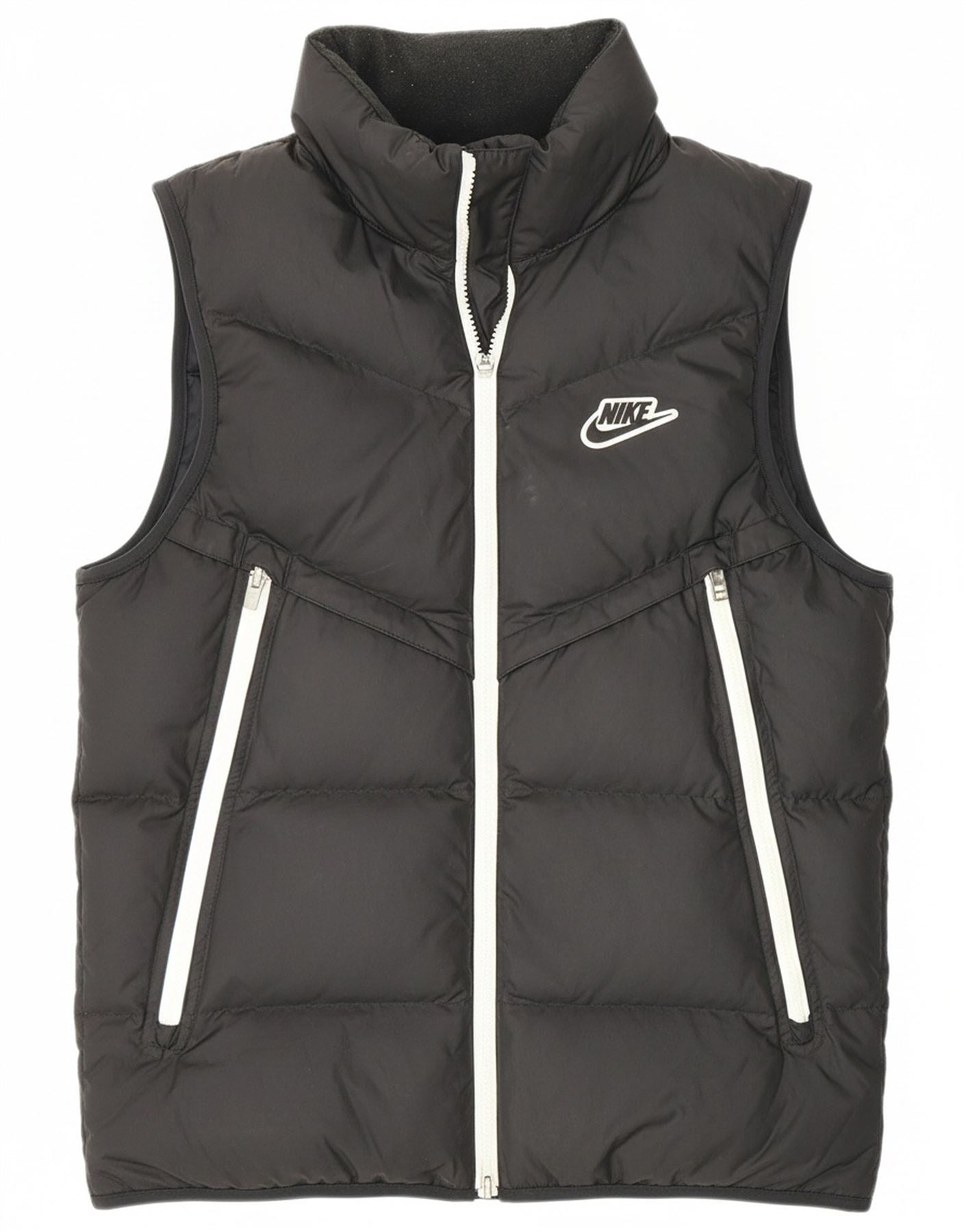 - AI Description: This Nike mens Padded Gilet is crafted from a lightweight, black woven fabric. Its padded design offers thermal comfort without bulk. A high neck and full zip closure provide versatile layering. The sleeveless cut allows for unrestricted movement. Zipped pockets offer secure storage. A subtle Nike logo completes this regular fit, sporty gilet.
