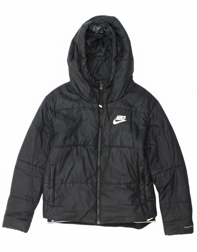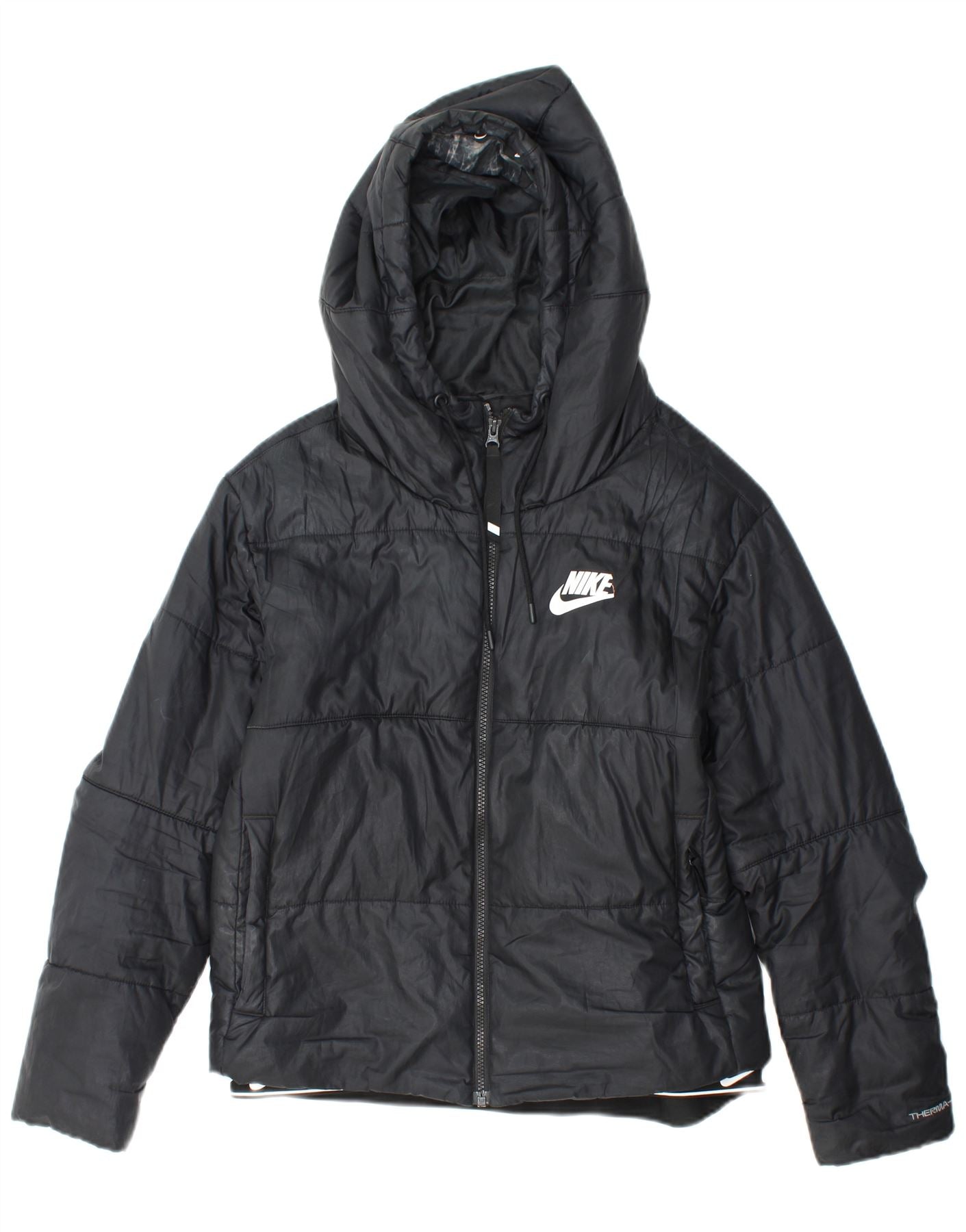- AI Description: This Nike womens padded jacket is crafted from a black woven fabric, offering a smooth, durable finish. Its padded construction provides excellent warmth. It features a practical hooded design and a full zip closure for ease of wear. Long sleeves ensure full coverage, while the regular fit allows for comfortable layering. A subtle logo accent adds a signature touch. THERMA-FIT technology enhances its thermal properties, making it ideal for sports.