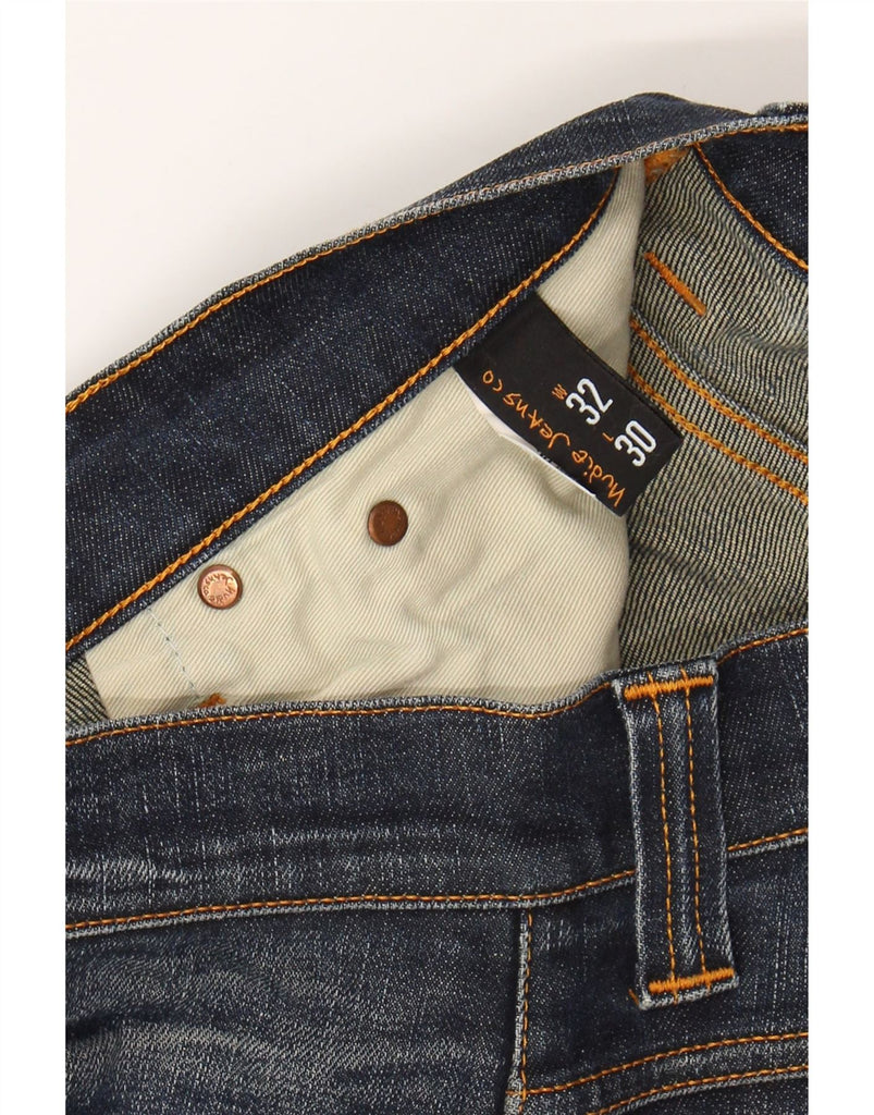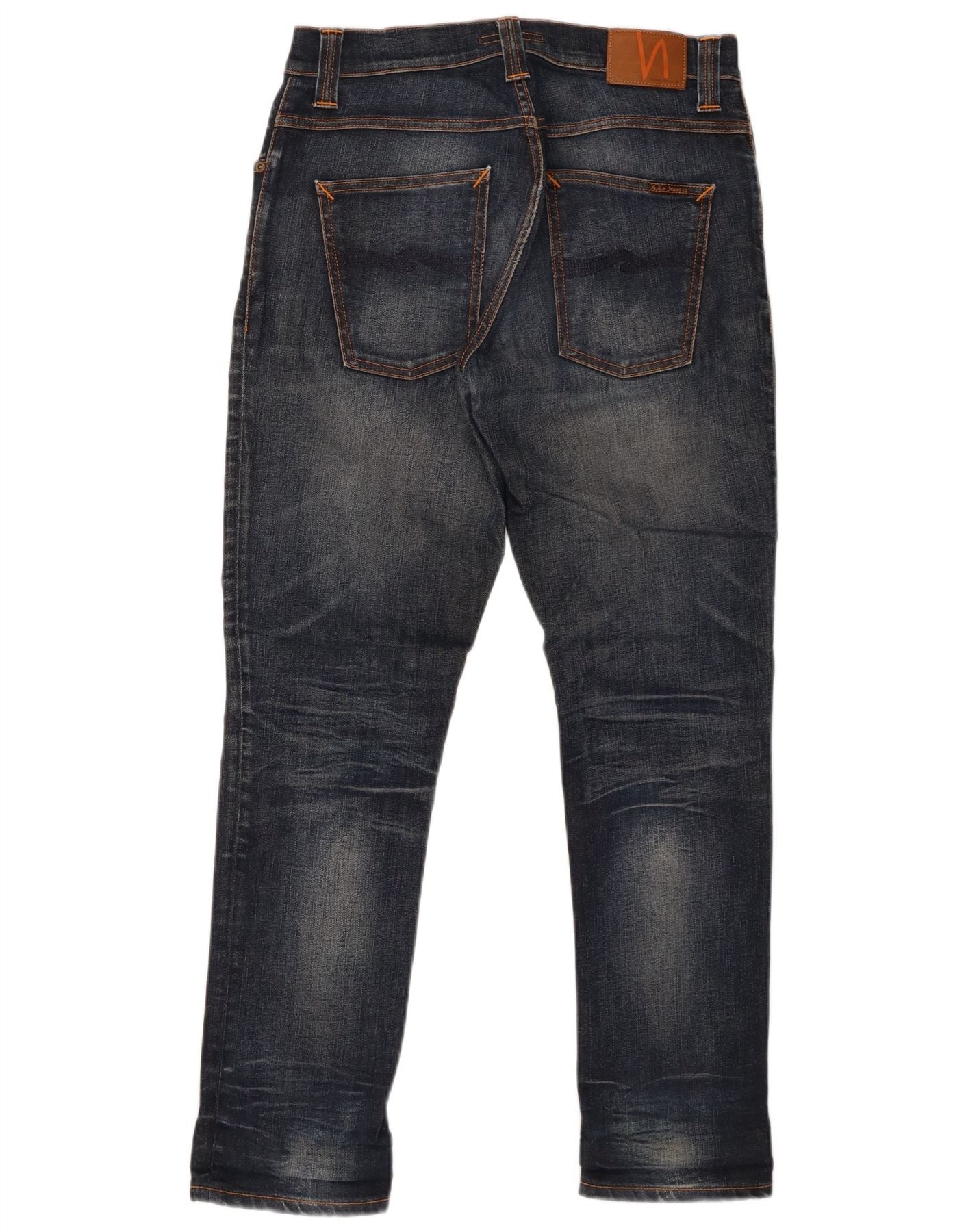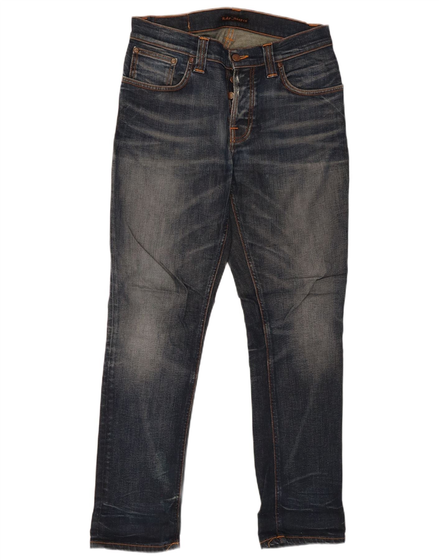 - AI Description: This Nudie Jeans mens straight jeans are crafted from durable blue denim, offering a classic aesthetic. They feature a straight leg and a regular fit, ensuring comfortable, timeless wear. The button closure and fly provide a secure and traditional fastening. Practical pockets are included for everyday utility. This versatile pair embodies a classic style, perfect for various casual ensembles.