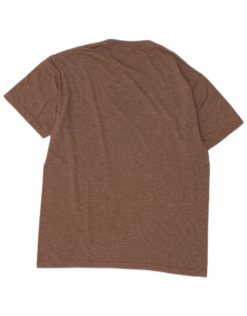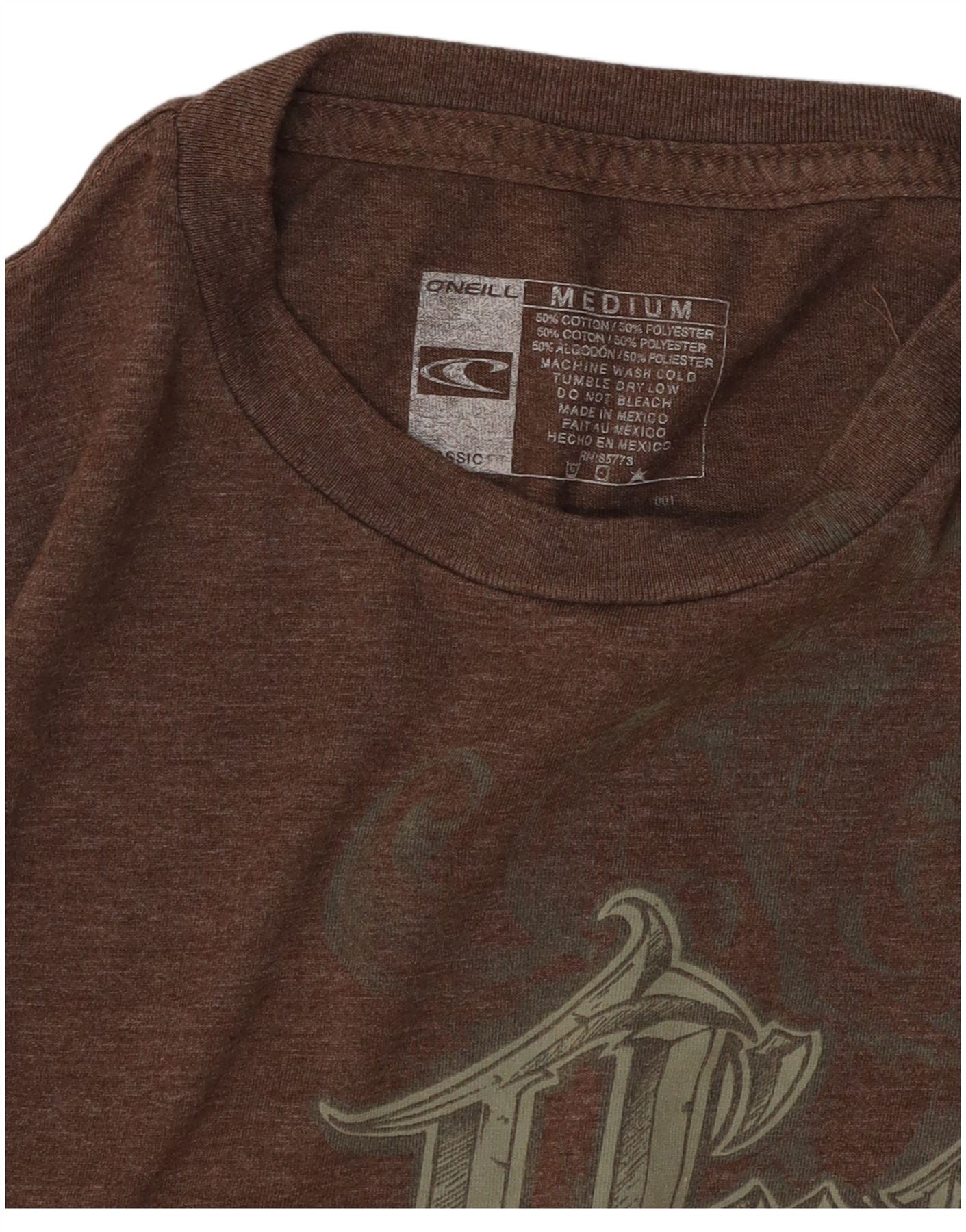 - AI Description: This O'Neill mens Graphic T-Shirt Top is crafted from a soft brown cotton polyester blend jersey fabric. It features a classic round neck and short sleeves. The pullover design offers a comfortable regular fit. A distinctive logo accent adds a retro touch to the front. This top combines comfort with a timeless style, perfect for everyday wear.