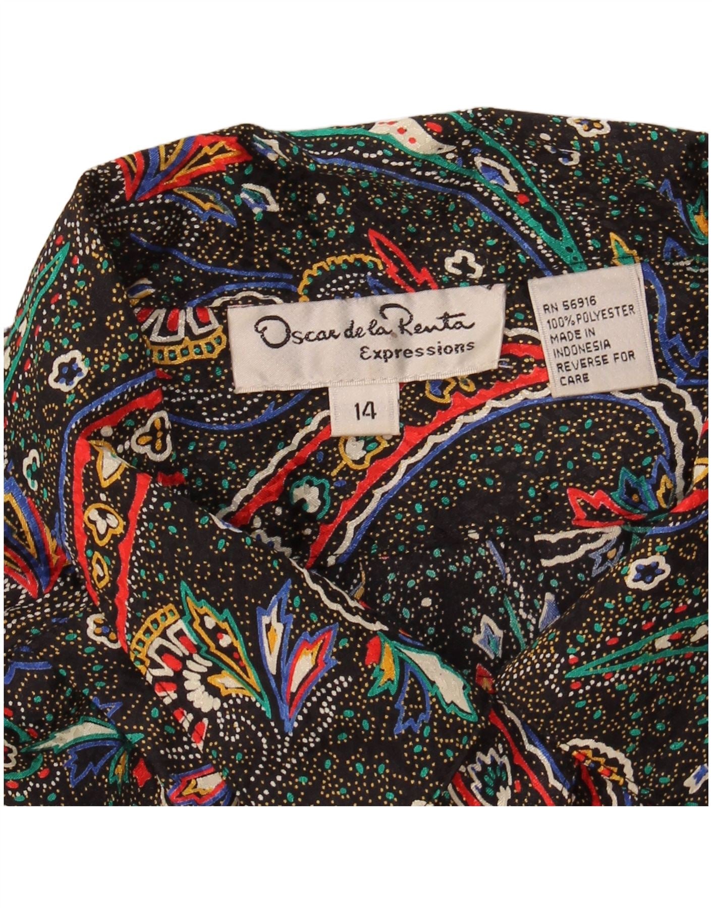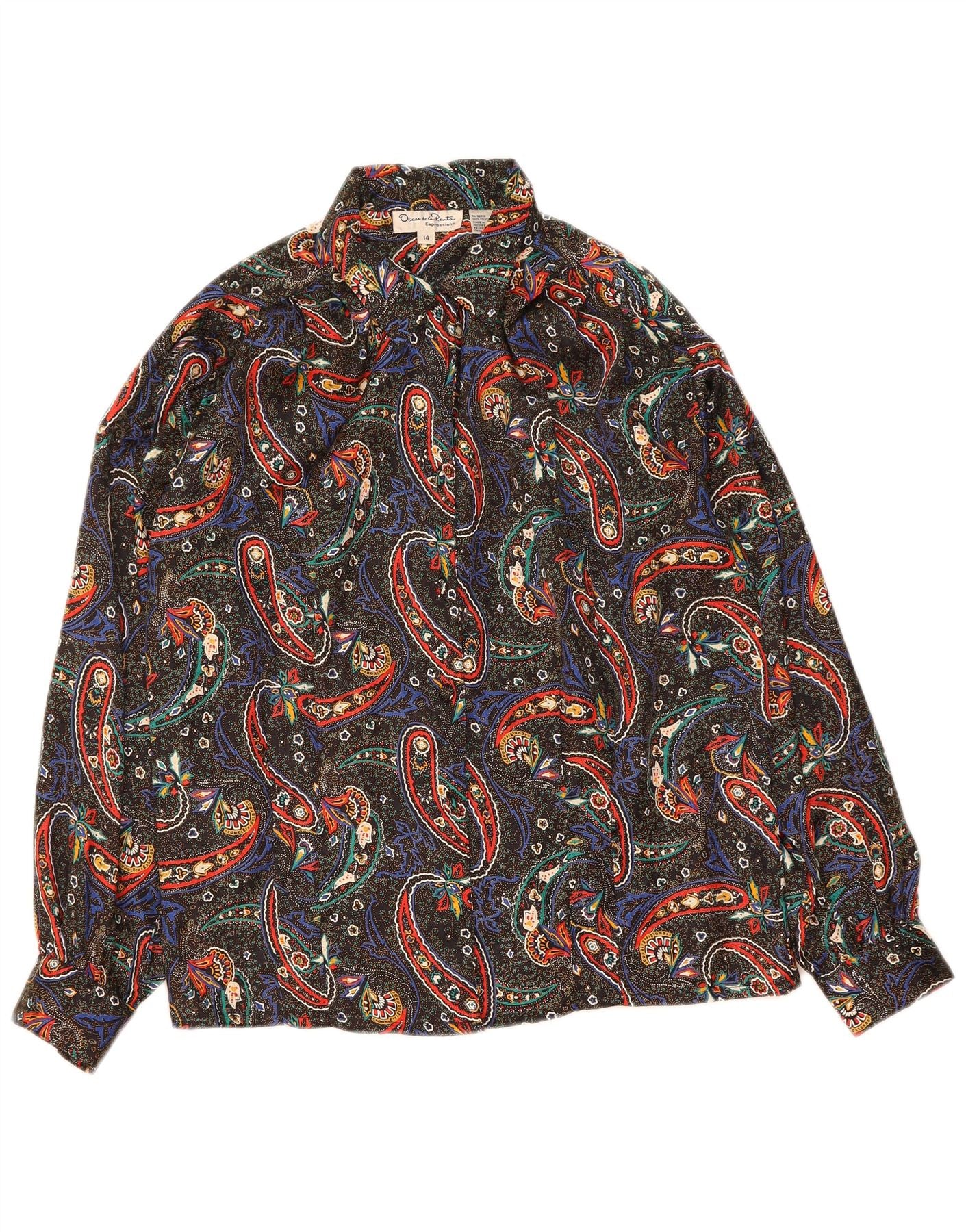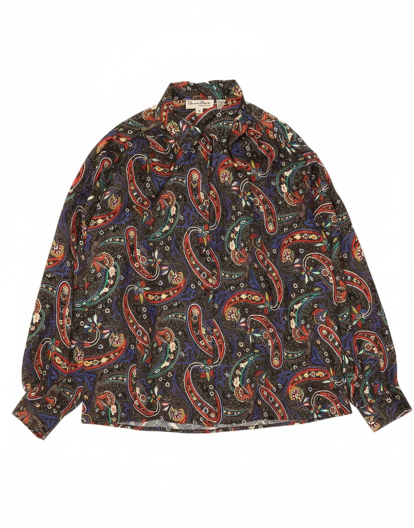 - AI Description: This Oscar De La Renta womens blouse top is crafted from 100 percent polyester with a woven texture. It features a striking multicoloured paisley and abstract pattern. The collared neckline and long sleeves offer a refined silhouette. A button closure ensures a neat finish. This regular fit blouse combines classic style with vibrant visual interest.