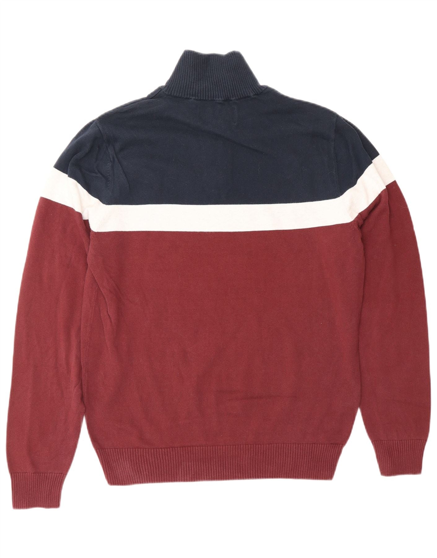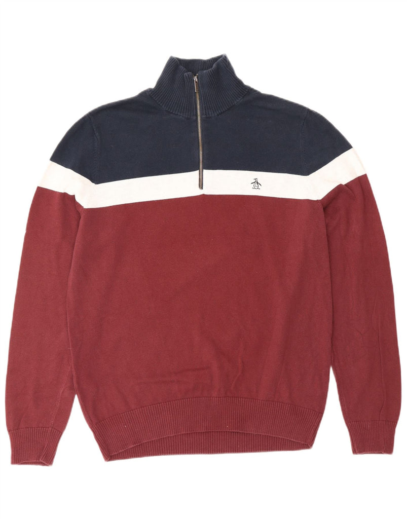 PENGUIN Mens Zip Neck Jumper Sweater Medium Burgundy Colourblock Cotton